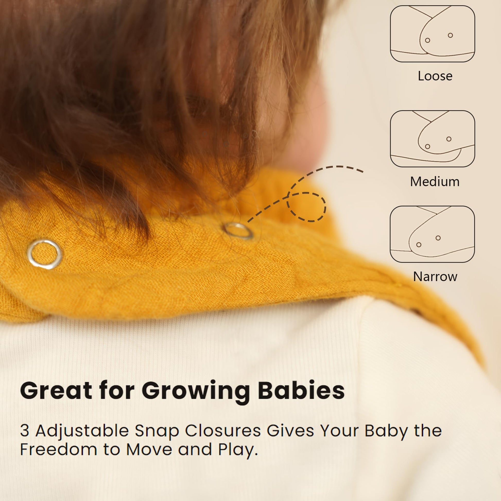 The three-size adjustment accommodates various baby neck sizes.
