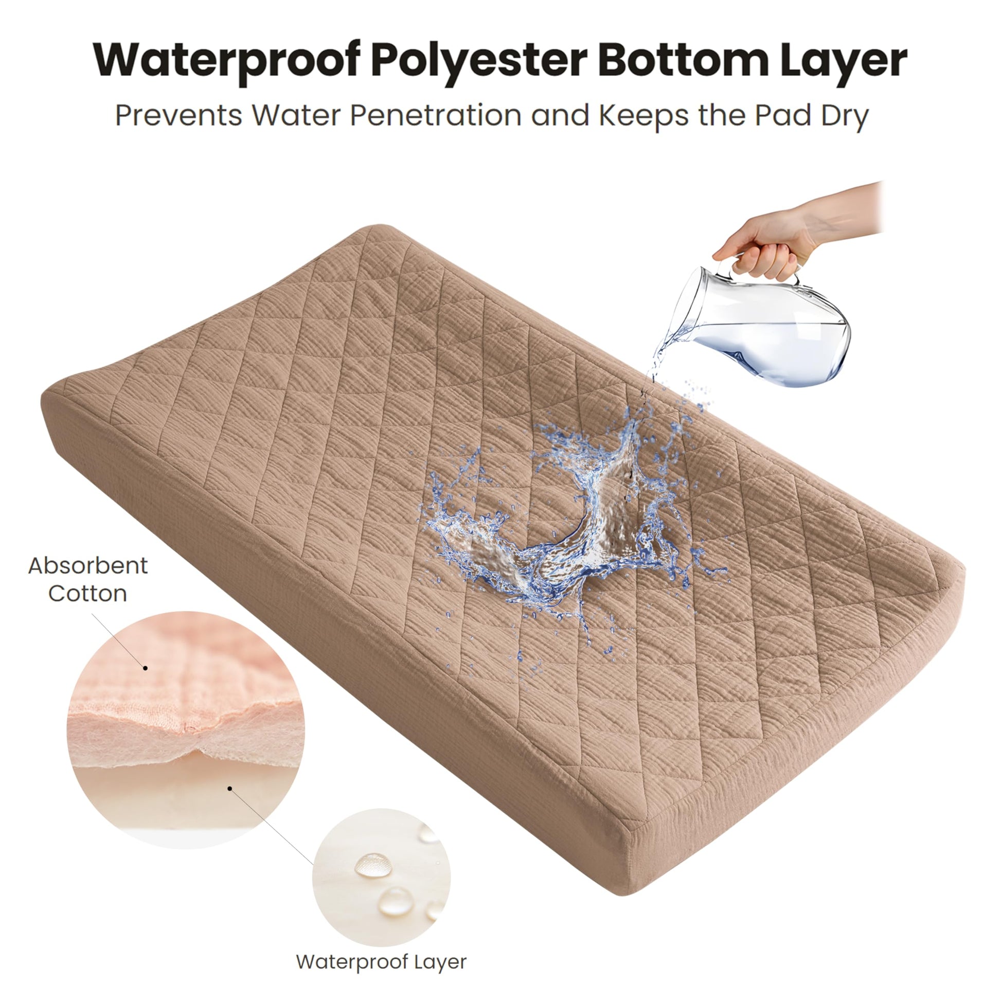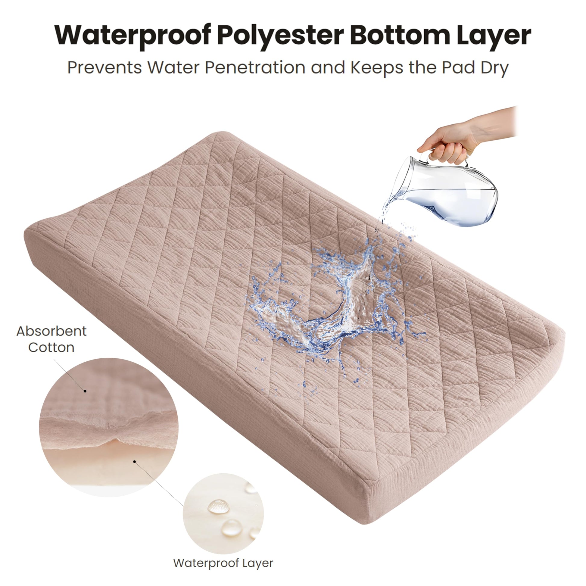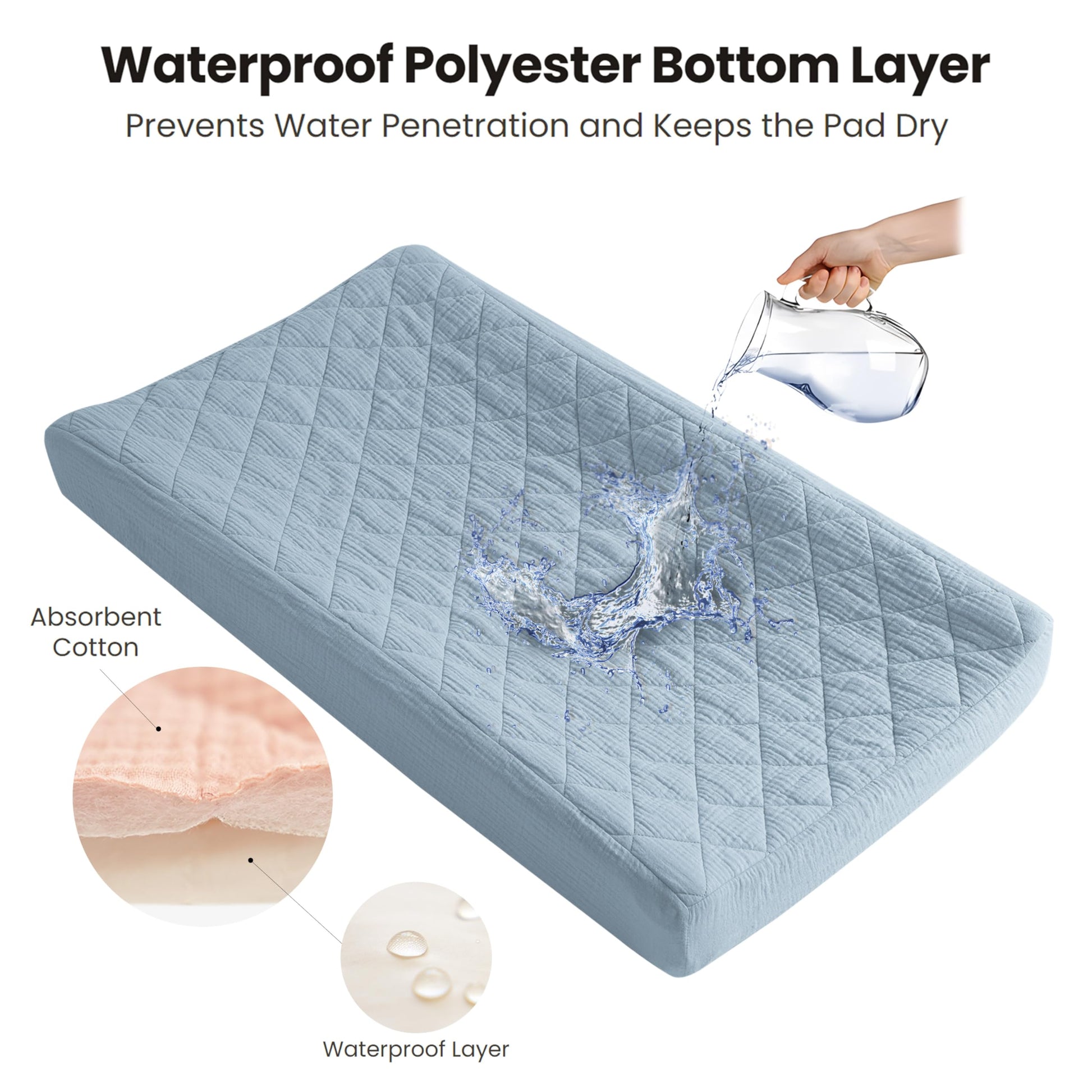 - Quilted and Soft Fabric: Our changing pad cover consists of three layers: the top layer is made of 100% cotton (muslin), which is soft and absorbent; the middle layer is quilted with soft padding to ensure coziness and comfort; and the bottom layer is made of 100% waterproof polyester to protect the pad from wetting. Our unique design provides a comfortable touch for your baby while ensuring waterproof functionality, making our changing pad soft and perfect for delicate baby skin.