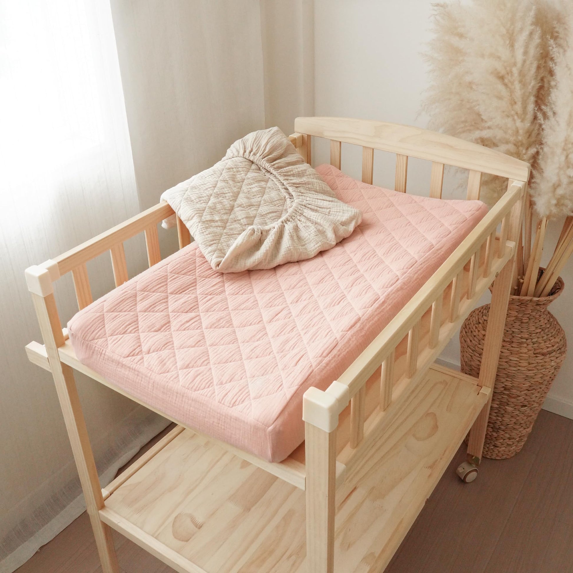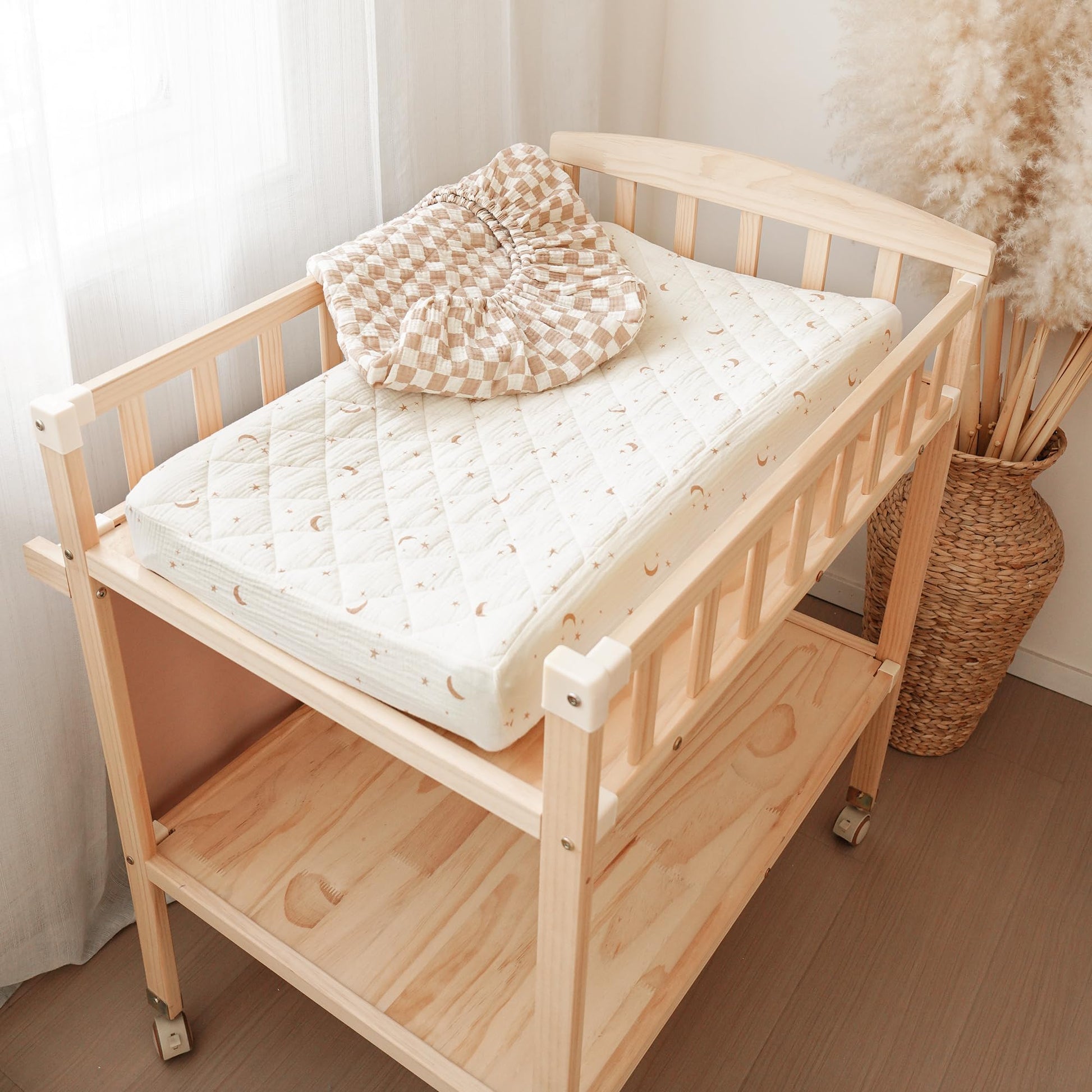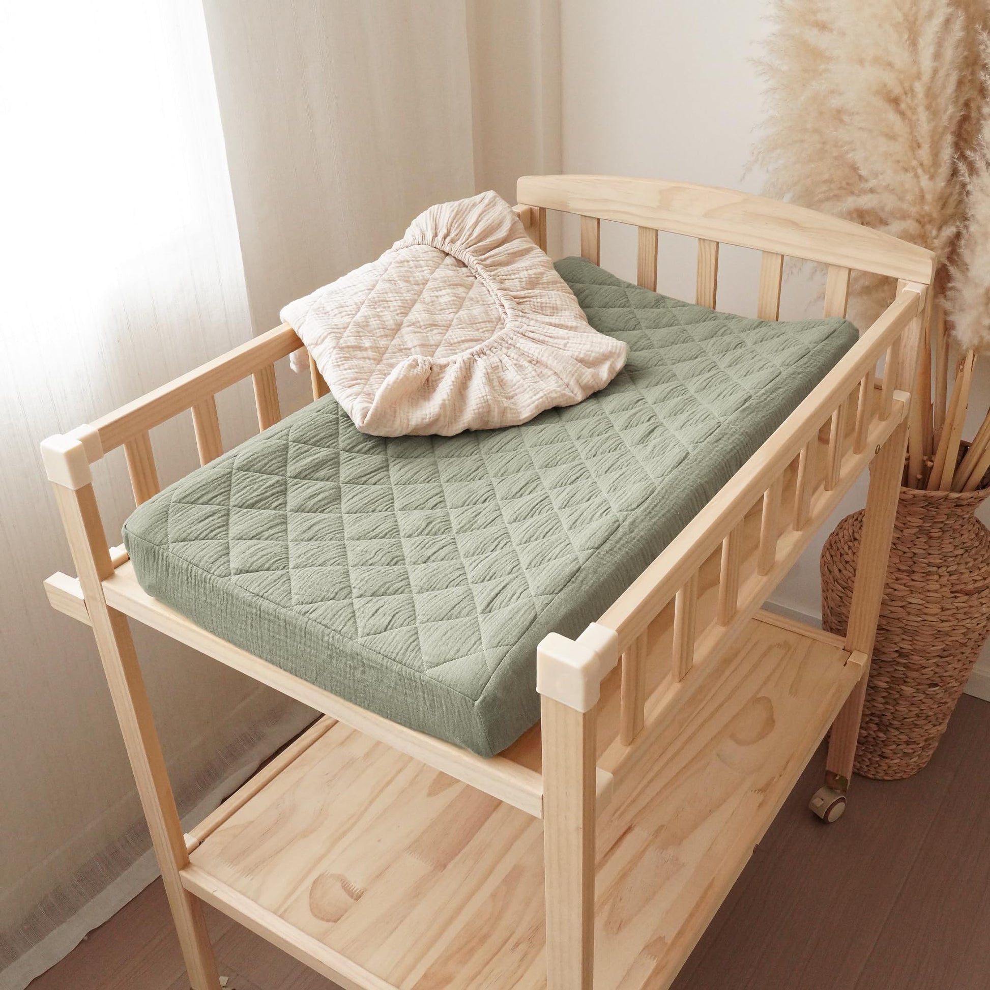 Our changing pad cover is made of 100% muslin cotton surface, which makes our changing pad soft and comfortable to touch, especially perfect for baby delicate skin. The quilted design increases airflow for added comfort.
