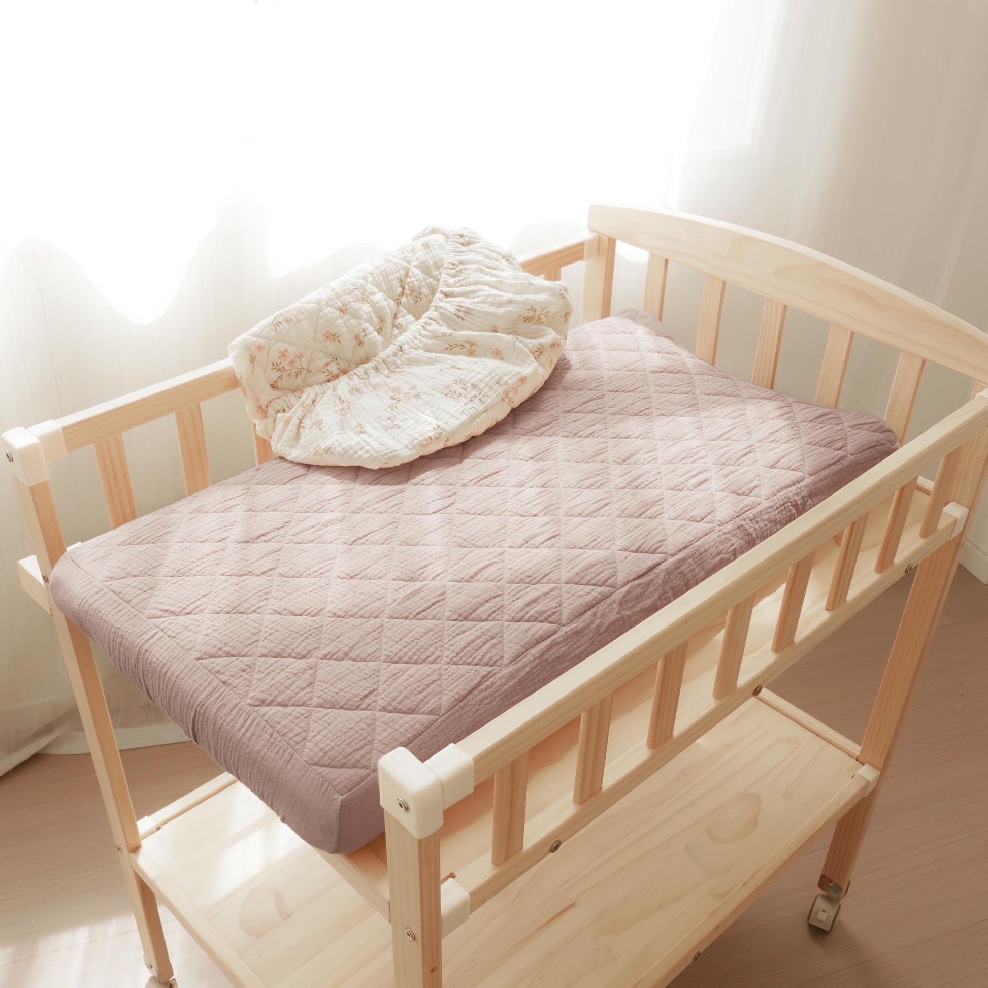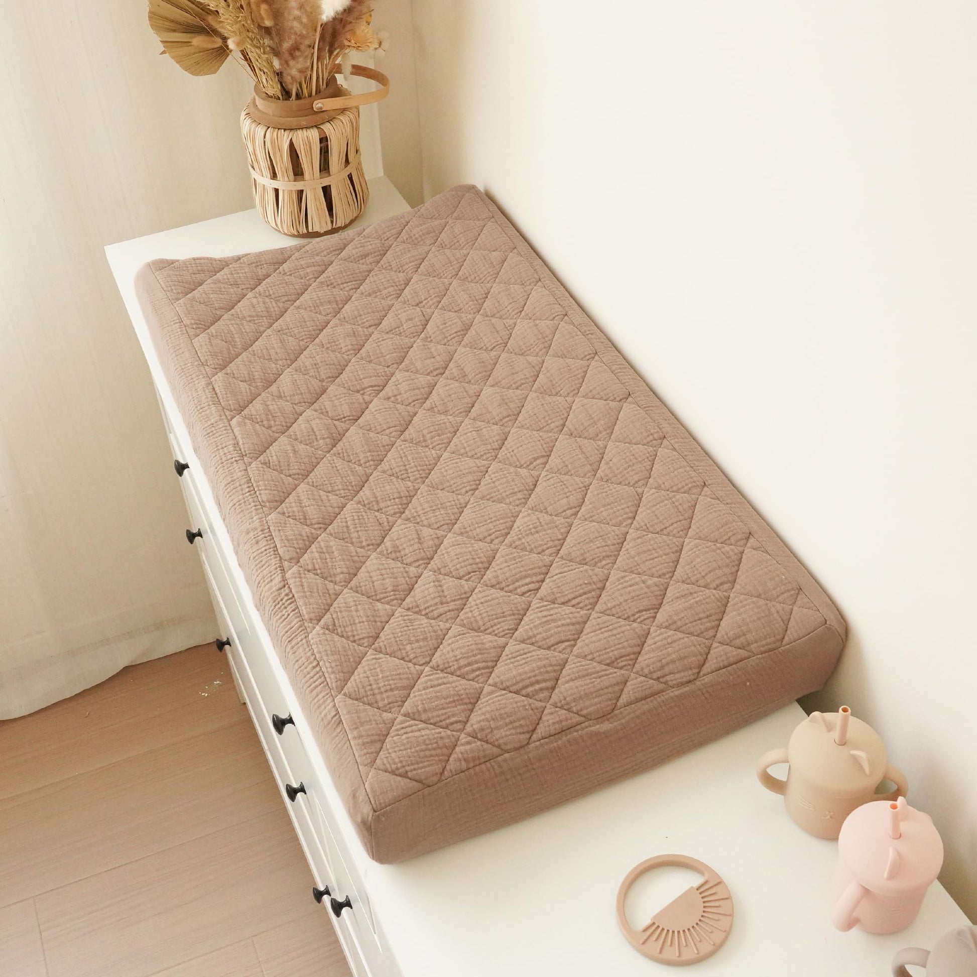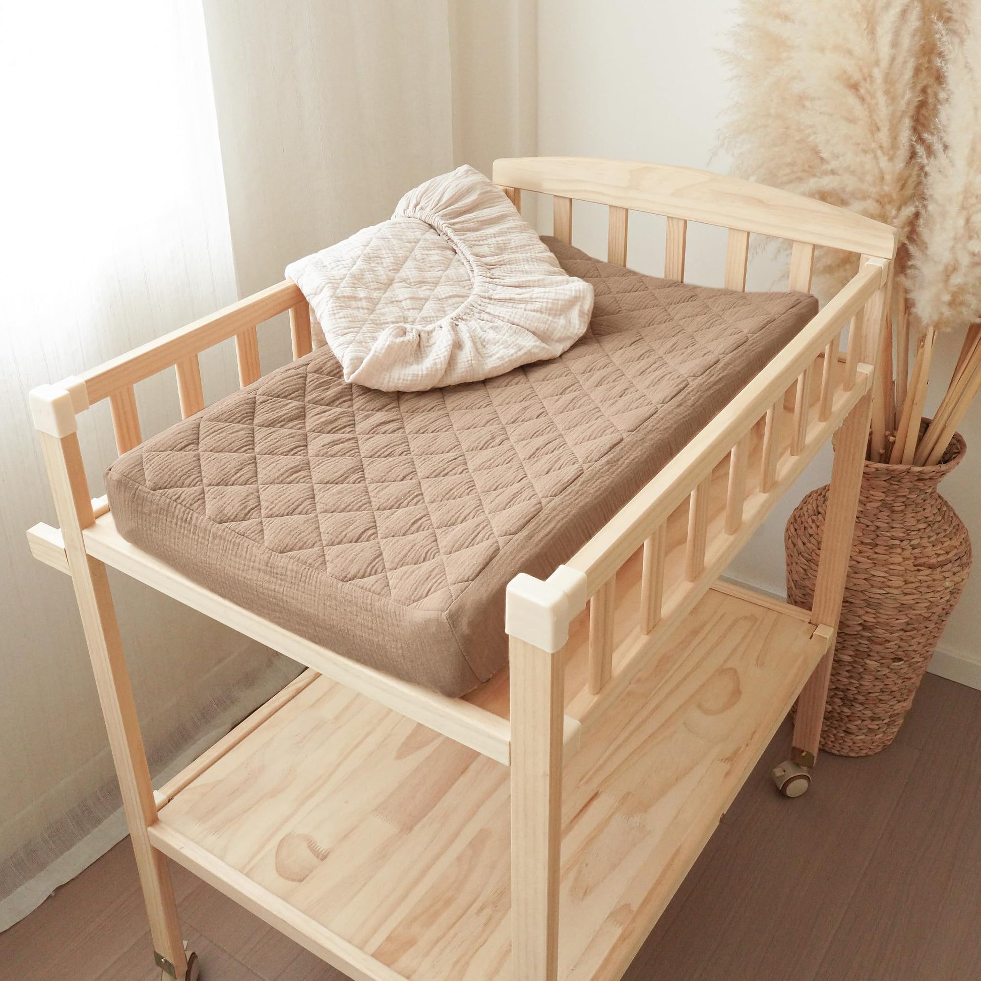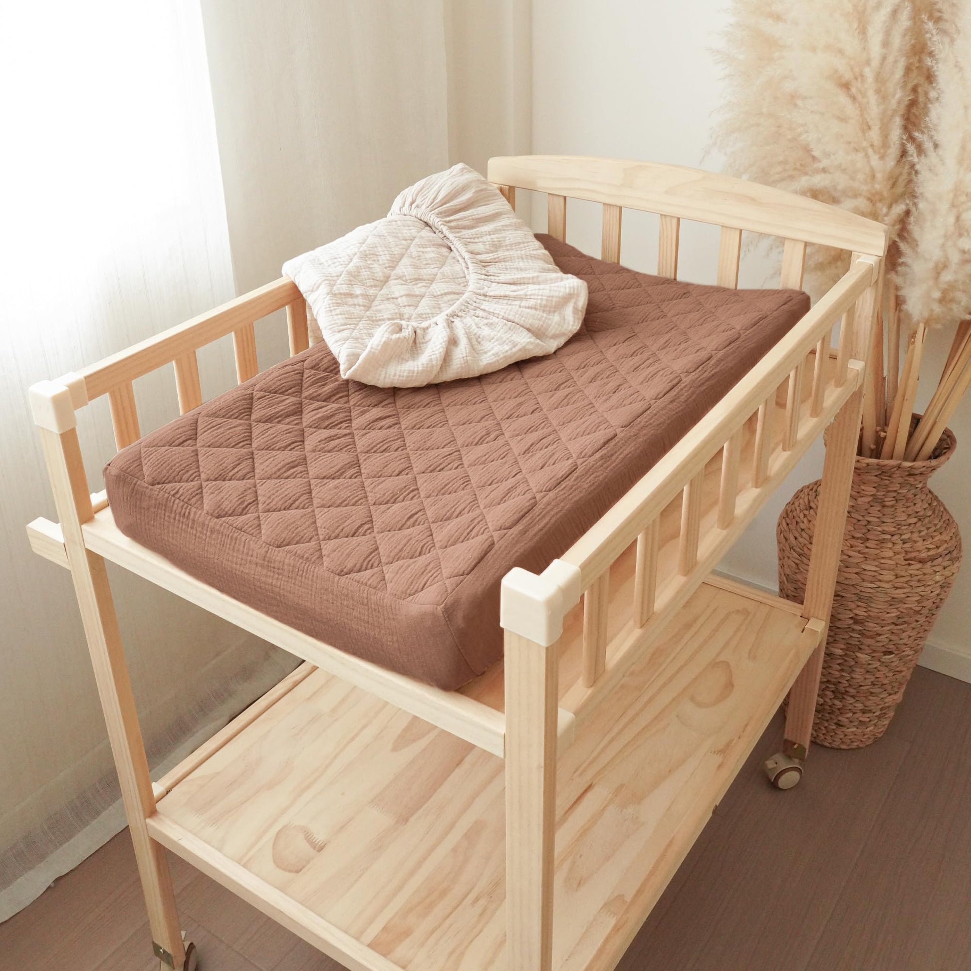 Our changing pad cover is made of 100% muslin cotton surface, which makes our changing pad soft and comfortable to touch, especially perfect for baby delicate skin. The quilted design increases airflow for added comfort.
