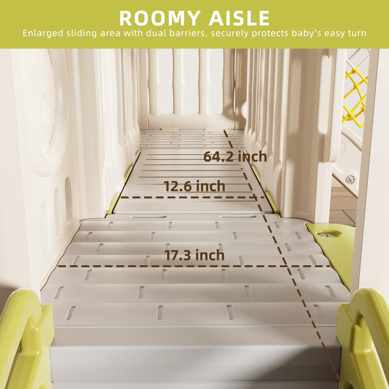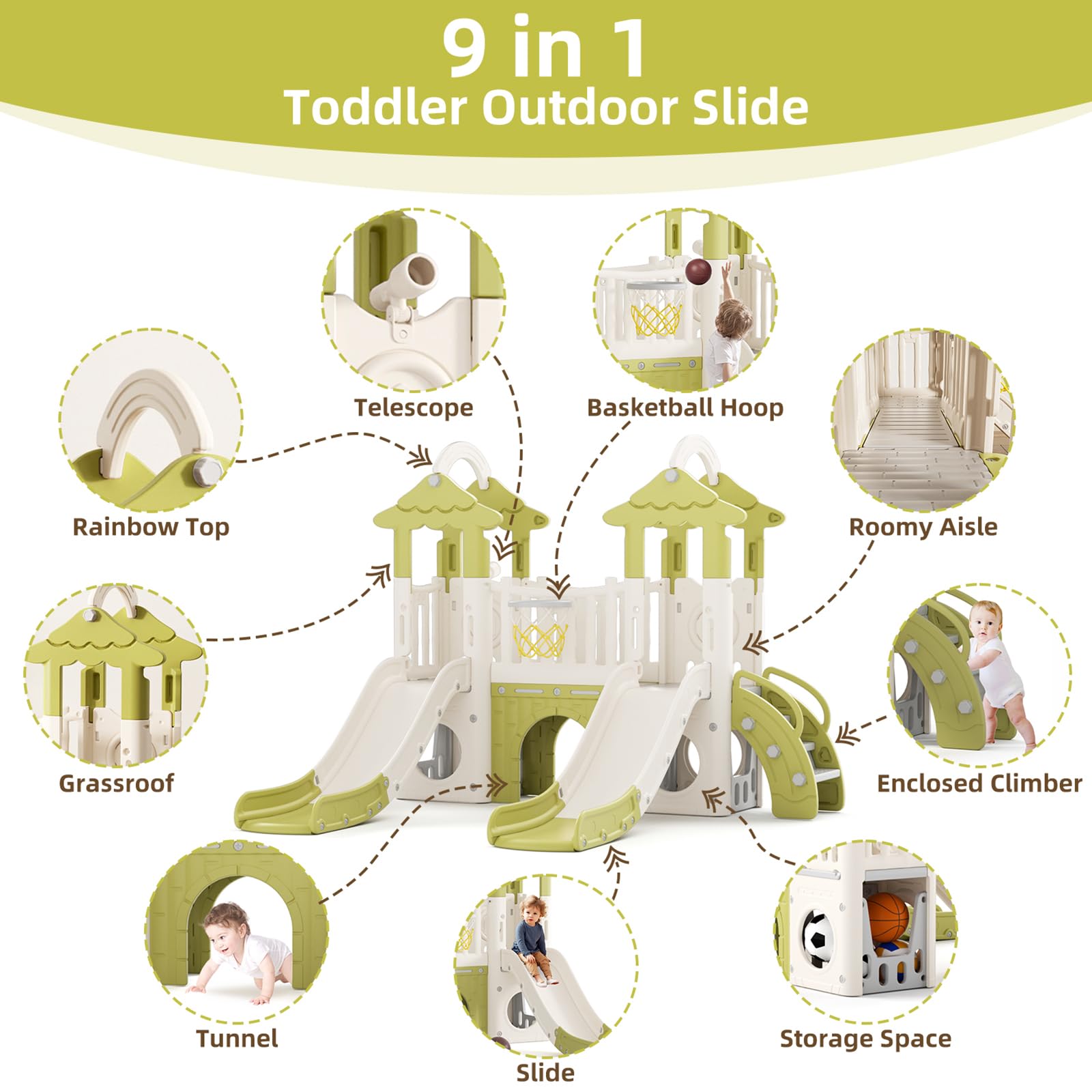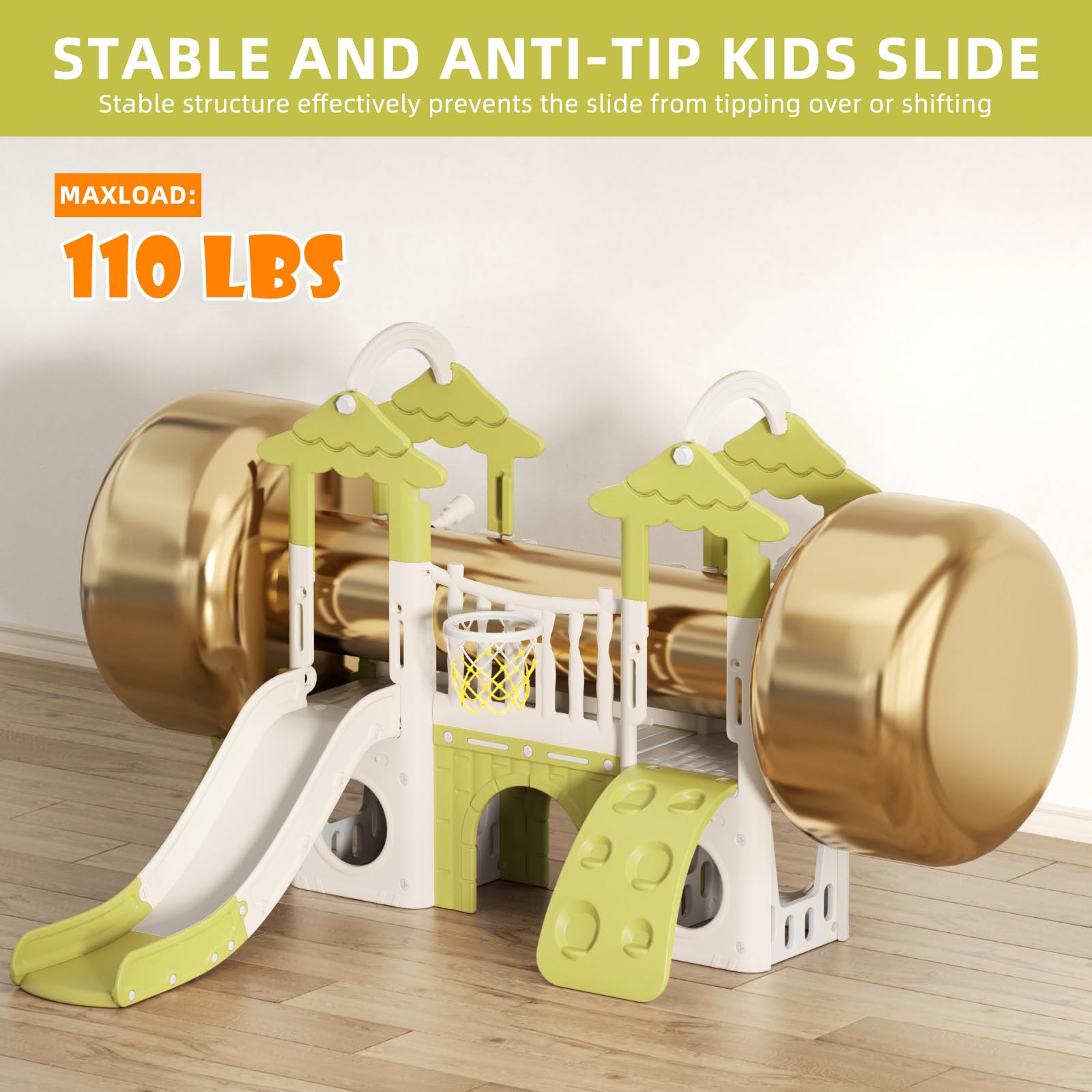 - All-in-One Playset: The 10-in-1 slide toy offers a variety of play experiences, including two gentle slide, a climbing stairs with handrail and enclosed steps, and a cozy tunnel for exploration. It also features toy telescopes and a soft basketball hoop to enhance motor skills and active play.