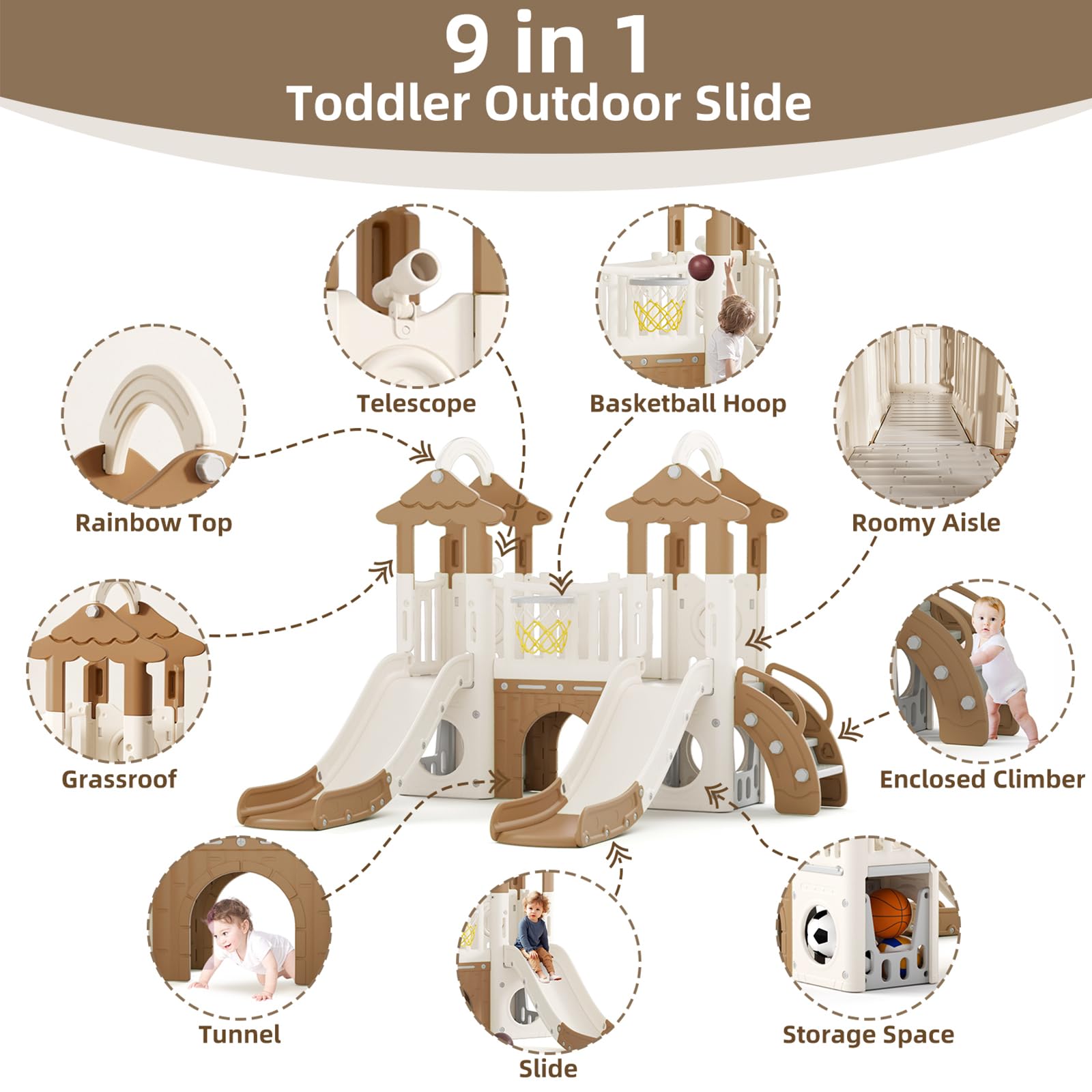 KORIMEFA 10-in-1 Toddler Slide, Kid Double Slide for Toddlers Age 1-3, Basketball Hoop, and Telescope, Indoor Outdoor Slide Toddler Playset Toddler Playground, Forest Themed Brown