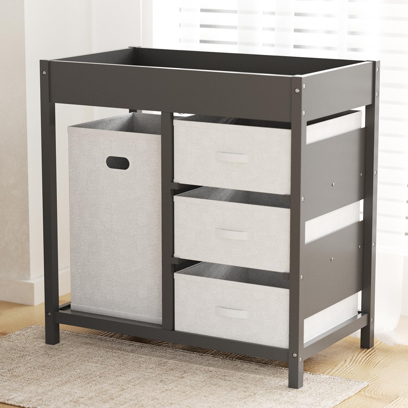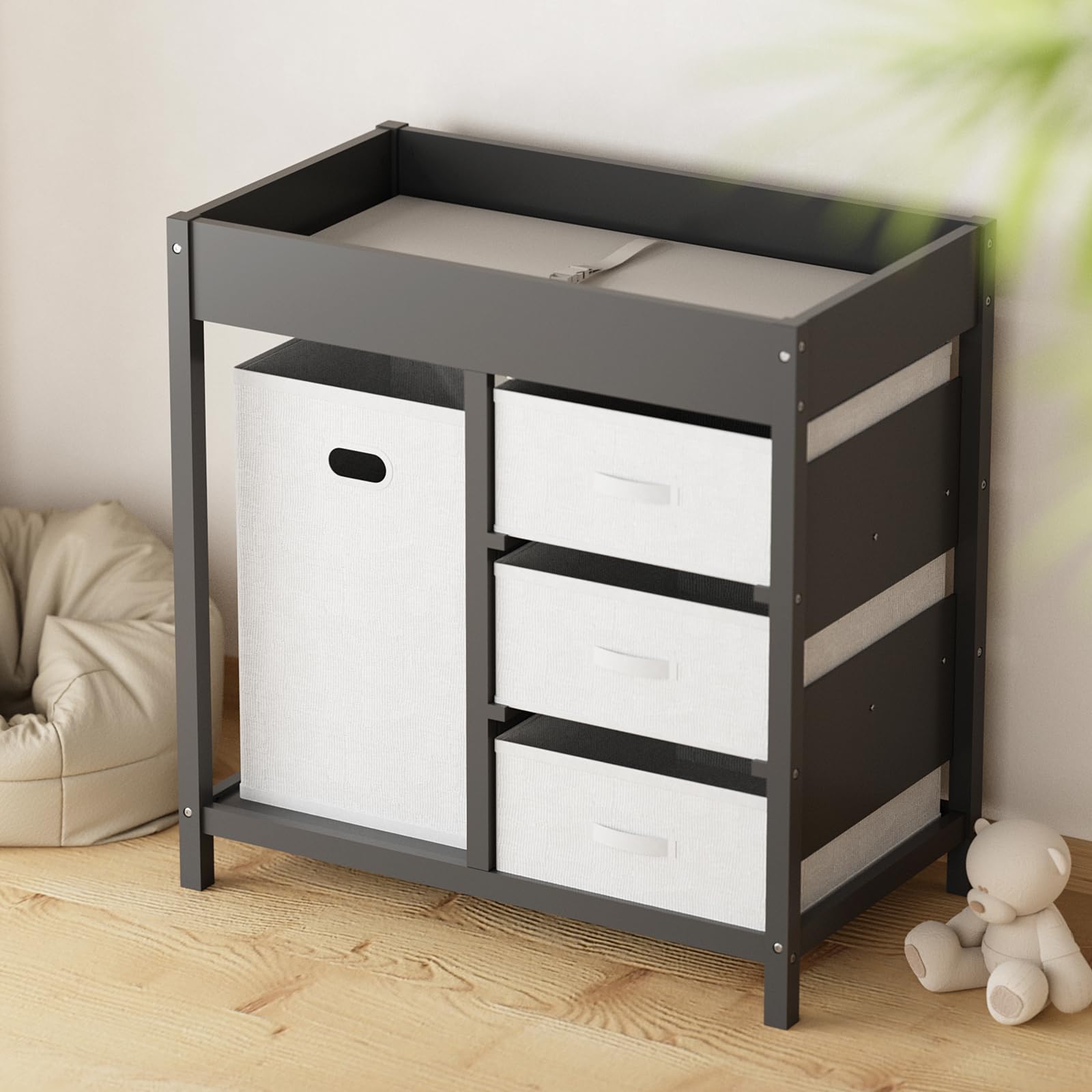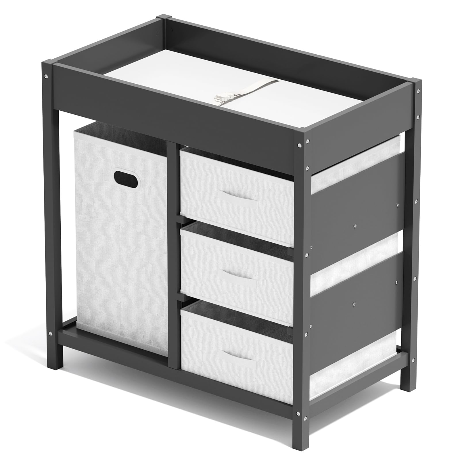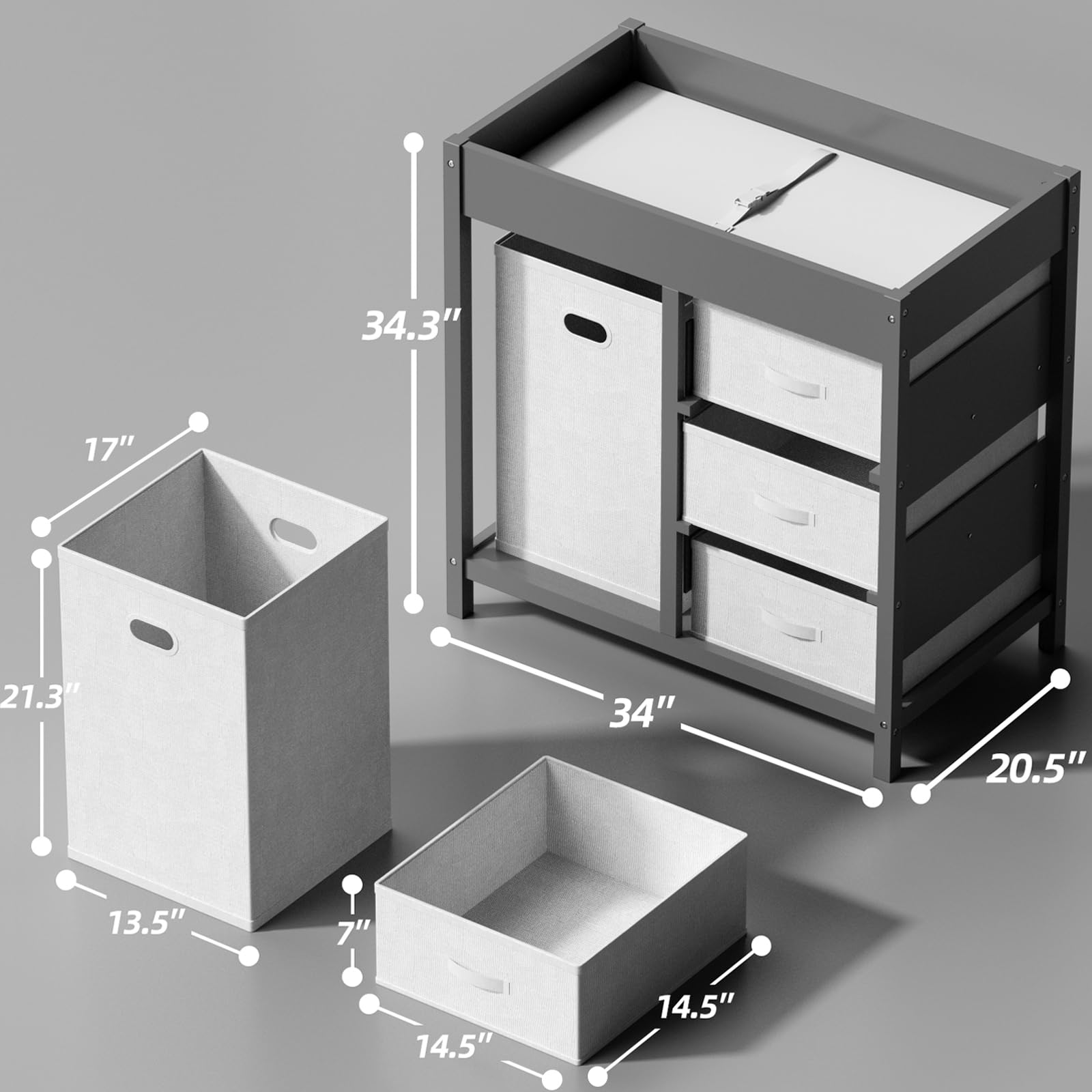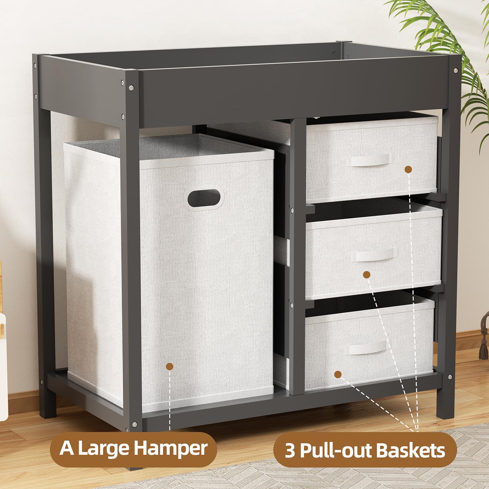 KORIMEFA Baby Changing Table, Baby Diaper Changing Station Dresser with Laundry Hamper, 3 Drawer Basket and Changing Pad, Grey