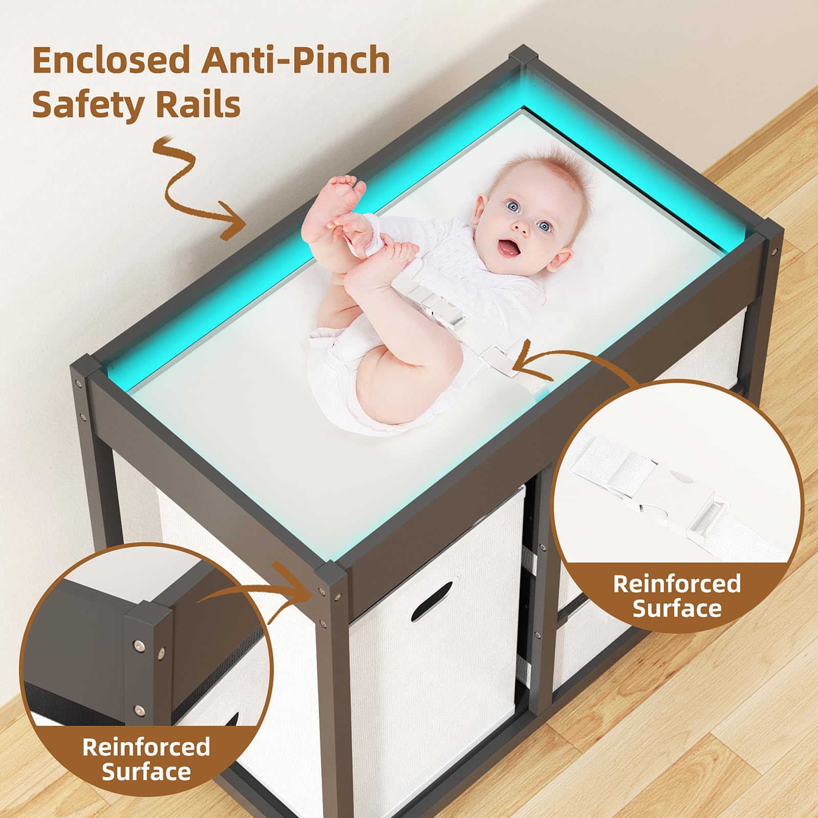 Enclosed Anti-Pinch Safety Rails, and comes with an integrated safety belt to ensure your baby's safety never leave your baby unattended on the table.