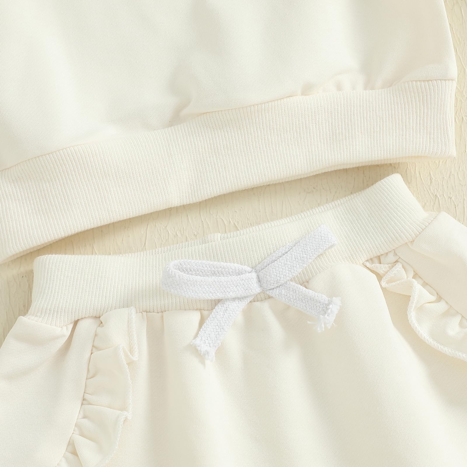 - Design: Baby girl fall clothes; Long sleeve crew neck ruffle trim bow decor pullovers, baby girl bow sweatshirt tops, baby girl crewneck sweatshirt, matching with solid joggers pants, very adorable and skin-friendly, cute baby girl clothes