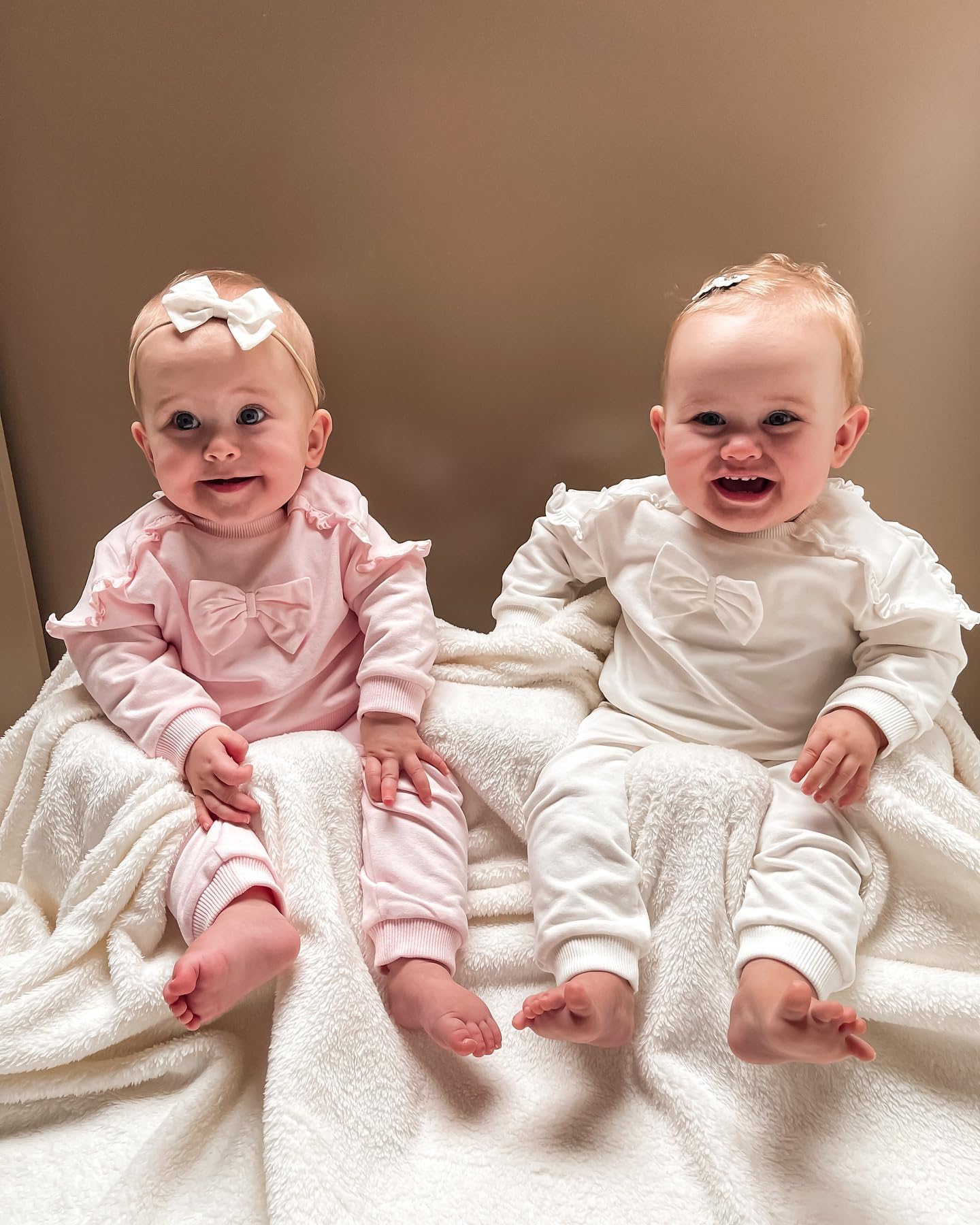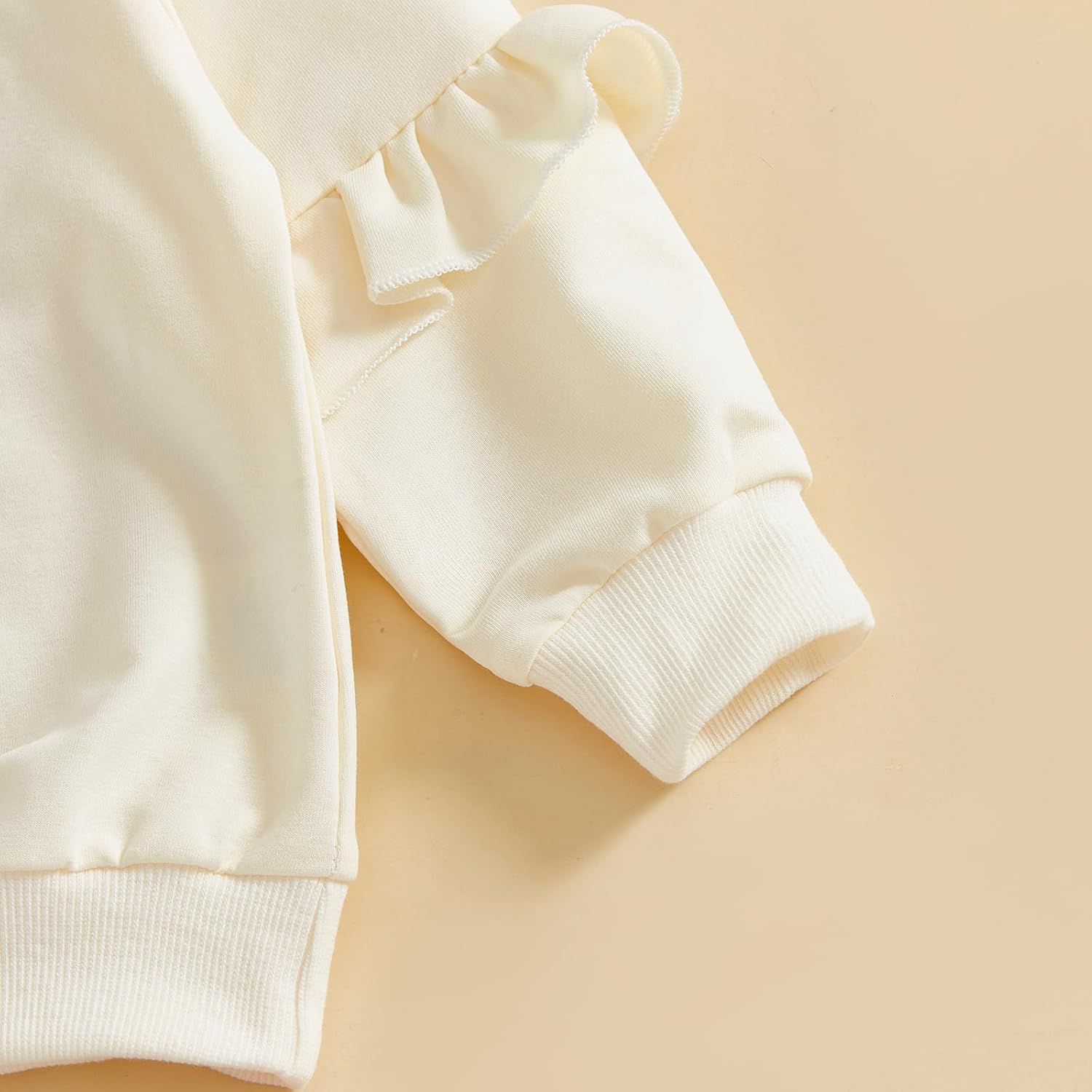 This baby girl solid fall set features a long-sleeve sweatshirt with stylish flutter sleeves and a large, eye-catching bow on the chest, paired with matching solid-color pants, creating an effortlessly cute look for your little one, cute baby girl clothes