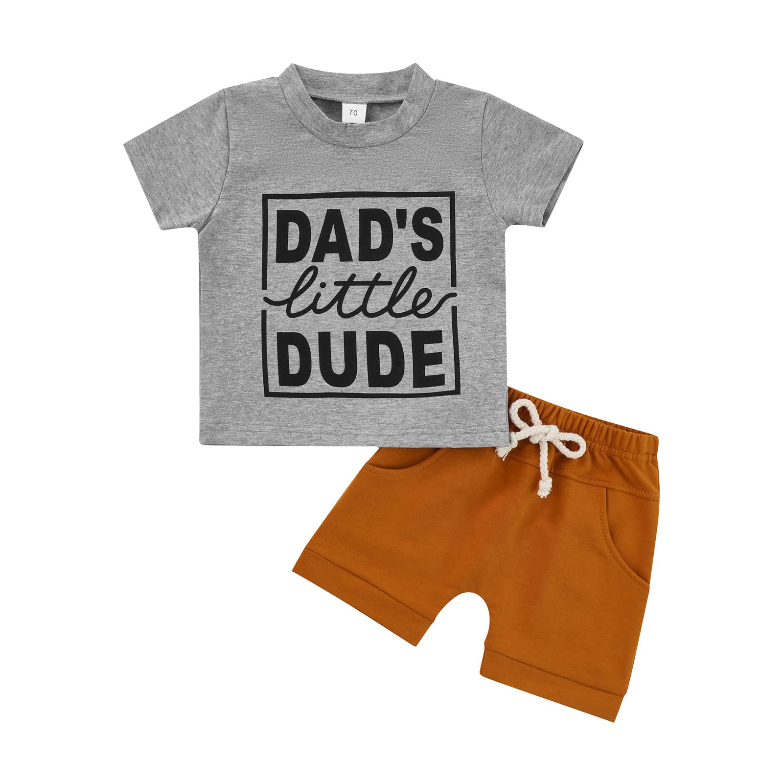 Cute and stylish summer outfit set for baby boys, featuring a dad's little dude letter printed short sleeve tshirt and elastic waist solid shorts, baby boy tshirt is designed with a classic crew neckline and short sleeves, while the shorts have an elastic waistband for easy on and off