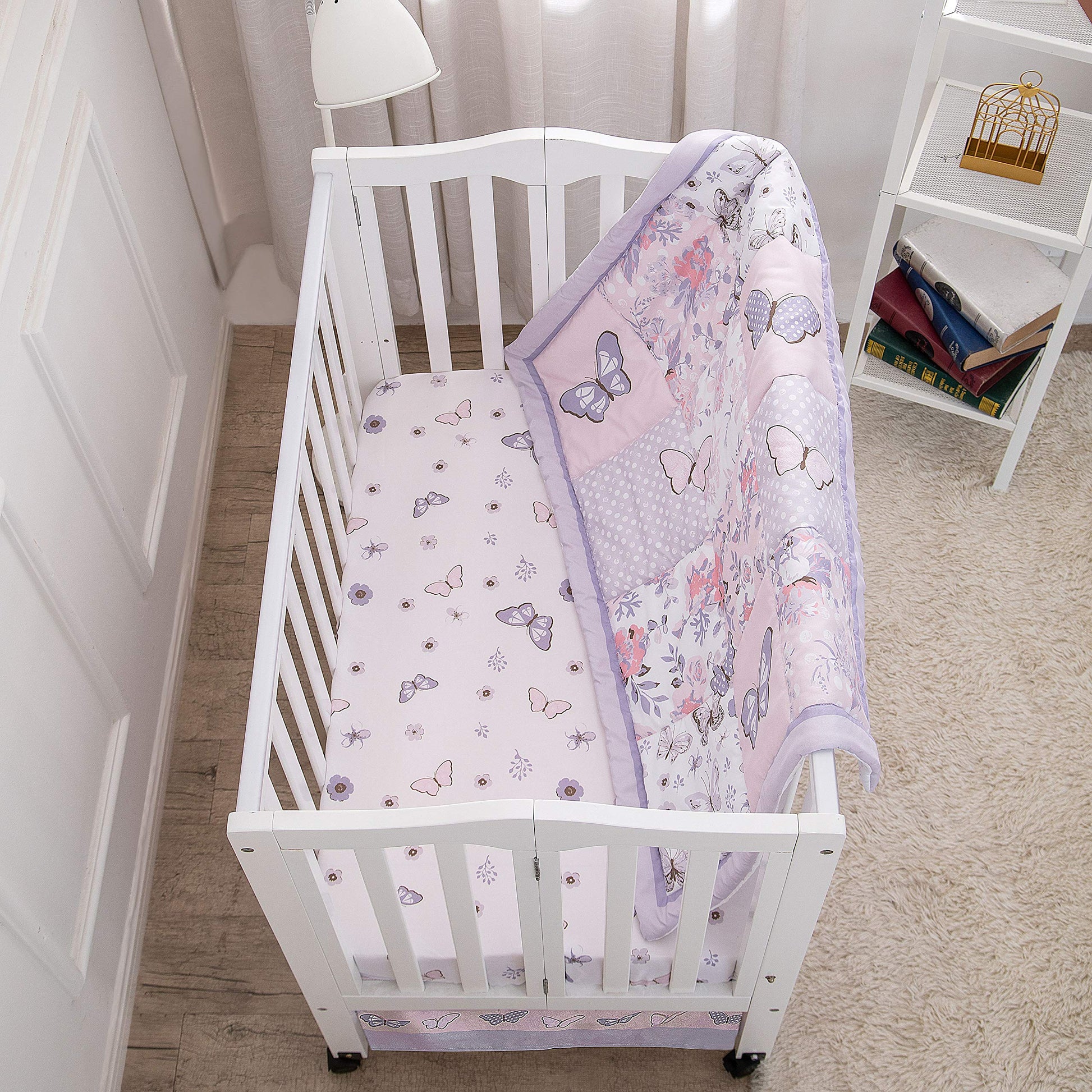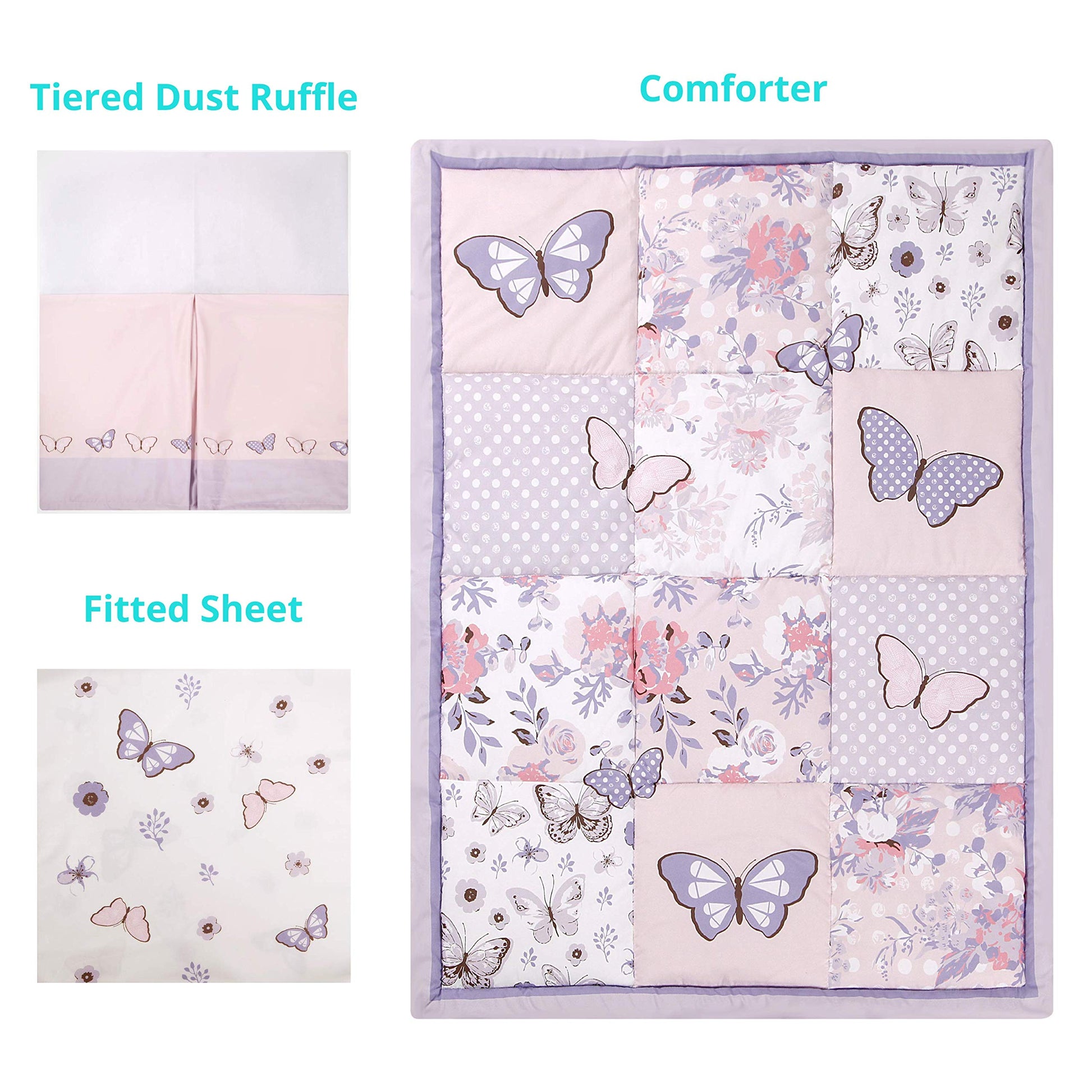 La Premura 3-Piece Purple Butterfly Baby Crib Bedding Set for Girls, Lilac Standard Size Crib Set for Baby Girl, Comforter, Fitted Sheet, and Dust Ruffle Skirt, Baby Nursery Floral Design for Girls