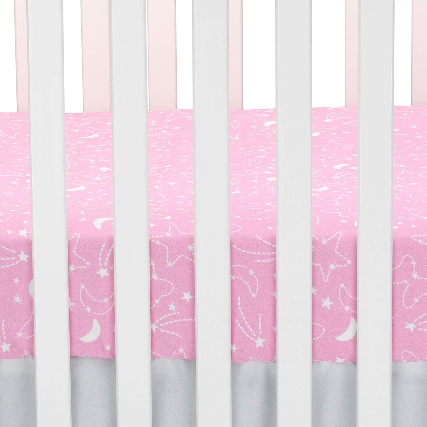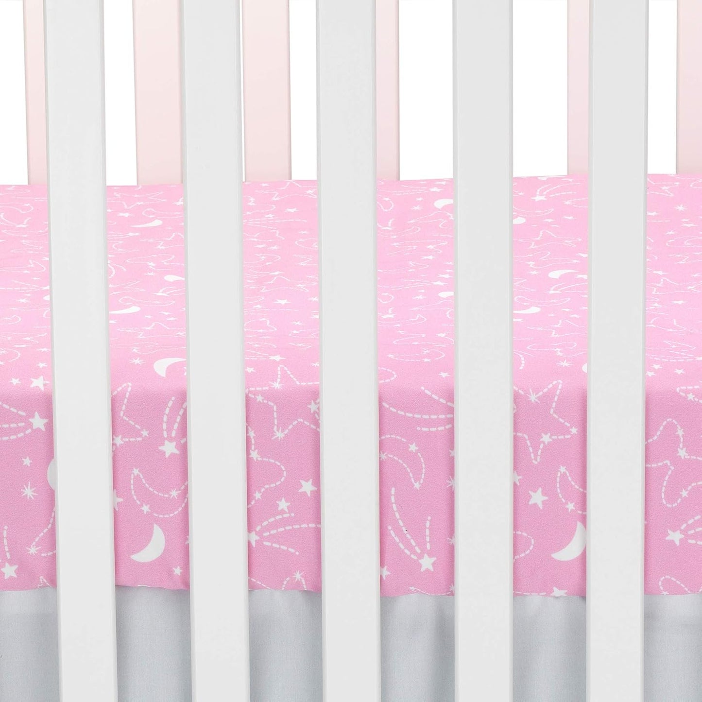 - Fitted crib sheet is on a pretty pink ground with white outlined shooting stars, moons, and bows