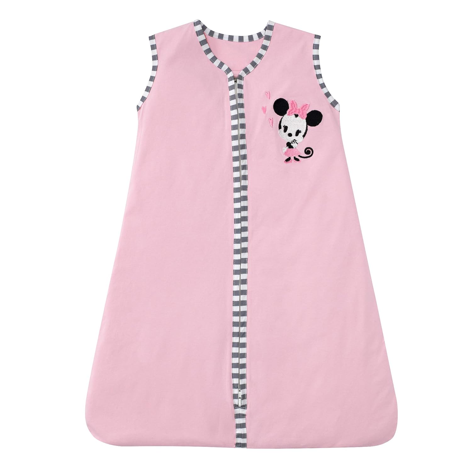 - Pink 100% cotton jersey wearable blanket, which is recommended for safe sleep, features Minnie Mouse in the upper right-hand corner
