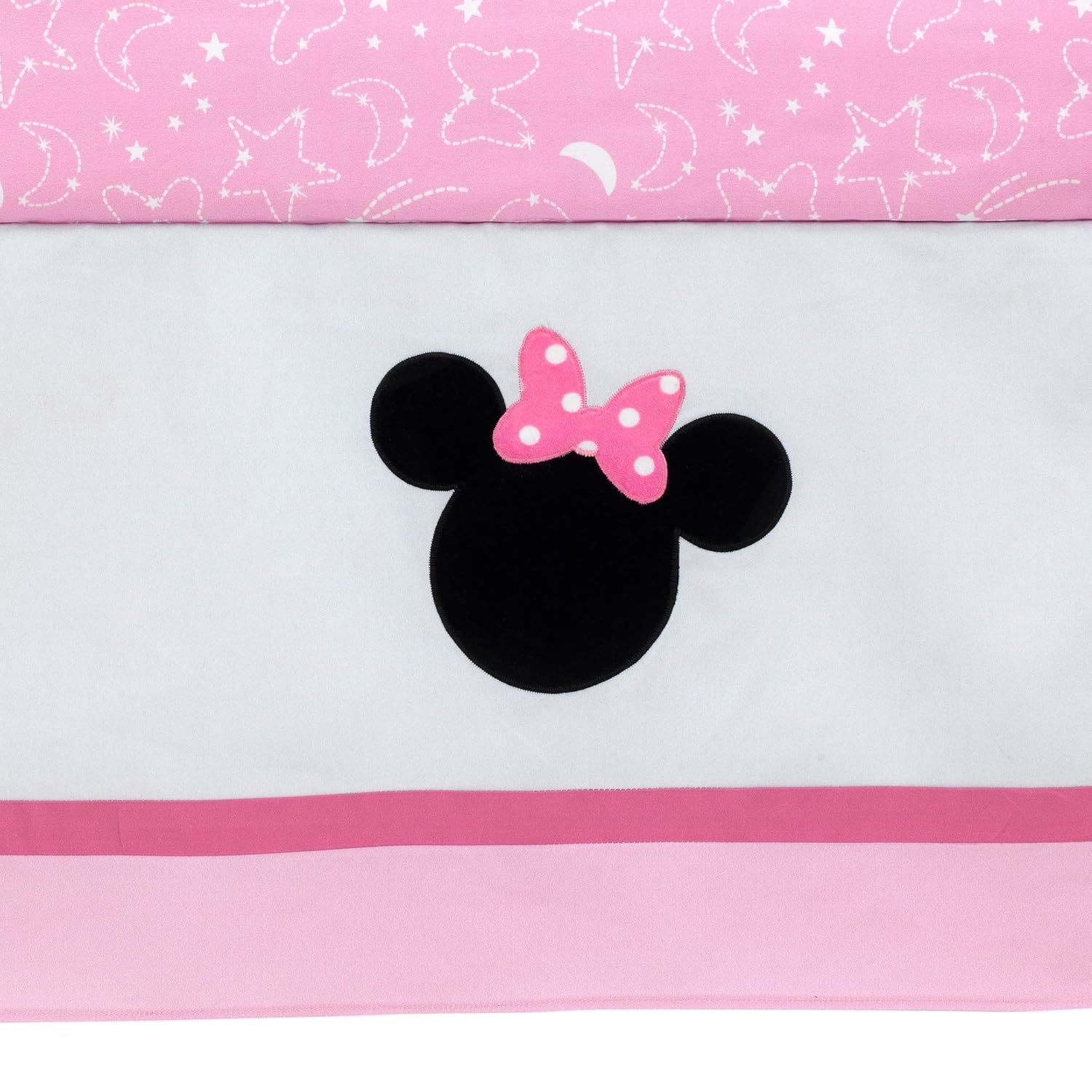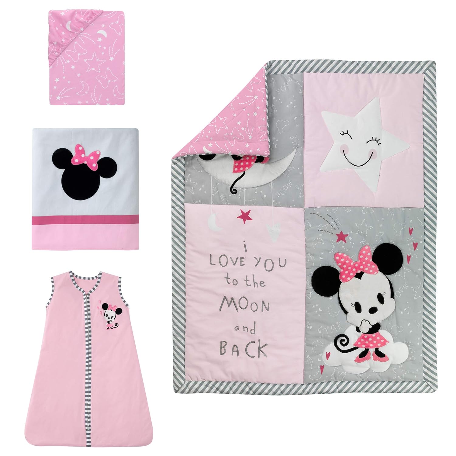 This four-piece crib bedding set includes one quilt, one fitted crib sheet, one crib skirt, and one wearable blanket. The patchwork styled quilt features Minnie Mouse appliqued and embroidered on a crescent shaped moon and standing on a fluffy white cloud. Elaborate embroidery stitches, soft minky fabrics and expertly appliqued details decorate the quilt and crib skirt. This fitted crib sheet is on a pretty pink ground with white outlined shooting stars, moons, and bows. The pink 100% cotton jersey wearable blanket, which is recommended for safe sleep, features Minnie Mouse in the upper right-hand corner. She is wearing her favorite pink outfit complete with pink shoes and bow. A gray and white stripe trims the neckline, arm holes and zipper. It is 27" long and is a small medium size.