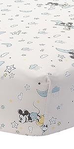 Exceptionally soft and breathable microfiber sheet featuring Mickey Mouse, stars, moons, and clouds. It has elastic all the way around ensuring a safe and secure fit on a standard size crib mattress.