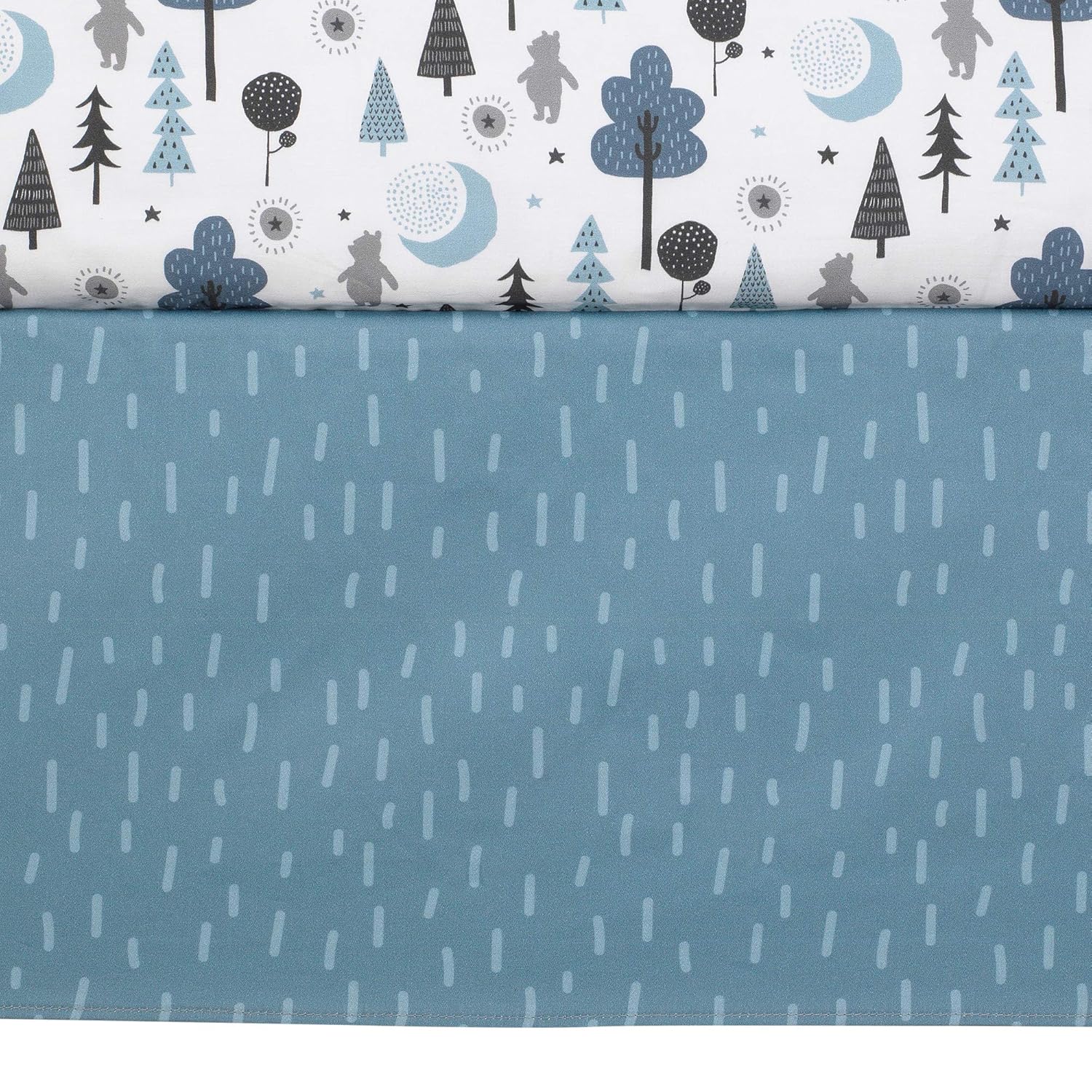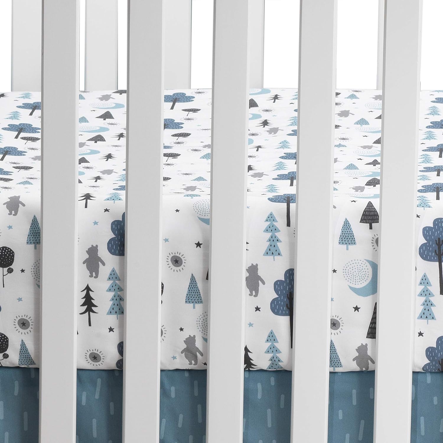 The 3-Piece crib bedding set includes one quilt, one fitted crib sheet and one crib skirt. The quilt features a charming hillside in shades of blues and grays with Winnie the Pooh, back to back with his best friend Piglet. Under the starry night sky, they amuse themselves blowing dandelion flowers into the night air. Winnie the Pooh is fully appliqued in a soft Sherpa and is wearing his favorite blue chambray shirt. Tigger, sitting close by on the hillside is enjoying the view. The fitted crib sheet is decorated with various trees in different shapes and sizes along with silhouettes of Winnie the Pooh and moons and stars. The crib skirt is a pattern of two colors of blue. This collection has been digitally printed in a high resolution which enhances the blues and grays and it is eco-friendly.