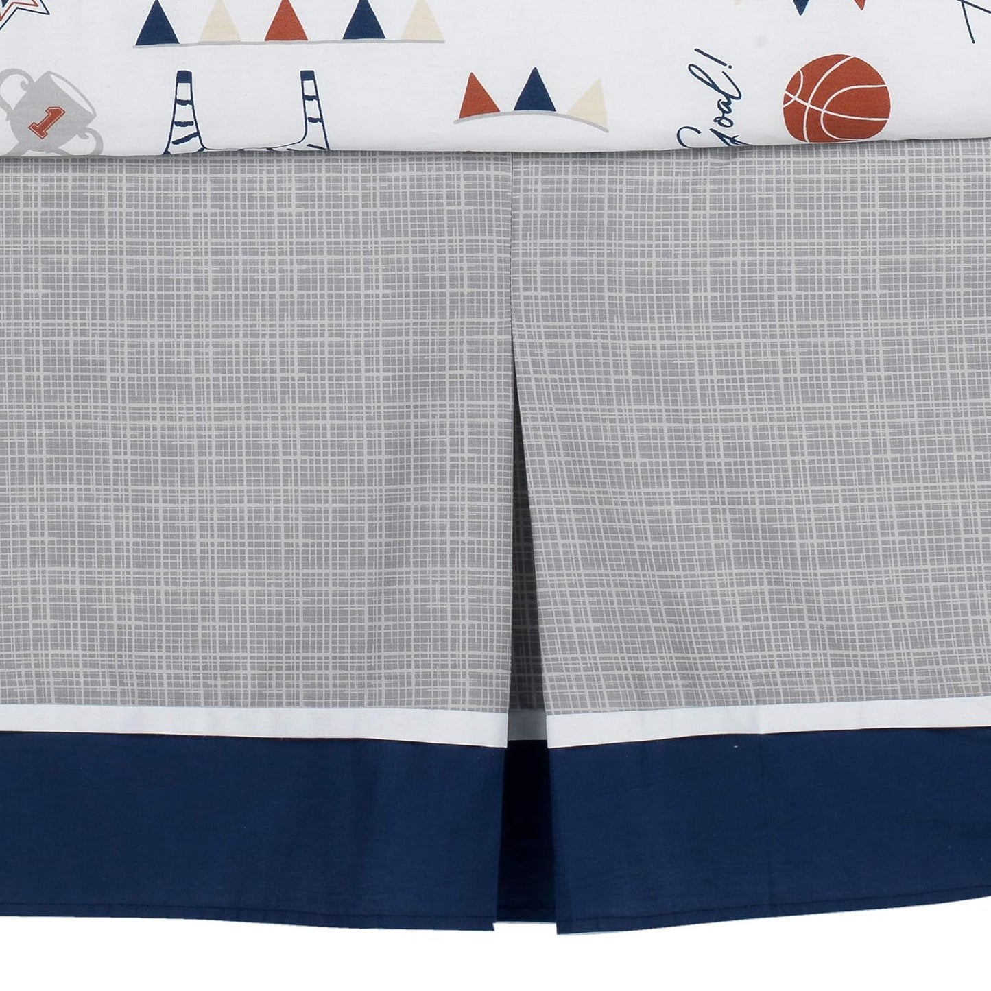 Welcome your little athlete home with this sport-inspired baby bedding collection. The crib bedding set comes complete with one quilt (36” X 45”), one 100% cotton fitted crib sheet, one 4-sided crib skirt, one plush minky football, and a complete set of wall decals. This asymmetrical patchwork quilt has six unique fabric panels. Featured sports are baseball, basketball, football, and soccer. The textured appliqued and embroidered animals are all playing their favorite sports. The lion is playing soccer and holding a trophy, the zebra is playing football, the elephant is playing baseball, and the giraffe is playing basketball. The breathable 100% cotton fitted crib sheet is a tossed print and includes elephants, zebras, lions, and giraffes at play along with trophies and verbiage sayings of “slam dunk” and “the catch.” The fitted crib sheet is designed to fit a standard crib mattress measuring 52” X 28”. The crib skirt is a crosshatch print in gray and white. The border is navy and is separated from the gray crosshatch with a white twill flange. There are two pleats on the front panel and the crib skirt has a 14 ½” drop. Included in the bedding set is a complete set of easy on, easy off wall decals that make up nine triangular pennants in gray, navy, blue, and tan along with six stars. The decals are a great way to make a feature wall in the nursery and they won’t harm your walls. This crib bedding set is a top baby registry pick and is a wow gift at any baby shower!