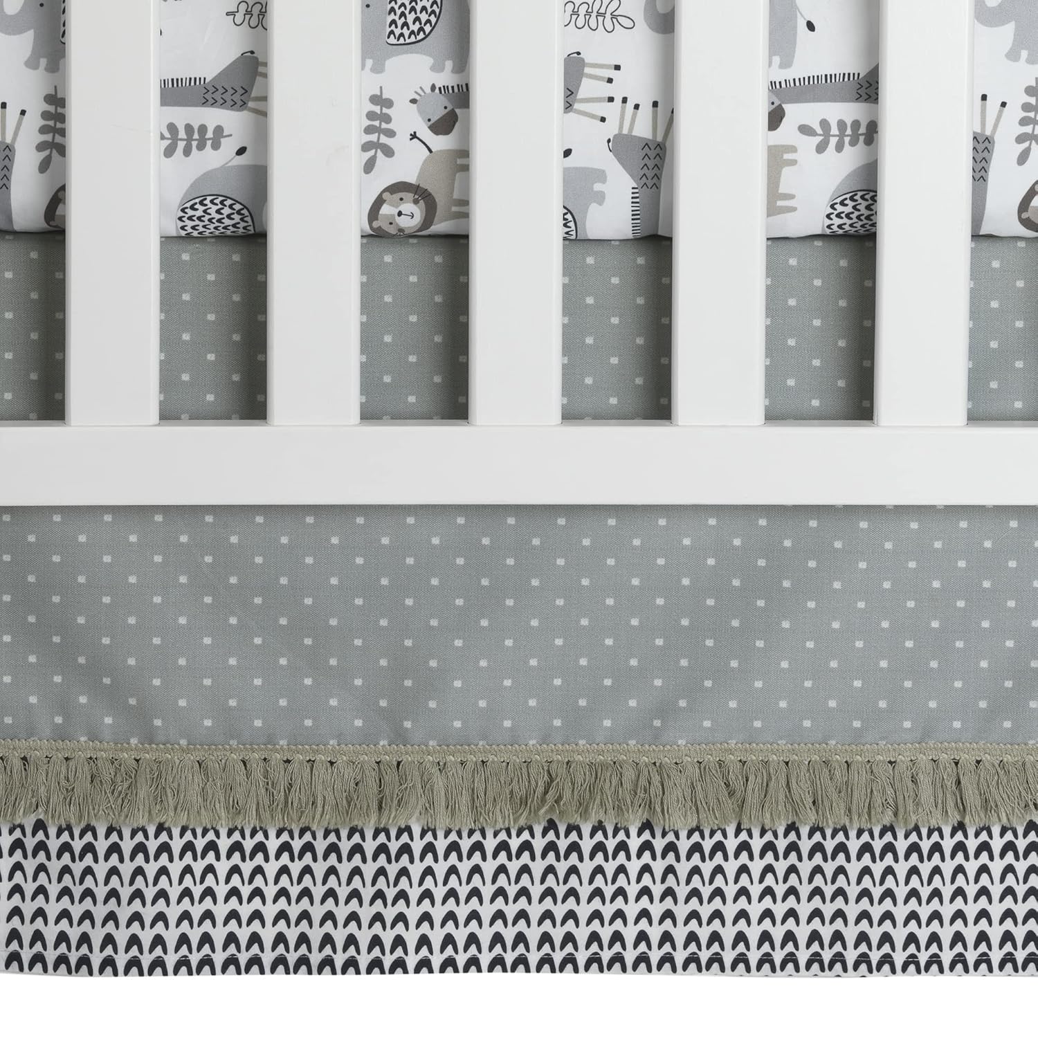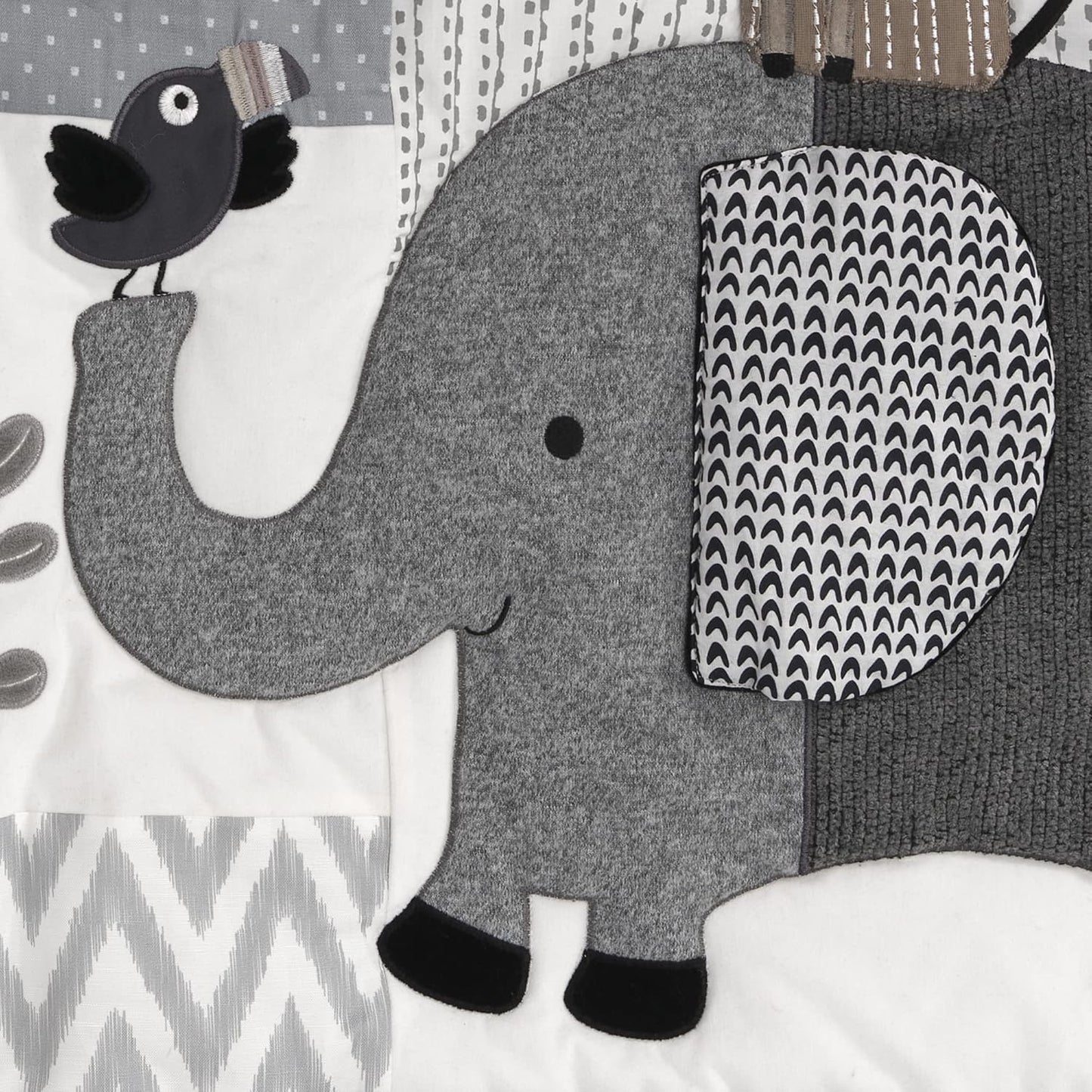 A jungle inspired collection featuring majestic animals in an artful mix of tactile appliques. The four piece set includes one quilt, one 100% cotton fitted crib sheet, one dust ruffle with trendy trims and tassels and a jumbo set of wall appliques. Mixing tactile textures and furs with detailed appliques, embroideries and trims, make these playful animals come to life. Additional features include three dimensional details such as dimensional tiger paws, an elephant’s ear and a lion’s mane. Quilt is 36” x 45” in size and reverses out to a gray chevron print. The 100% cotton fitted crib sheet measures 28” by 52”, features charming jungle animals, and is fully elasticized with a deep pocket to ensure a secure fit. Complete this designer nursery with the coordinating wall appliques. Cotton/poly blend. Imported.