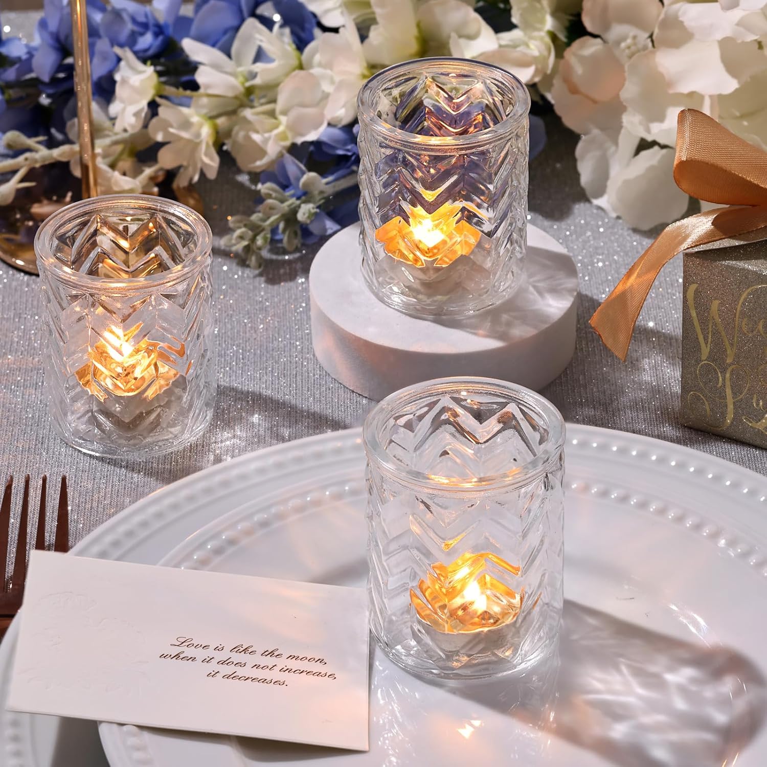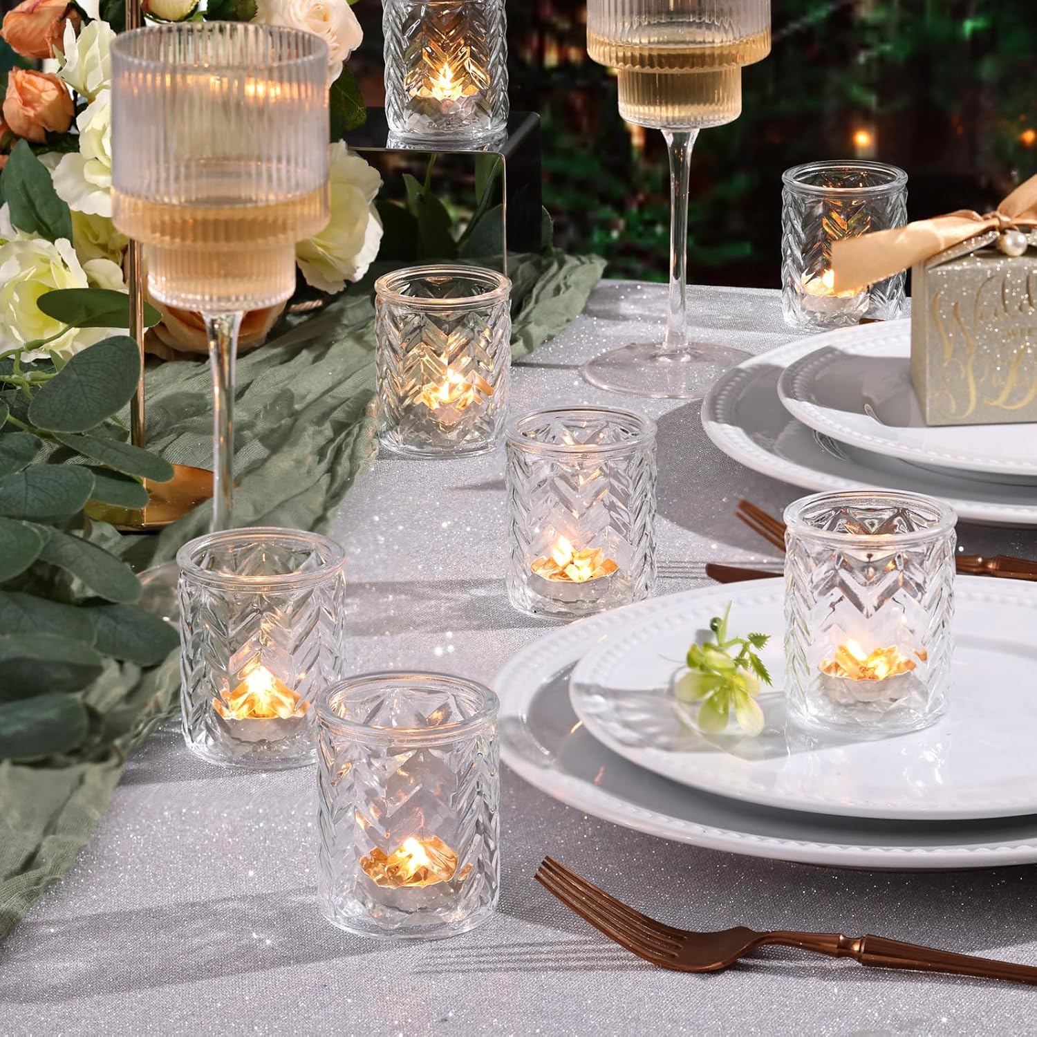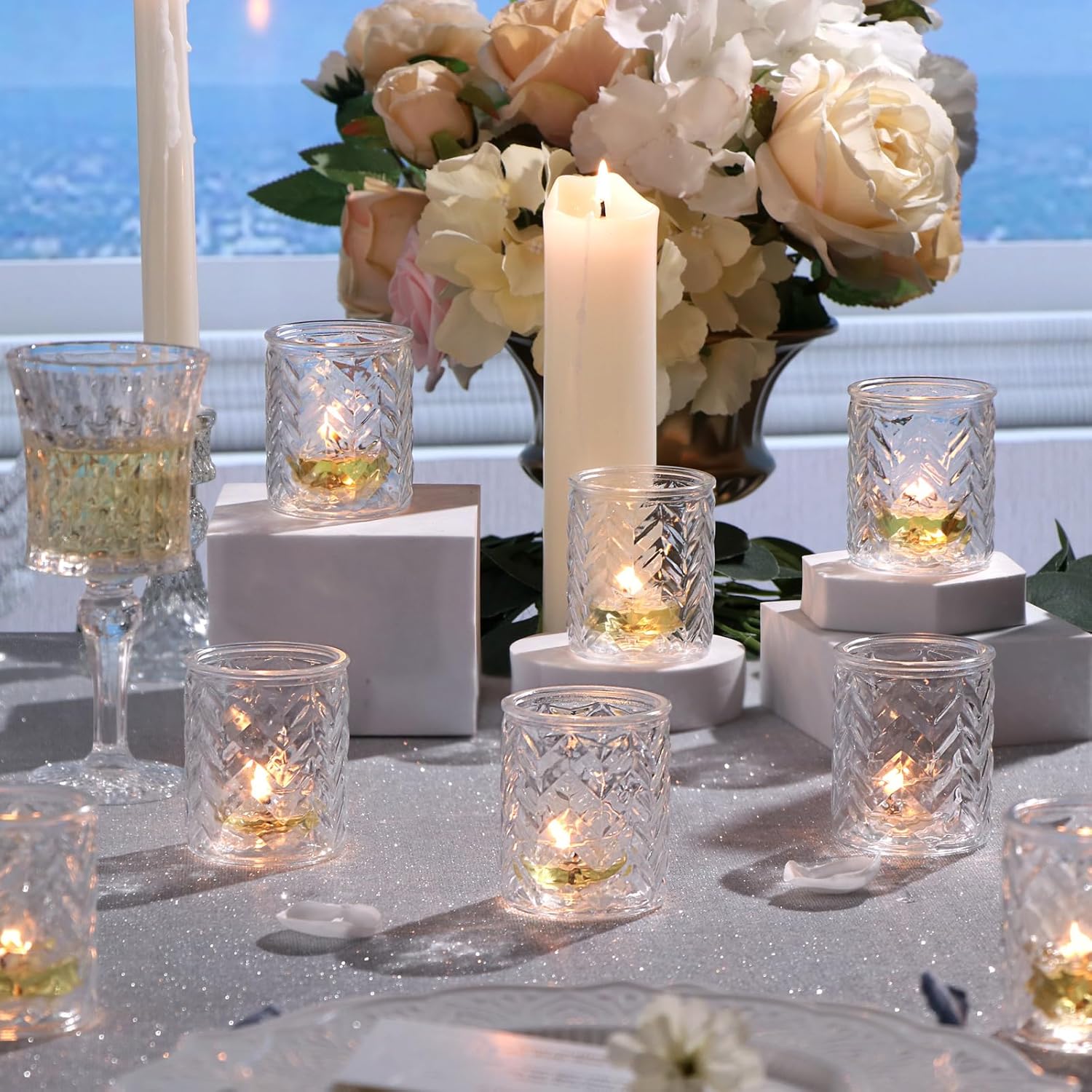 - Applicable Candles: Each set includes 12 pcs tealight candle holders, measuring 2 inches in diameter (Cal) and 2.65 inches in height. Place tea candles, small votives, or LED tealights (diameter better less than 1.6") in these glass candle holders to cast a beautiful, warm glow that enhances the dining experience.