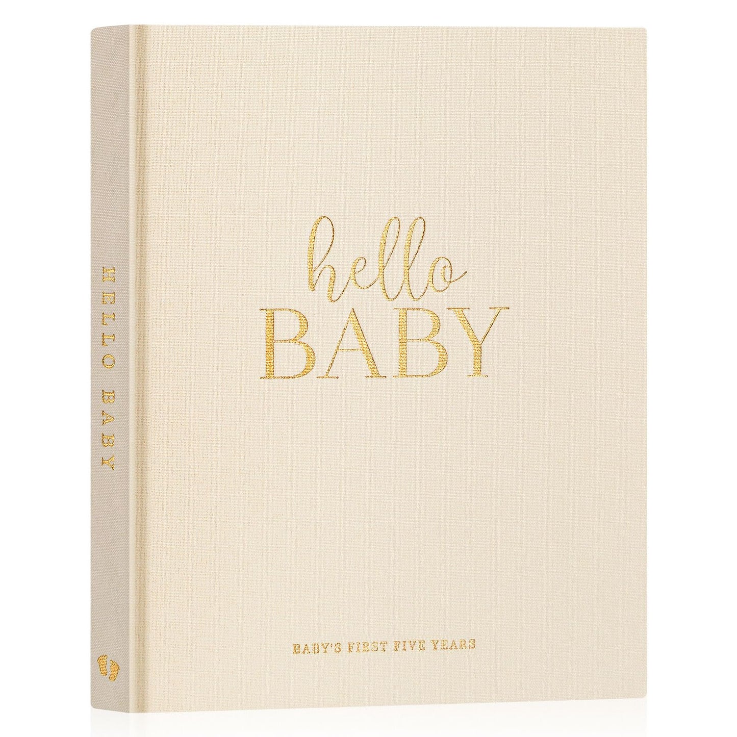 Lanpn Hello Baby First 5 Year Memory Book for Boy Girl - Linen Hardcover Baby Book Keepsake for New Parents - Newborn Baby Journal Scrapbook Photo Album Baby Milestone Book (Beige, 154 Pages)