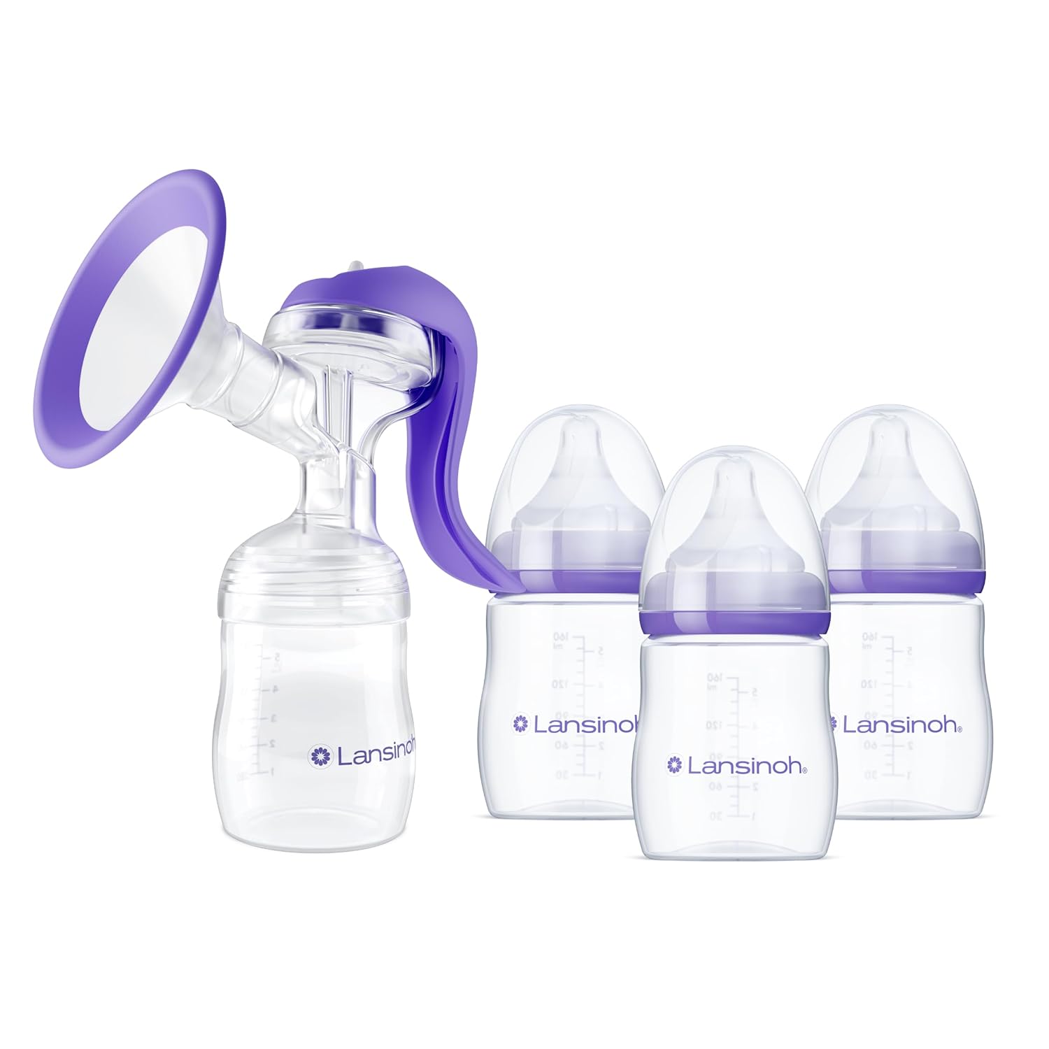 Lansinoh Manual Breast Pump, Hand Pump for Breastfeeding, Includes 5oz Baby Bottle + Baby Bottles for Breastfeeding Babies, Newborn Essentials, 5oz, 3 Ct, Includes 3 Slow Flow Nipples (Size 2S)