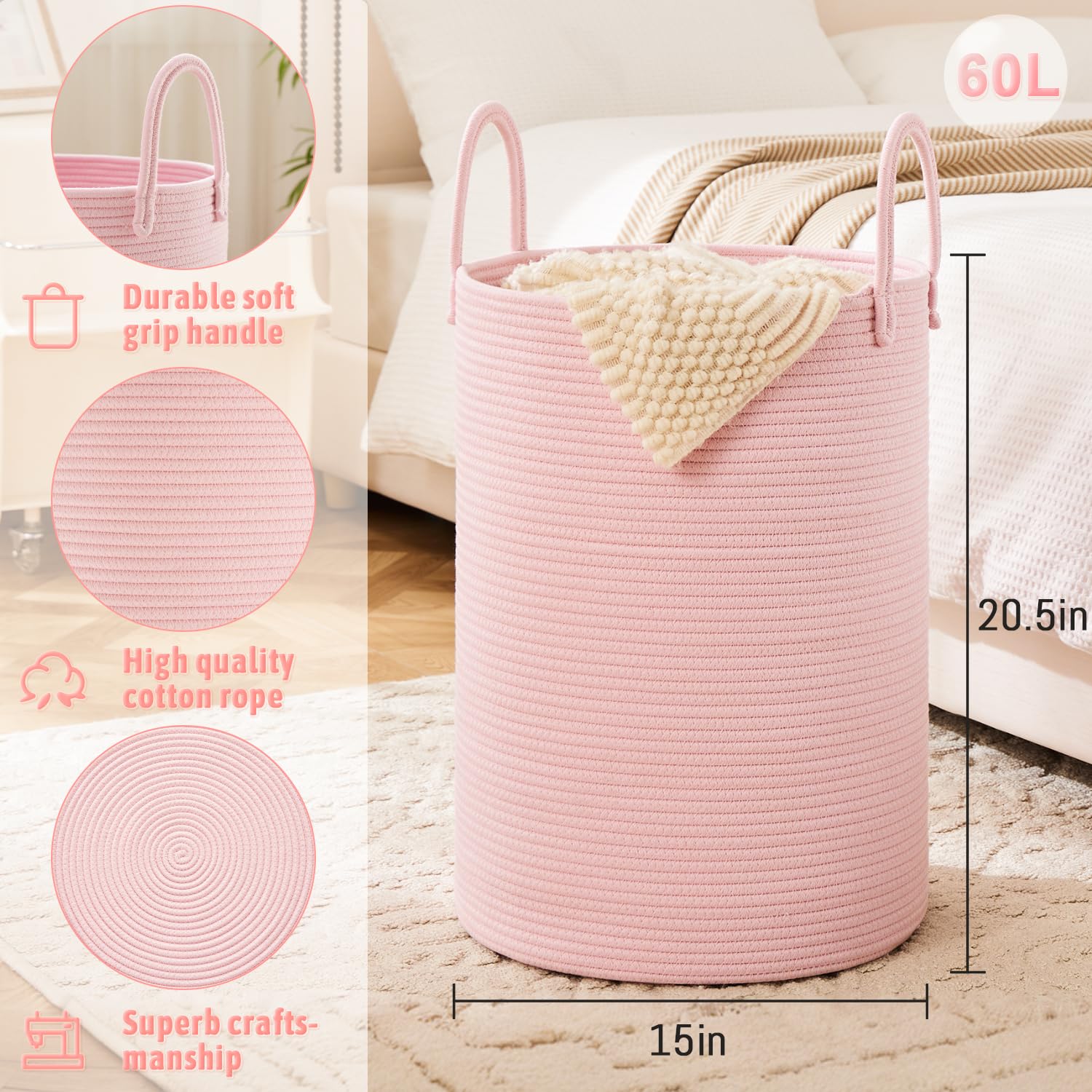 Laundry Basket,Woven Cotton Rope Laundry Hamper,60L for Decor Storage of Dirty Clothes,Toys and Blankets in Bathroom,Baby Room and Living Room