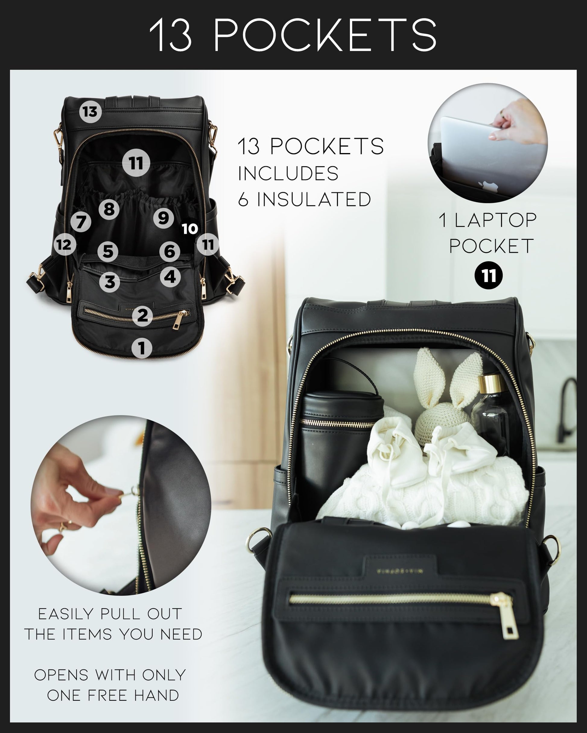 - Spacious & Organized - This leather backpack diaper bag offers 15 thoughtfully designed pockets (10 internal, 5 external, 6 insulated) and a roomy center compartment ideal for a laptop, breast pump, or daily essentials. Plus, a built-in key leash keeps small items within reach.