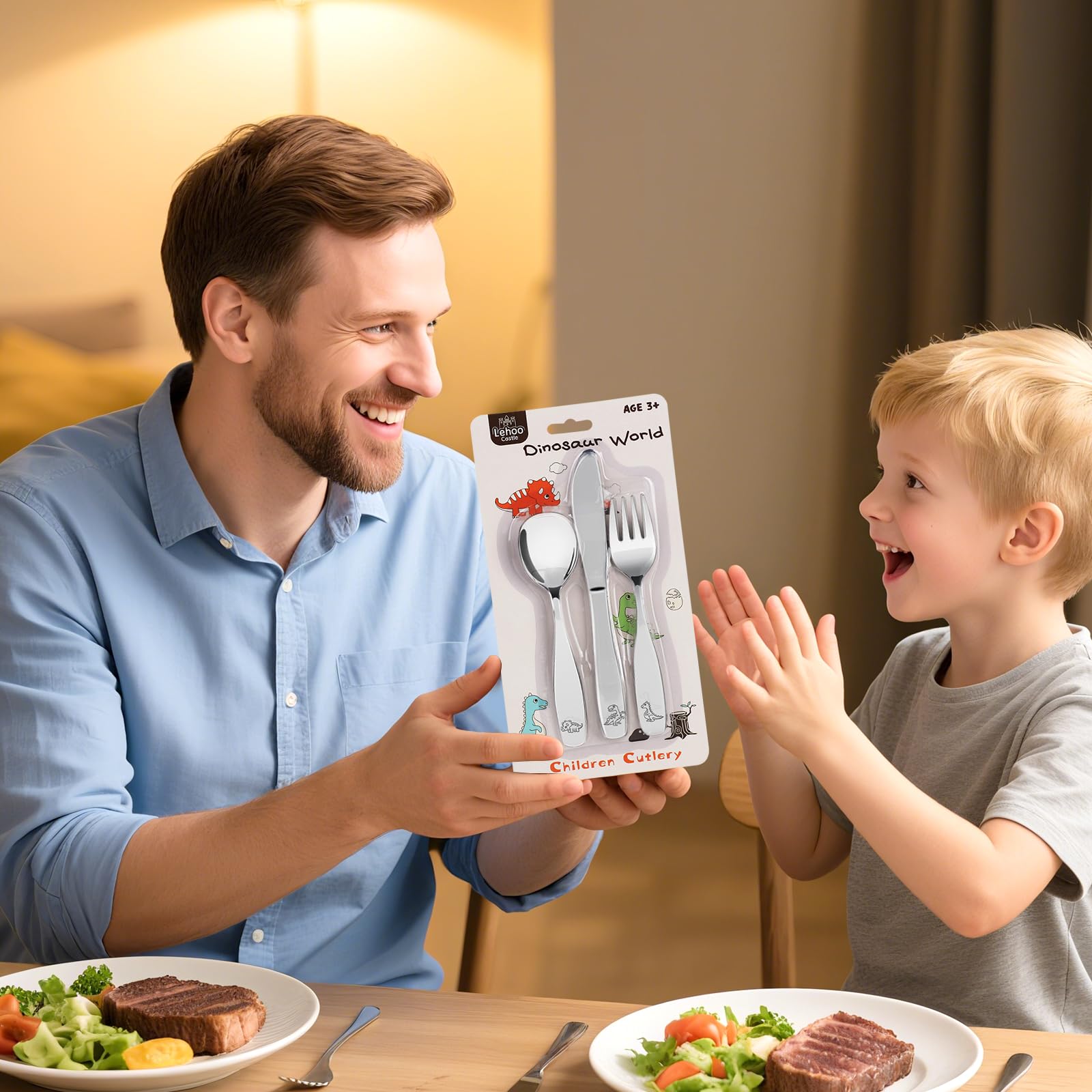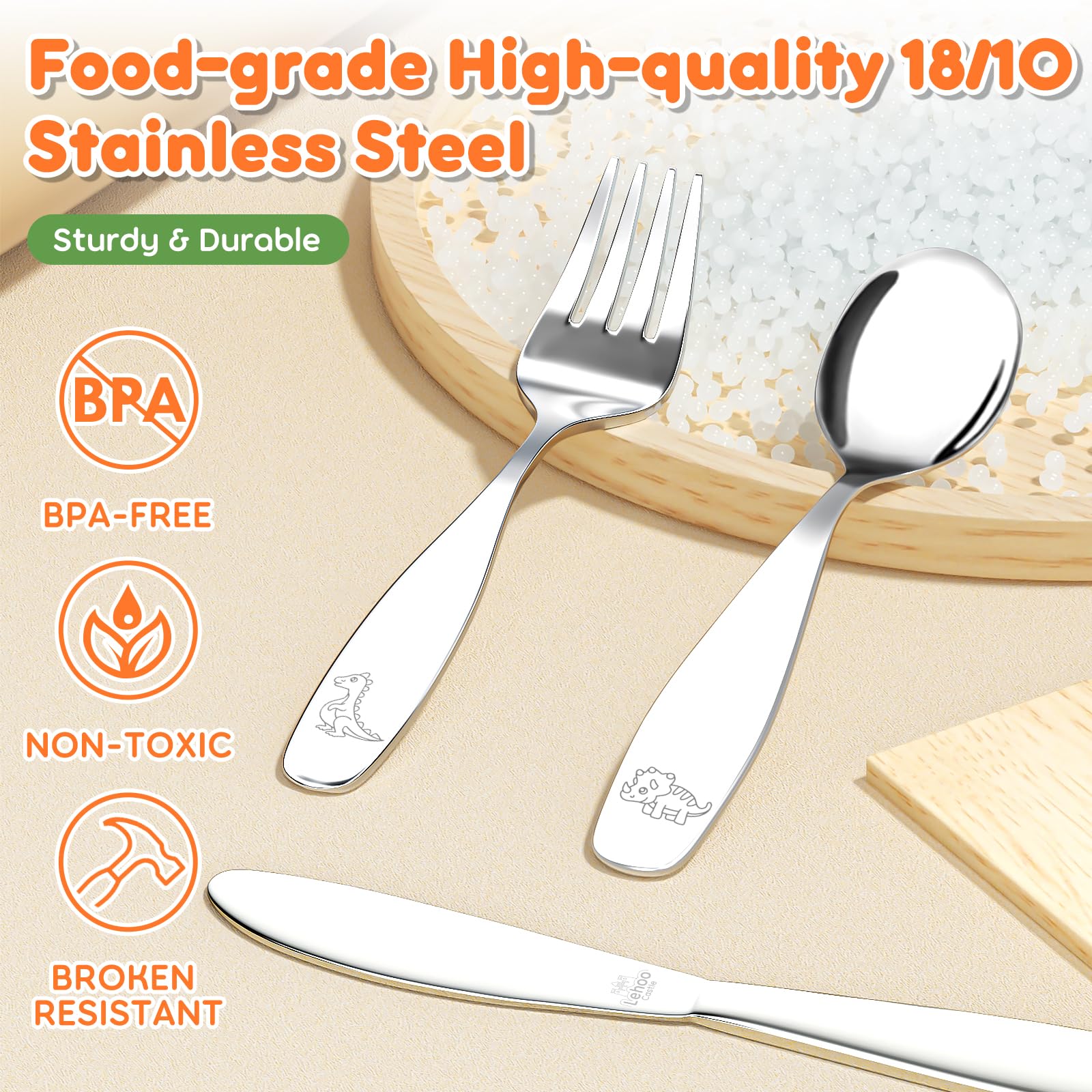 Lehoo Castle Kids Silverware Stainless Steel 6 Piece - Toddler Spoons and Forks Knife Set, Metal Kids Cutlery Set, Toddler Utensils Self Feeding (Dinosaur World)