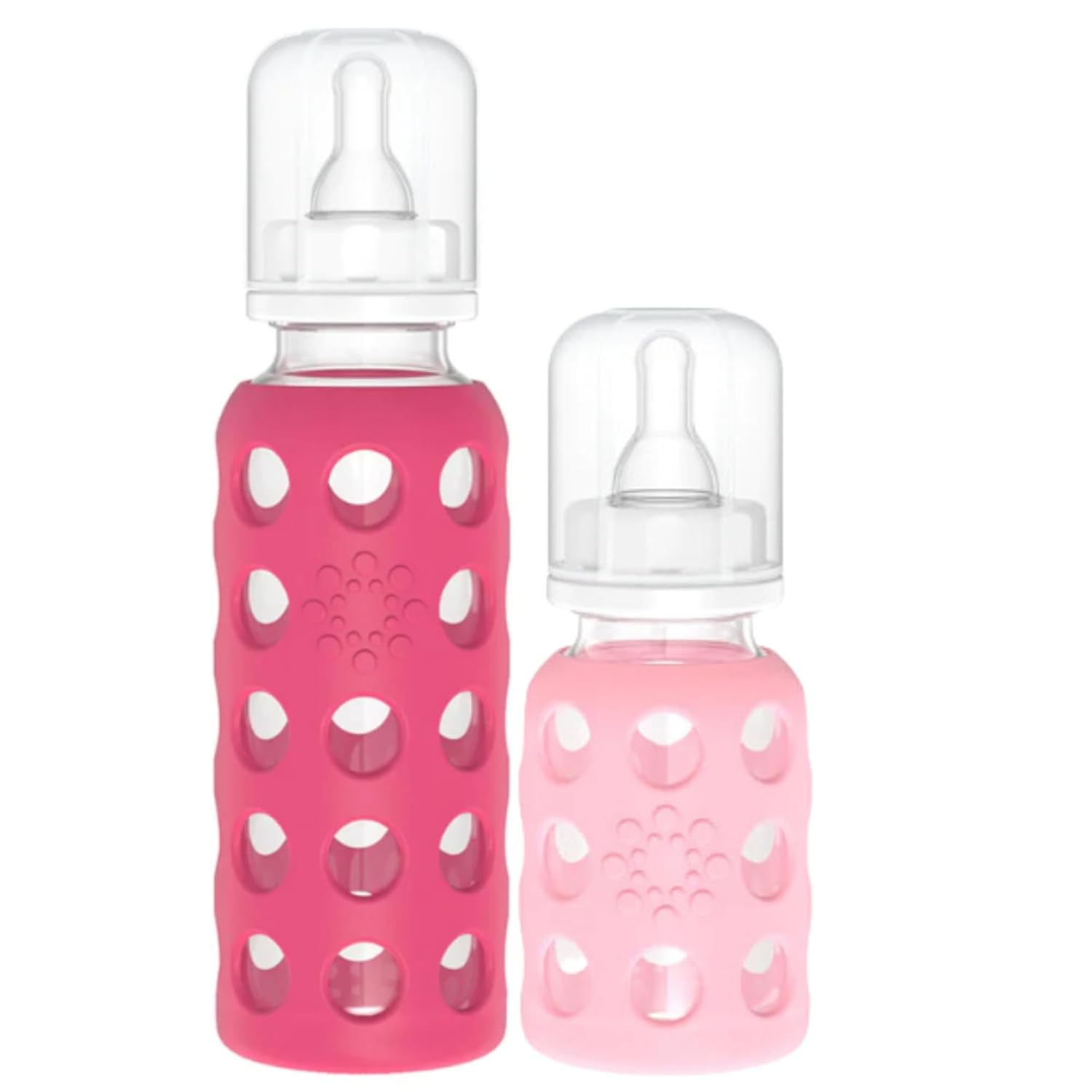 Lifefactory Glass Baby Bottles with Silicone Protection - 2-Pack, 4oz/9oz Bottles, Raspberry & Pink