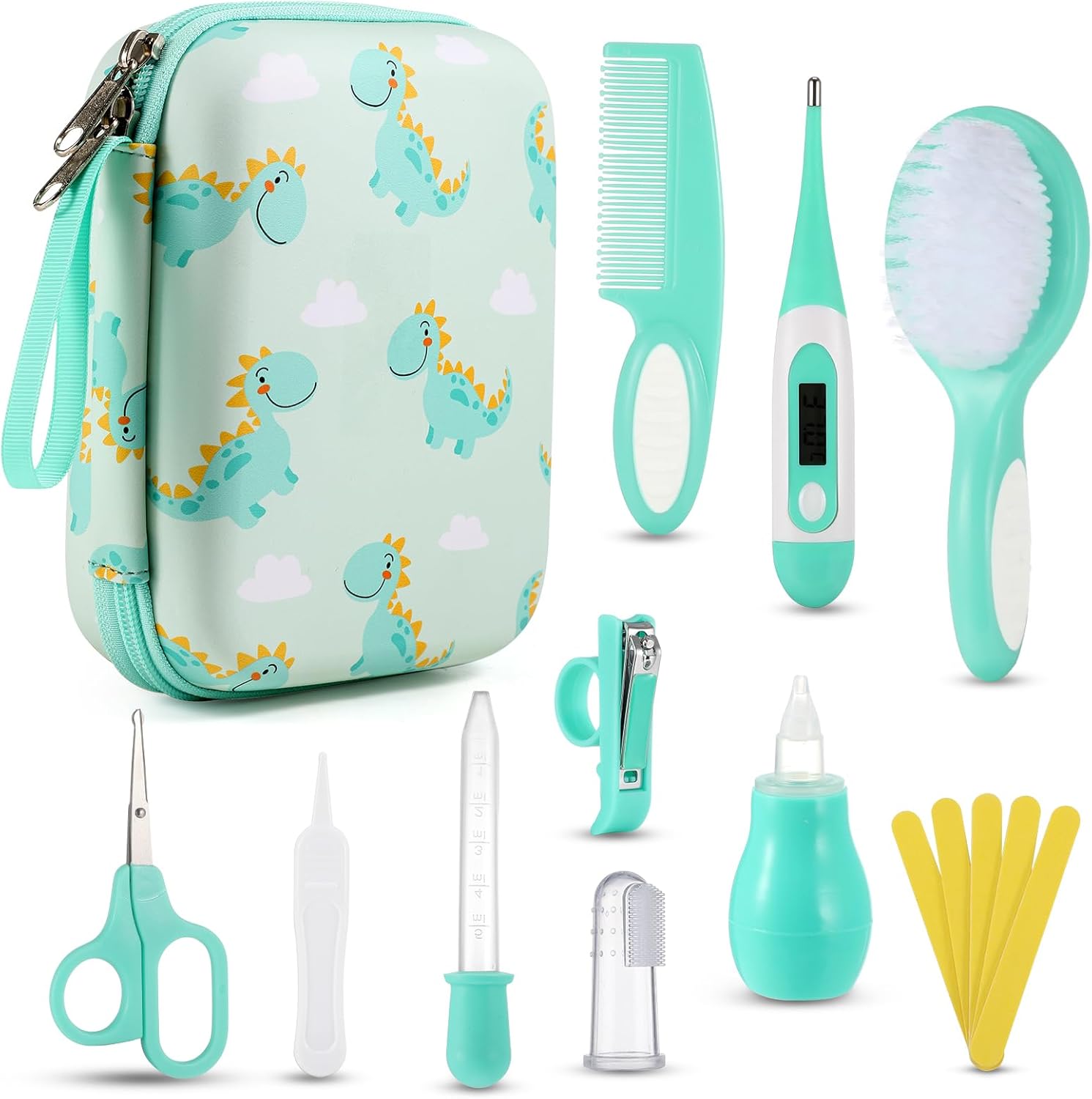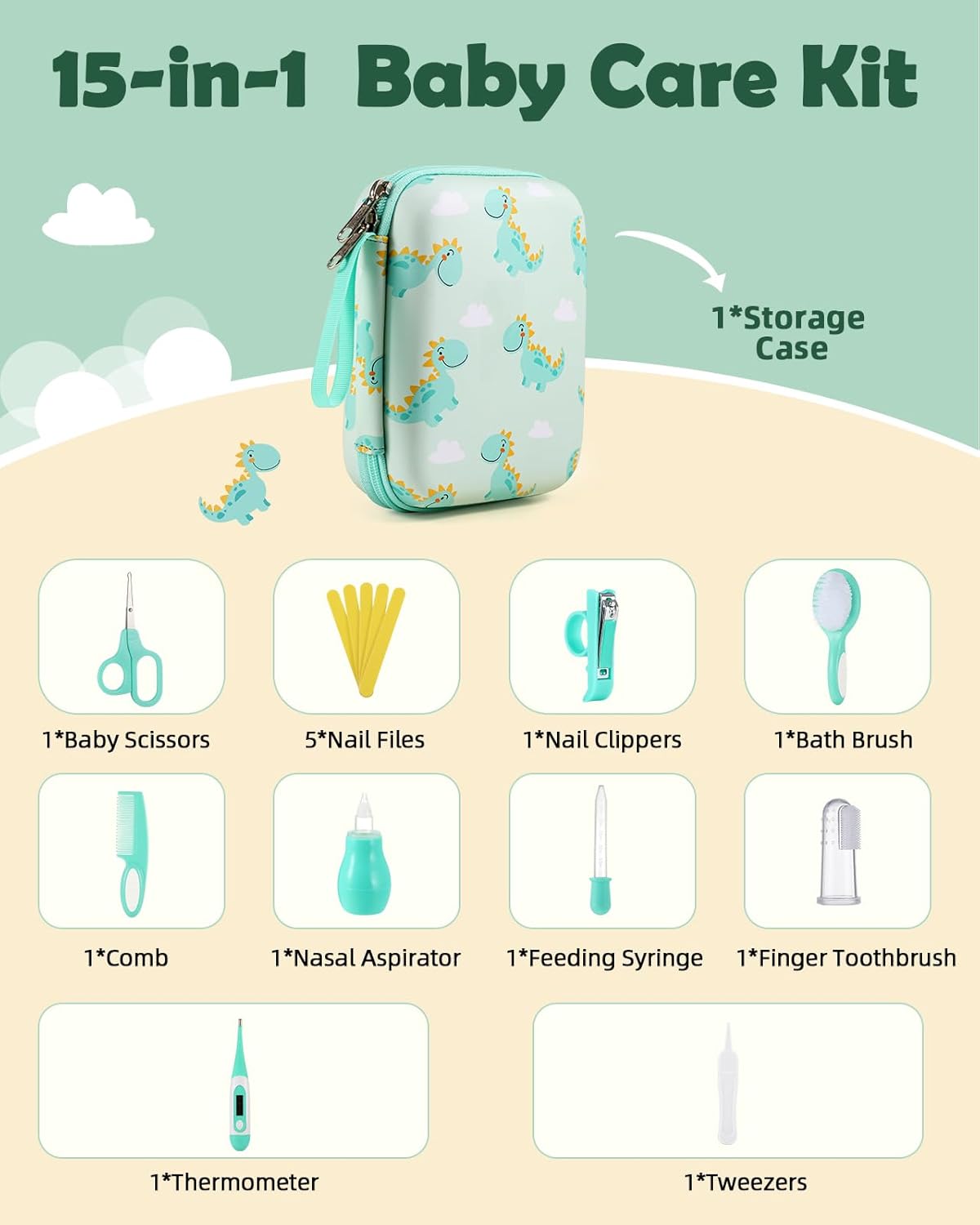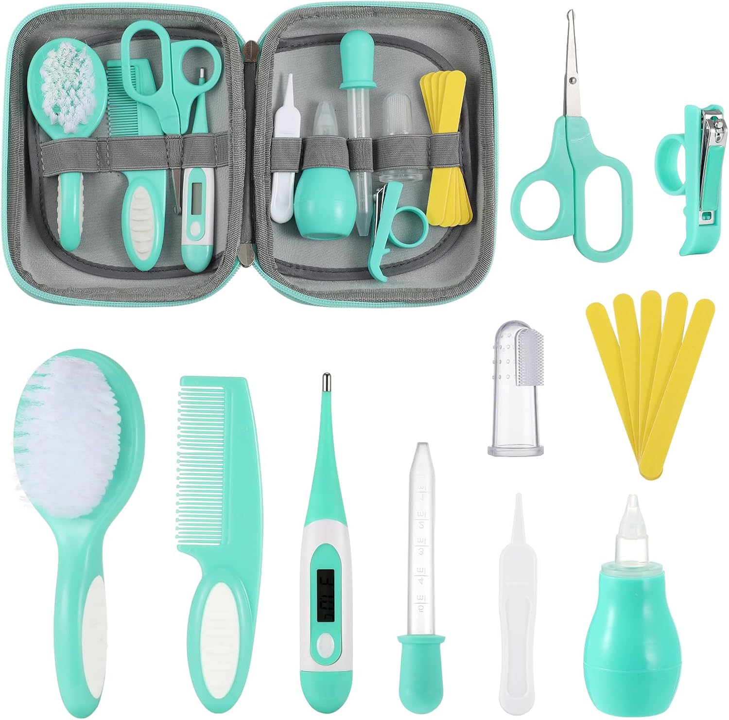 - 15 in 1 Baby Kit - Lilian&Gema baby grooming kit contains nail clippers, round-tip scissors, nail files, baby brush, baby comb, tweezers, nasal aspirator, feeding syringe, thermometer, finger toothbrush and portable storage bag, which can meet baby's daily healthcare needs