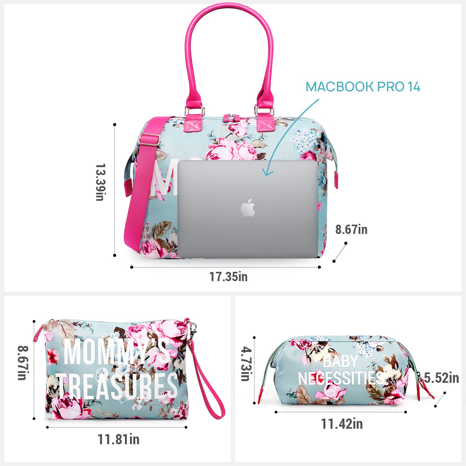 - Baby Bag with 2 Organizer Pouches: A baby bag(17.3” x 8.7” x 13.4”) which is higher 3 inches than others and 30% larger than others with a mommy's treasures bag (11.8” x 8.7”) and a baby necessaries bag (11.4”x 5.5”x4.7”). You can hold whatever you want