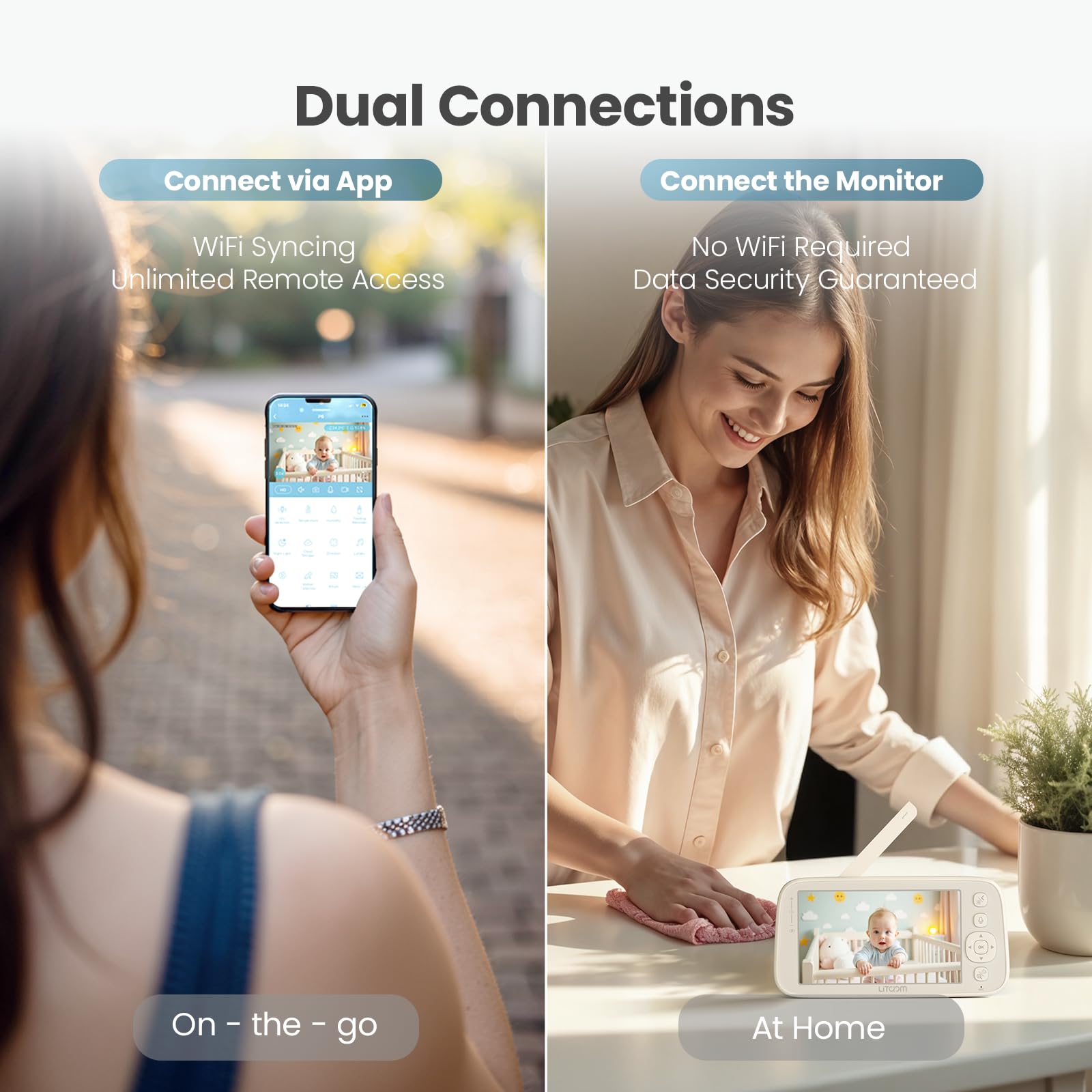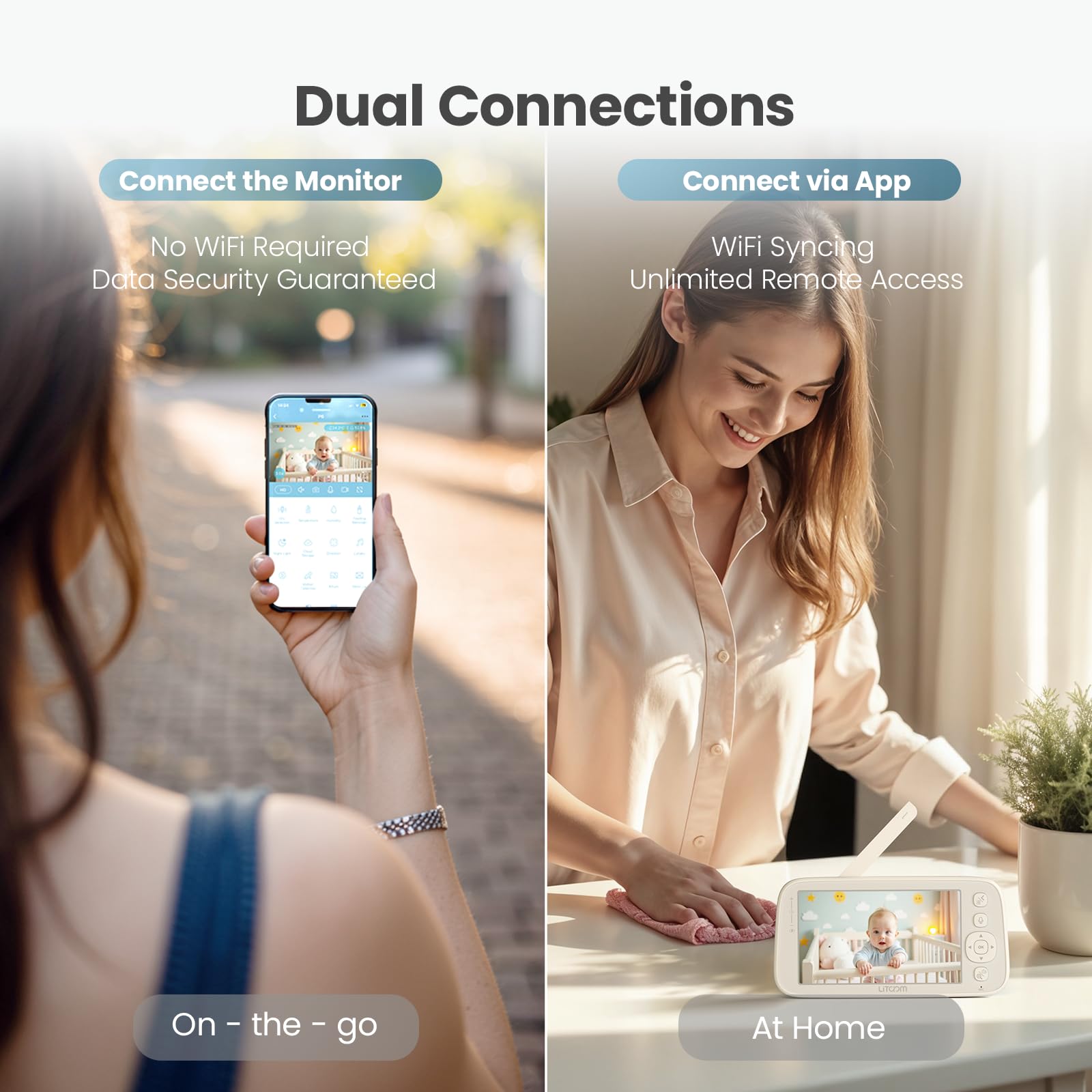 - [1080P Split Screen & 4MP Camera APP Dual Control] litokam video baby monitor supports dual cameras with 5-inch 1080p resolution high quality color LCD screen and 4MP camera, Monitor can be paired with up to 4 cameras, no wifi required for data security; When you go out to work, you can watch or remotely control the wifi baby monitor via mobile app ( 2.4G/5G WiFi), ideal for multiple kids or multi-room monitoring.