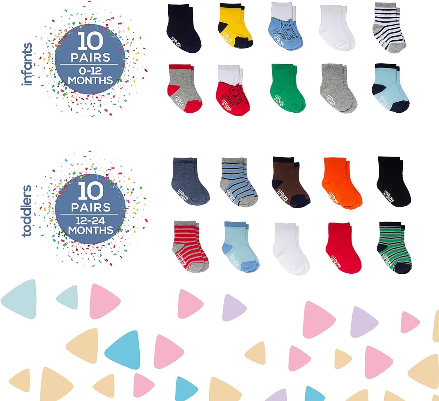 Assorted Size Pack: This 20 pack of soft ankle baby socks includes 10 pairs in size 0–12 months & 10 pairs in size 12–24 months, so your newborn can wear them until they are an infant & toddler. Giving you enough socks to cover your baby's feet from 0, 3, 6, 9, 12, 18 & 24 months