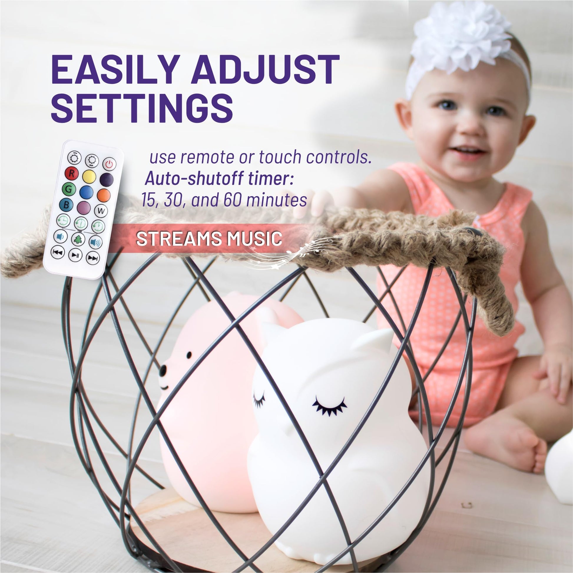 - Soothe your children and lull them to sleep with an adorable LumiPet! Each friendly bedside nightlight has the option of shining with nine different soft colors, including red light for optimum sleep. Brightness level is adjustable with the included remote. The built-in speaker system allows you to stream your child's favorite music from your phone or mobile device directly into their room, no matter where you are.