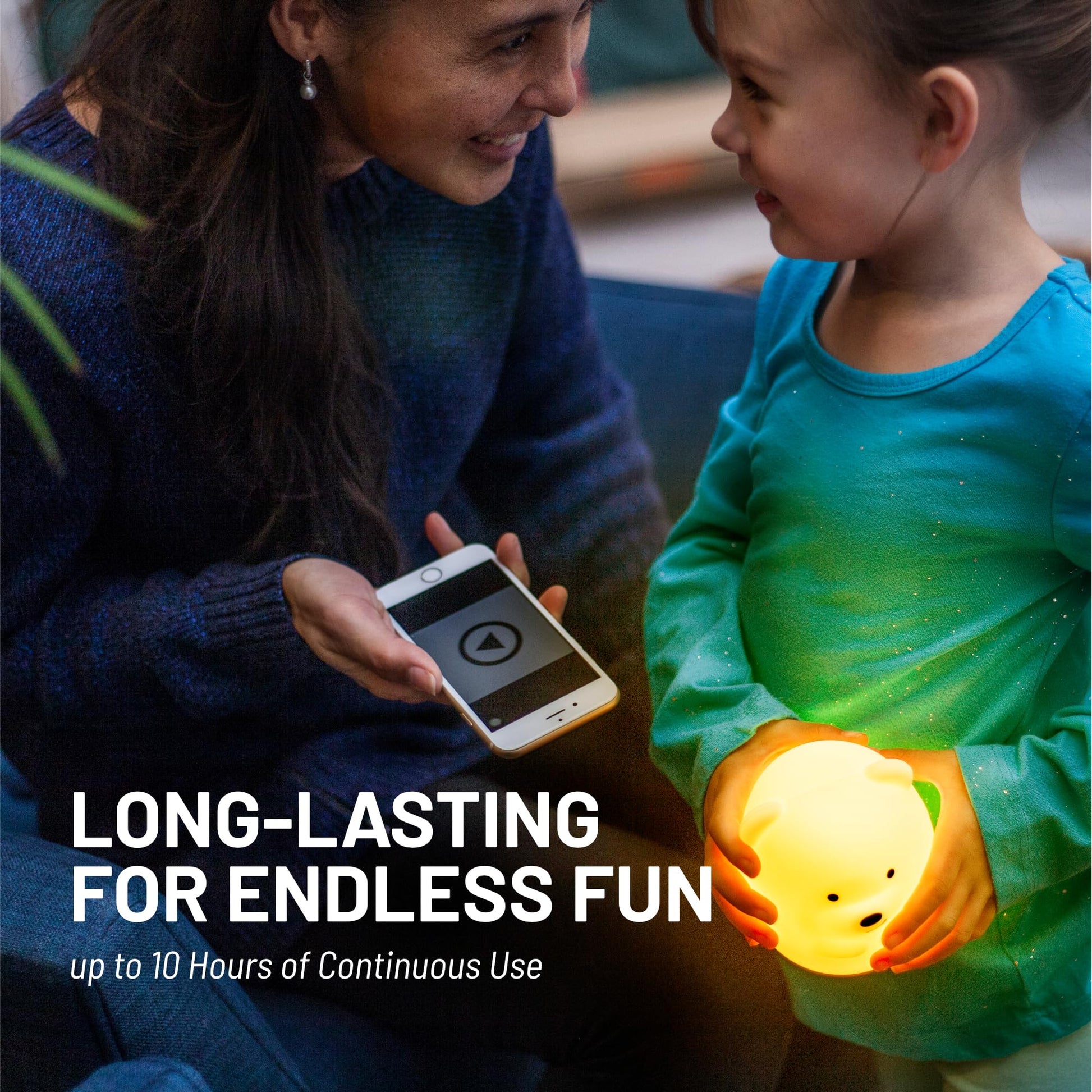 The LumiPet bedtime lamp with built in speaker will stay on for up to 10 continuous hours after being charged via USB. Leave it on at night, either plugged or unplugged, and set a 15, 30 and 60 minute timer to turn it off during the night and extend battery life. This bedtime nightlight is great for traveling, making it a great companion for your little one.
