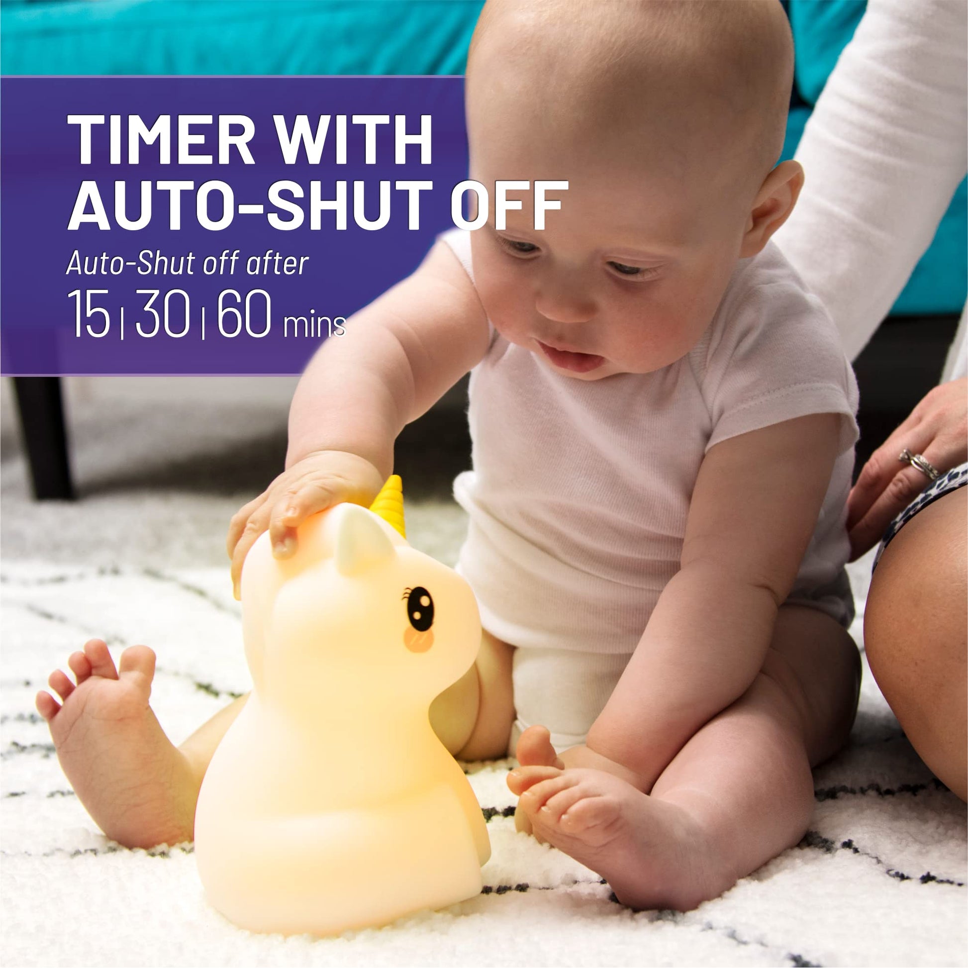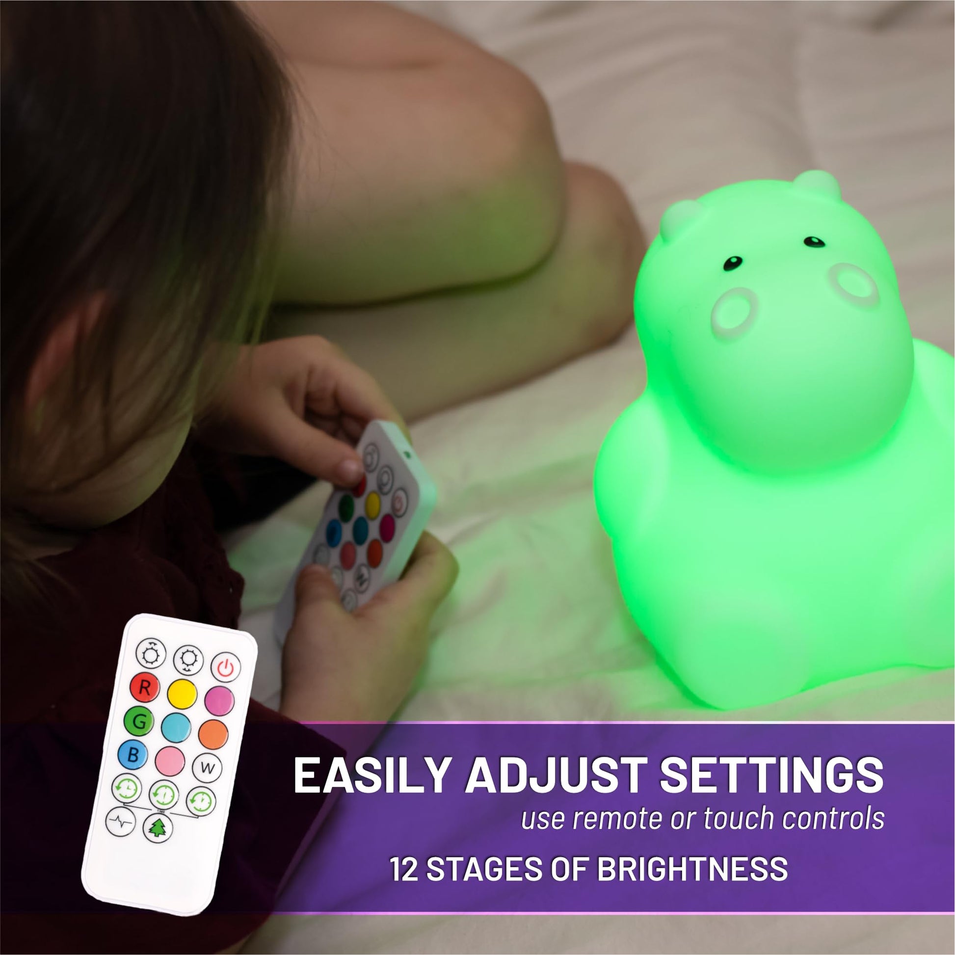 - Remote Control Operated Night Light For Kids - The included remote control lets your child choose colors remotely, or press firmly on the squishy light to cycle through them. The timer has three options for auto-shutoff: 15,30, or 60 minutes.