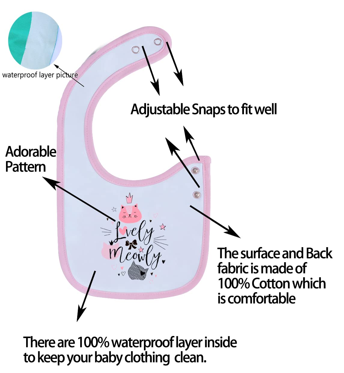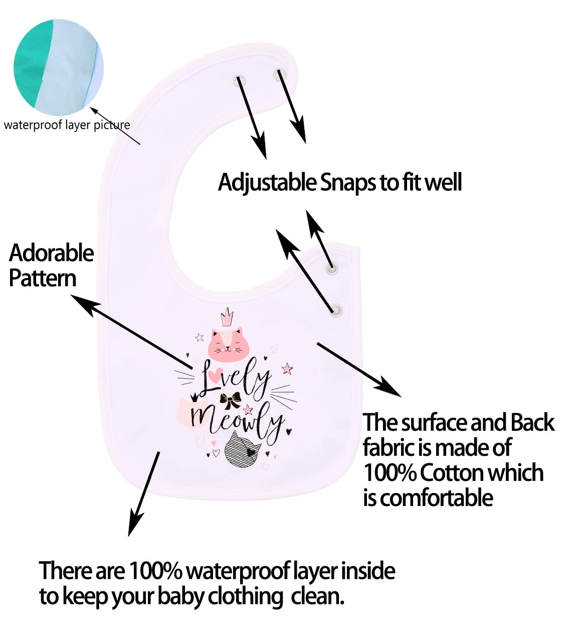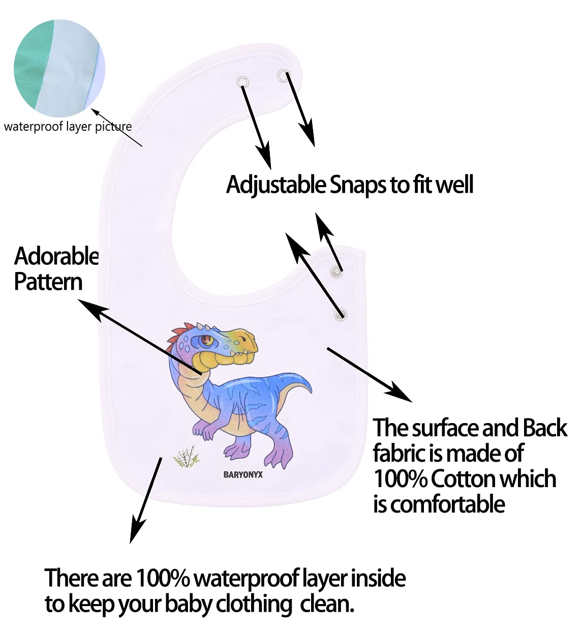 - 1.Waterproof baby cloths bibs:Our products use three-layer design.The upper and lower layers of the product are made of pure cotton.The middle layer is made of TPU waterproof material.It can make sure that the product is 100% waterproof.You don’t have to worry about getting your baby’s clothes dirty also no need to constantly change drool bibs