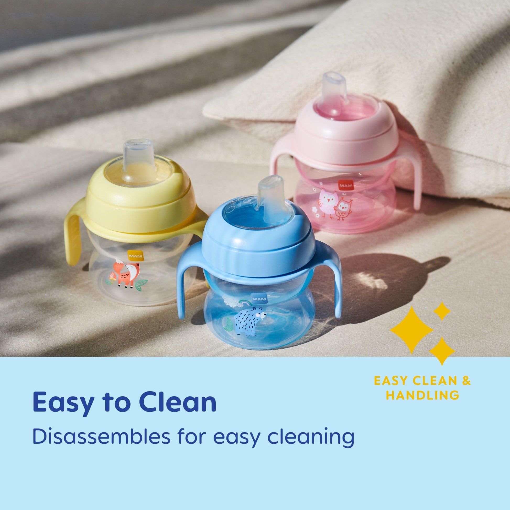 - SPILL-FREE EXTRA-SOFT SPOUT – Our MAM sippy cups for toddlers feature a spill-free extra-soft spout to help babies learn the transition from sucking to drinking