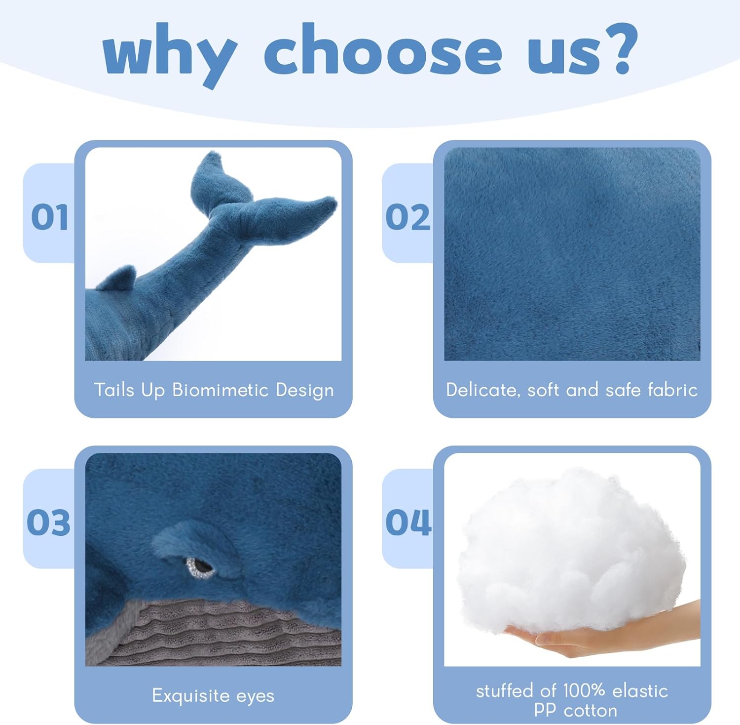 - Not Just A Plush: Our 43.3"/4 Feet stuffed whales are not only about plush toys. It's a new family member that brings sunshine into the life, a great companion for kid's playtime. Choose this big blue whale for that special someone in the sweet and precious moment, cute gifts make everyone happier than ever.