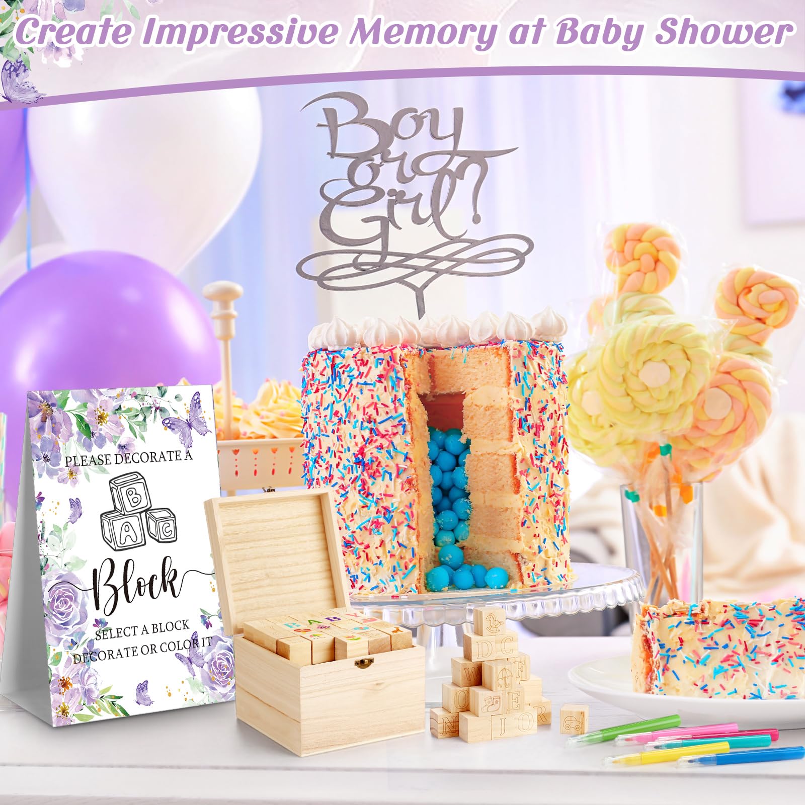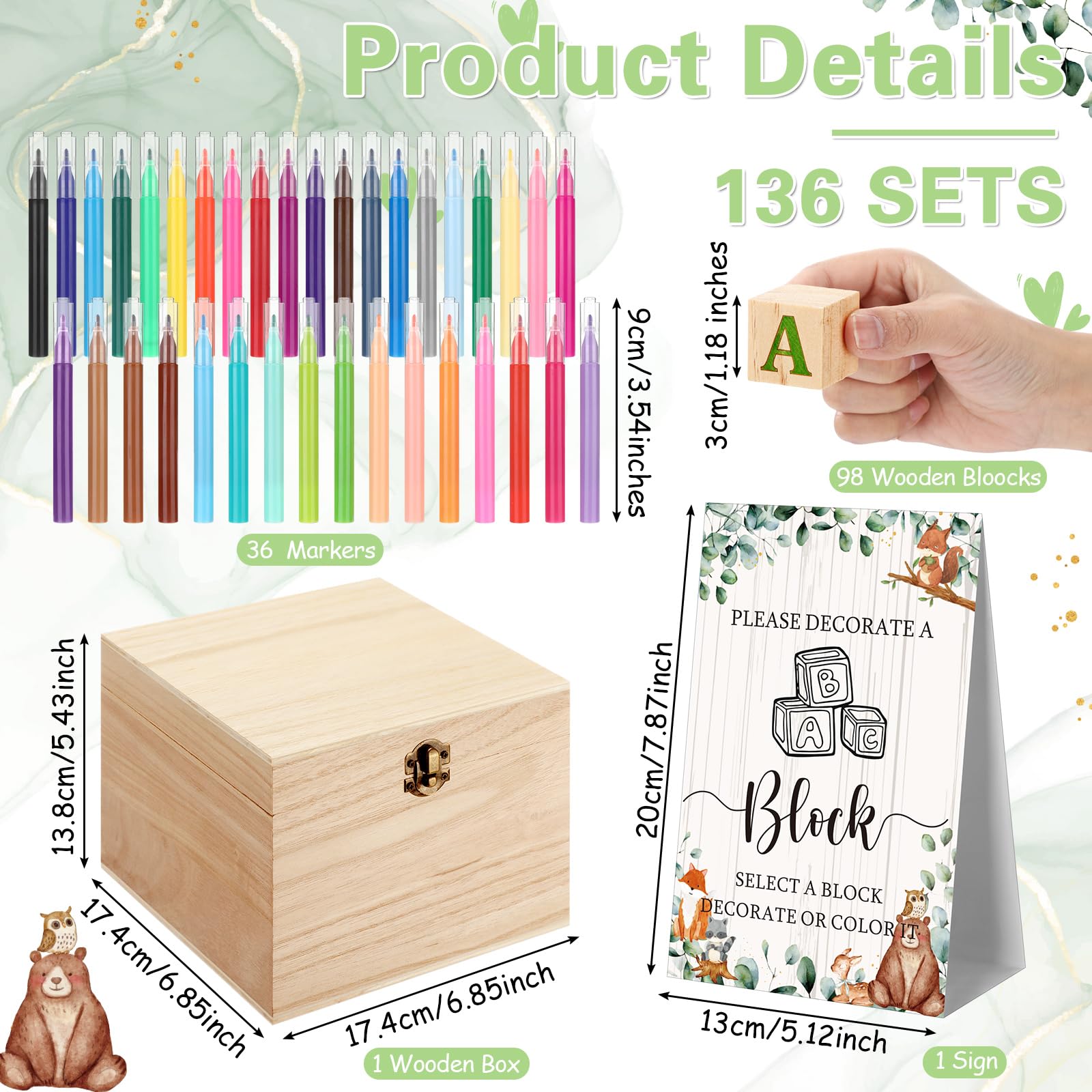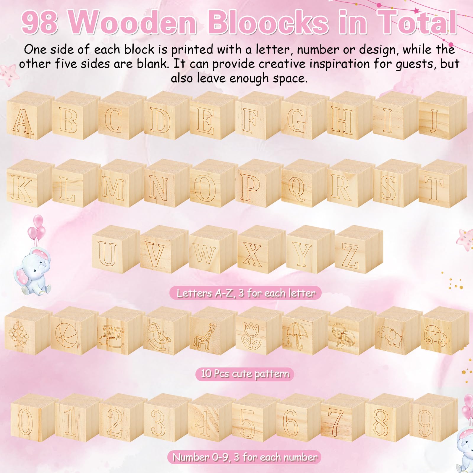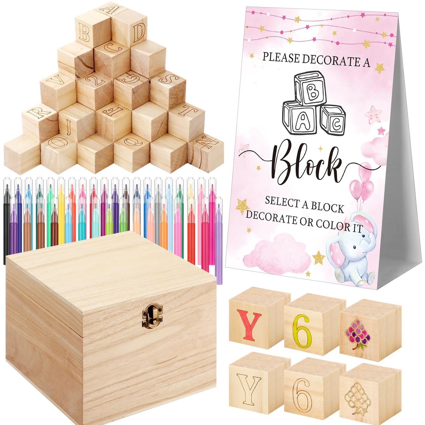 - Funny Baby Shower Games Set: our baby shower blocks kit includes 98 wooden blocks featuring 3 sets of 26 alphabets, numbers 0-9, and 10 patterns; It also comes with 1 game sign, 36-color acrylic markers and a wooden box, Suitable for baby showers and gender reveal parties