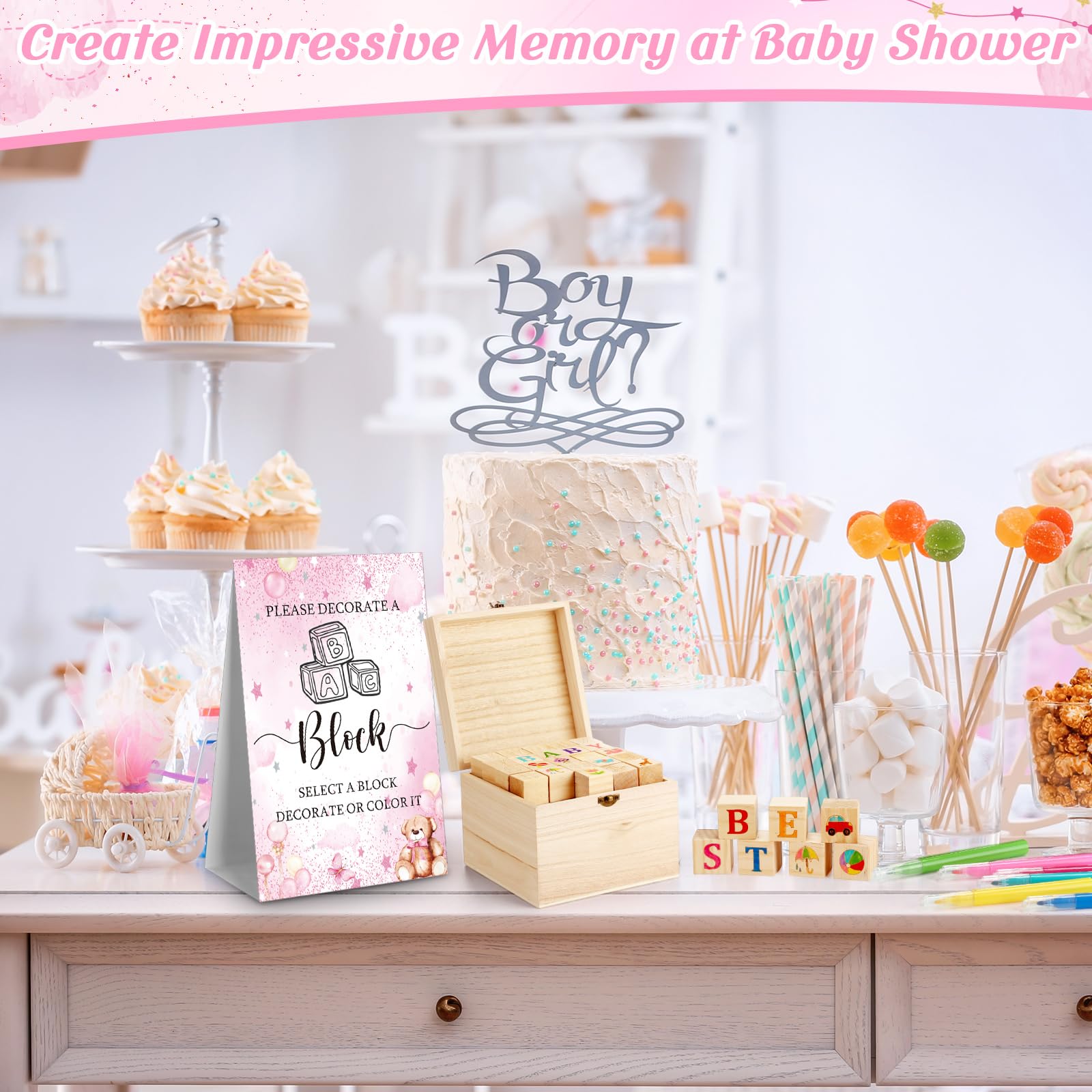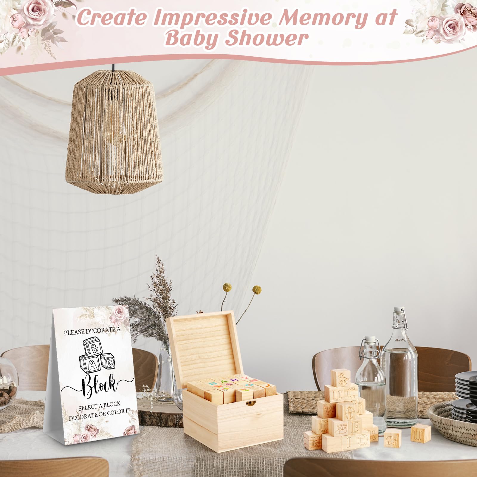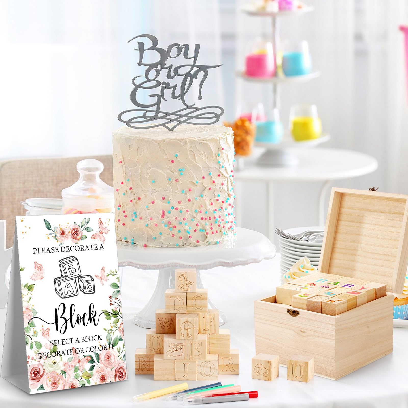 - Funny Baby Shower Games Set: our baby shower blocks kit includes 98 wooden blocks featuring 3 sets of 26 alphabets, numbers 0-9, and 10 patterns; It also comes with 1 game sign, 36-color acrylic markers and a wooden box, Suitable for baby showers and gender reveal parties