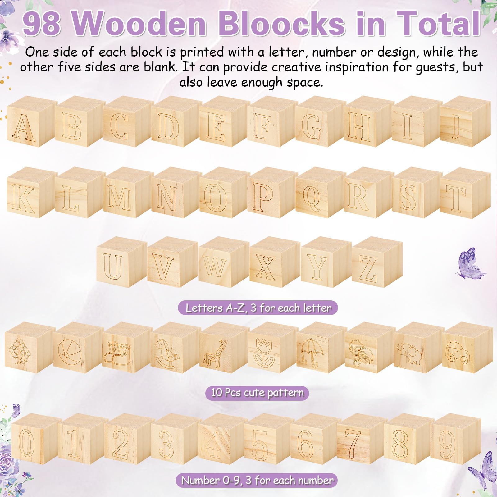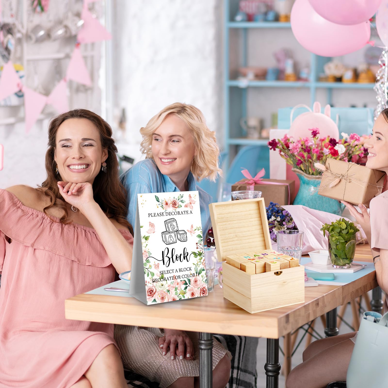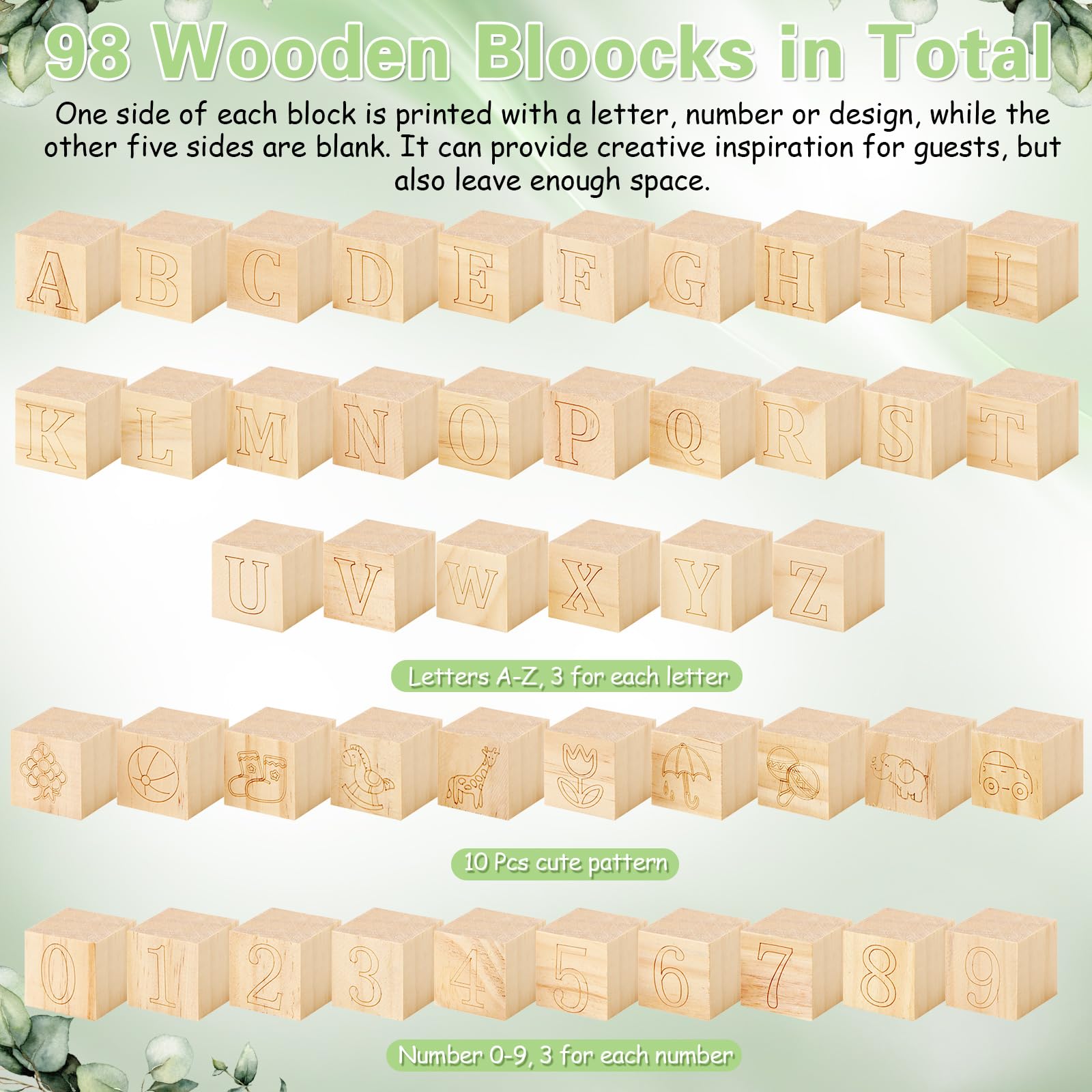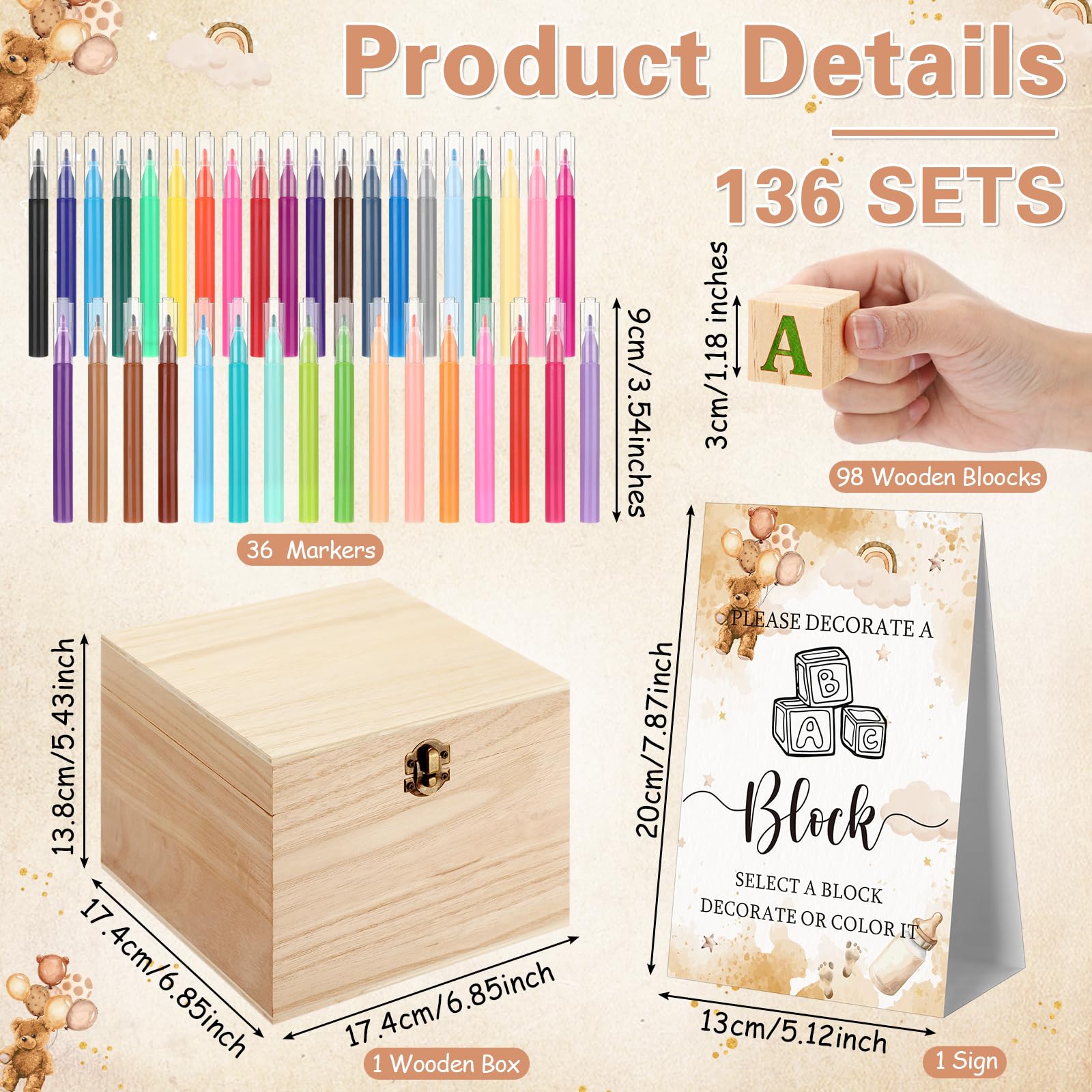 - Funny Baby Shower Games Set: our baby shower blocks kit includes 98 wooden blocks featuring 3 sets of 26 alphabets, numbers 0-9, and 10 patterns; It also comes with 1 game sign, 36-color acrylic markers and a wooden box, Suitable for baby showers and gender reveal parties