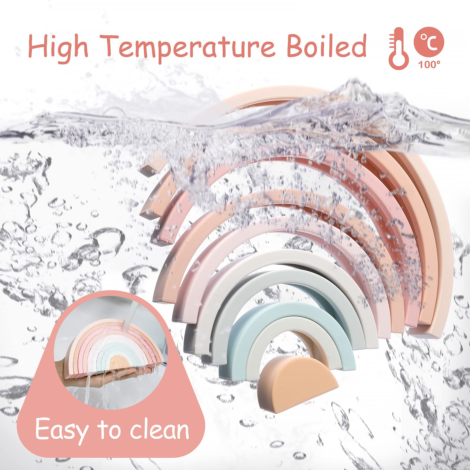 The silicone rainbow stacker also easy to clean. You can wash it with water or soapy water,Or wipe with a damp paper towel