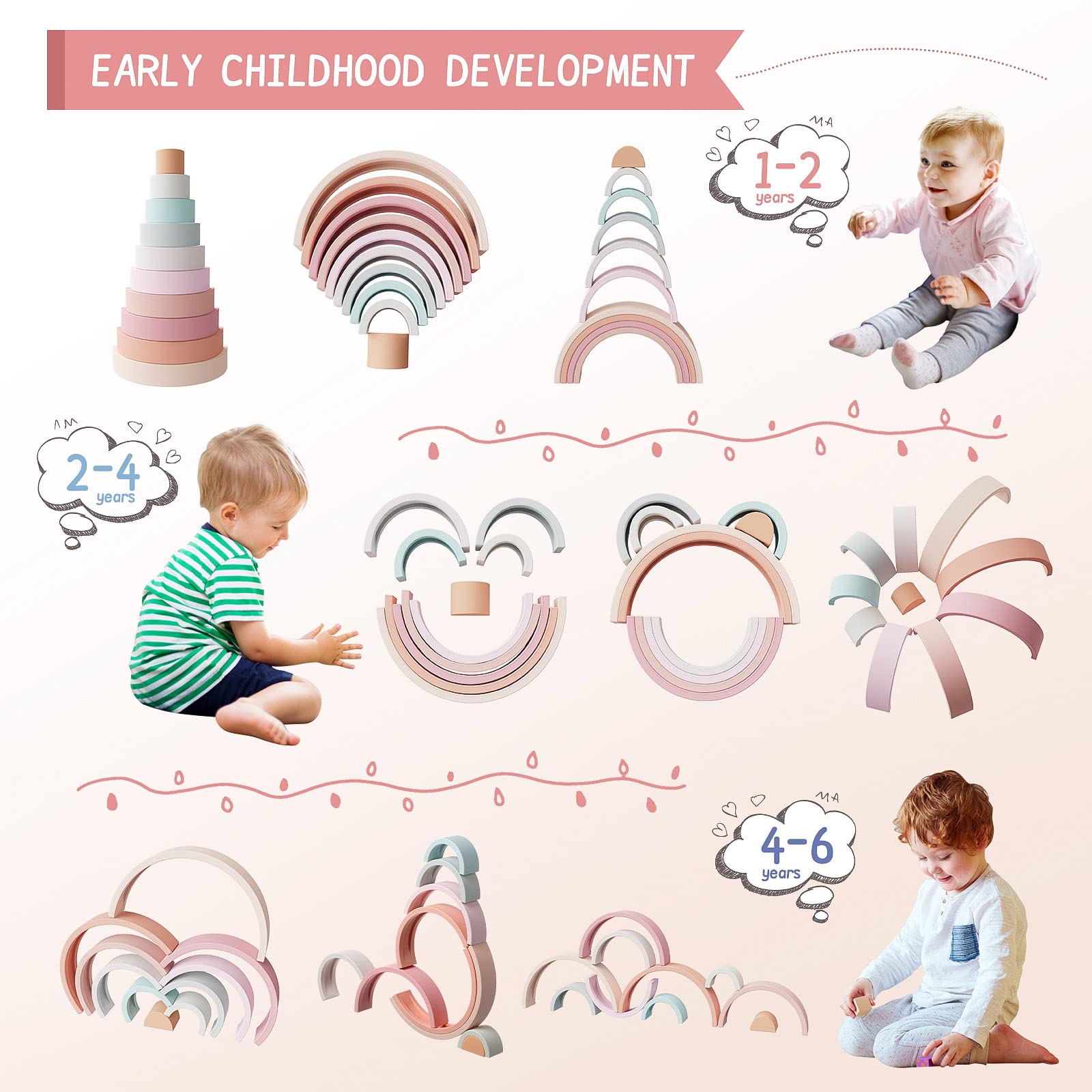Our Rainbow stackers are made of 100% food-grade silicone, it's safe, flexible and long-lasting, and safer for kids.