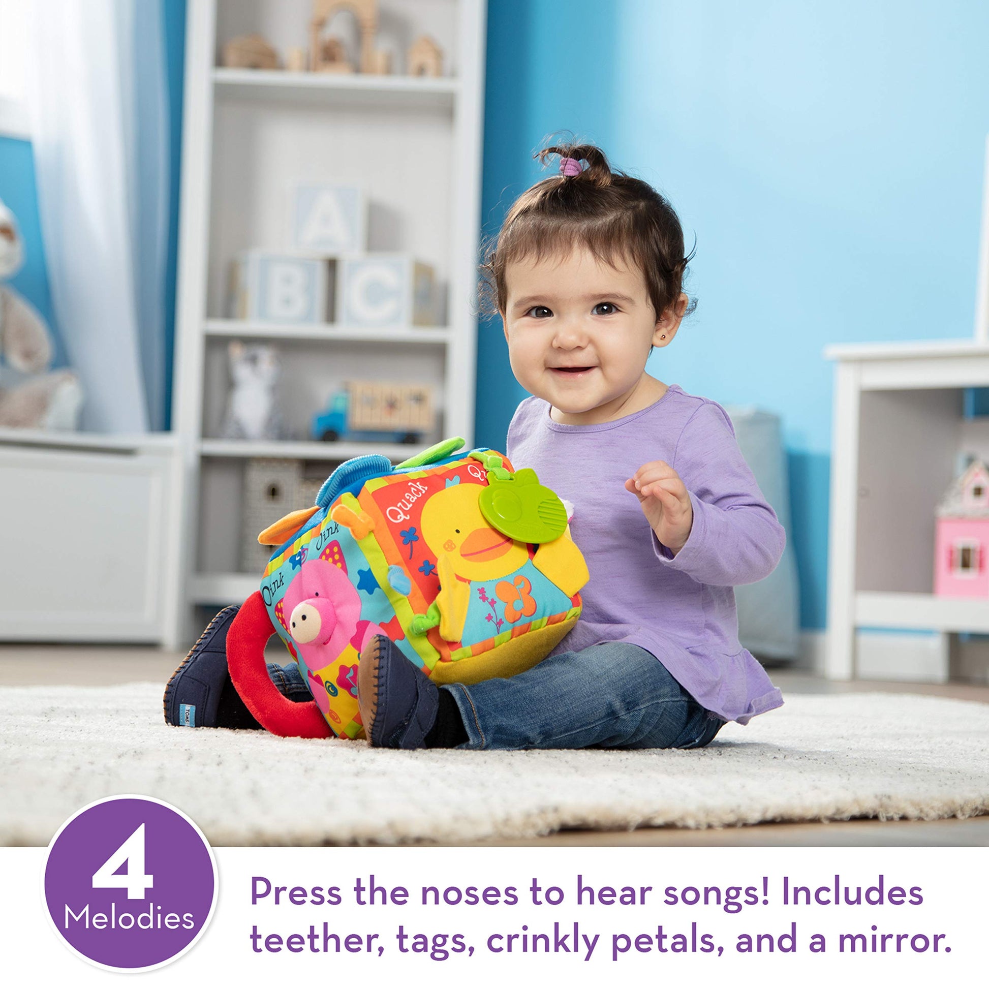 This "farmyard" is full of noisy animals and compact enough to take anywhere! Four animals sound off with their animal songs and play a lively melody when their noses are pressed. Or babies can grasp the padded handle and bump the block against the floor to start the sounds! This feature-filled activity cube also boasts a sturdy textured ring, knotted tags, crinkly flower petals and tabs, and a toddler-tough plastic mirror.