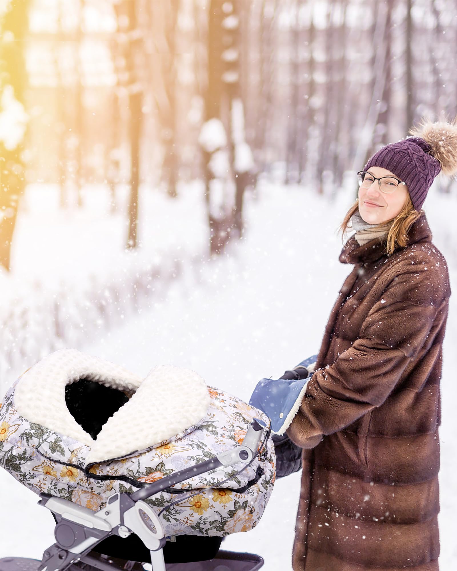 Winter infant car seat covers are perfect for outdoor trips with your little baby in cold weather. Our soft, warm cover features elastic edges that secure to any car seat and stroller, and a plush fabric framing baby's head in the cover's collar section. The collar can be opened or closed for flexible temperature control. The flap allows easier access to the baby and is zipped up to minimize outside influences.