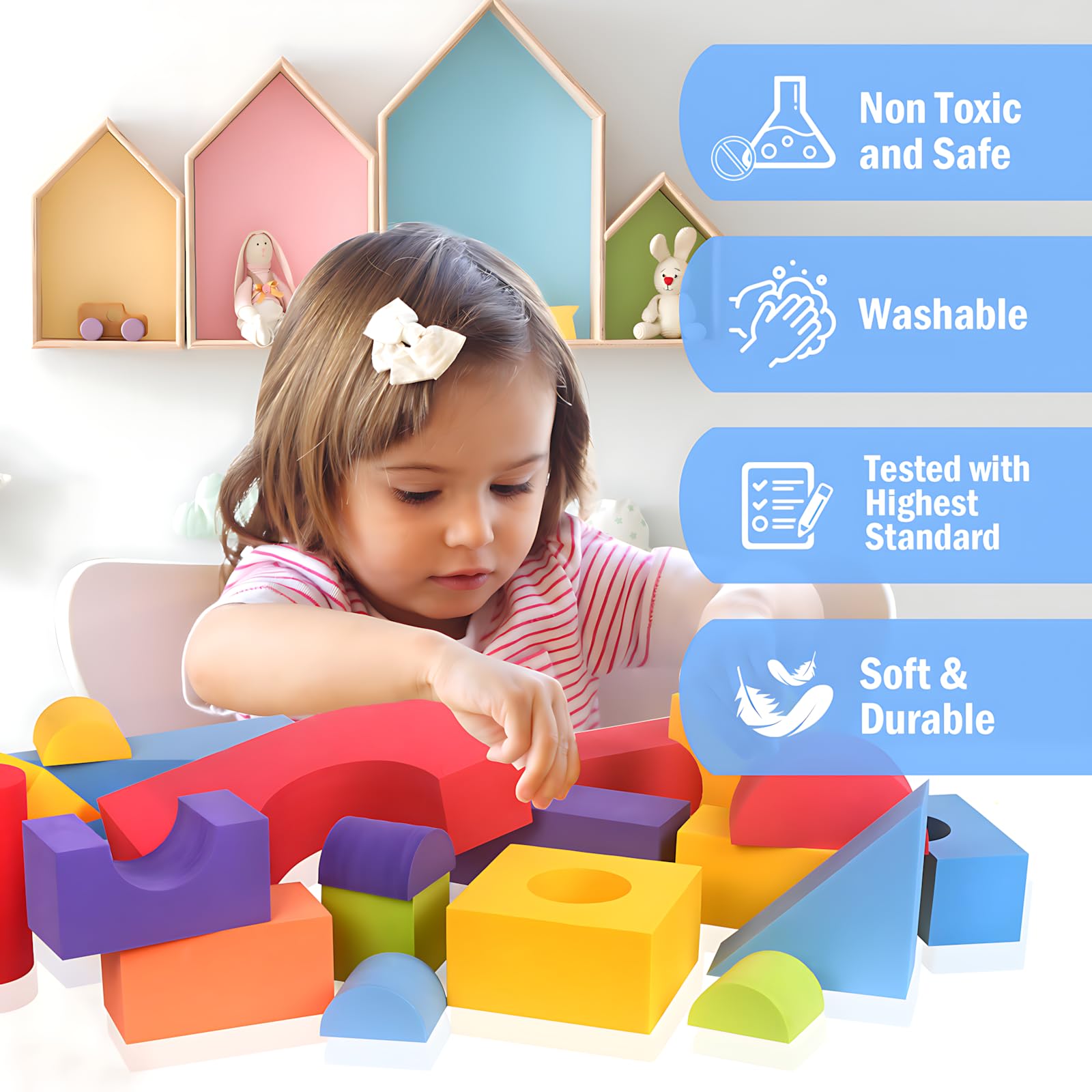 Non-toxic materials. Soft building blocks for kids, tested to highest safety standards. Montessori preschool toy, ideal for birthdays, holidays, indoor play & play dates.
