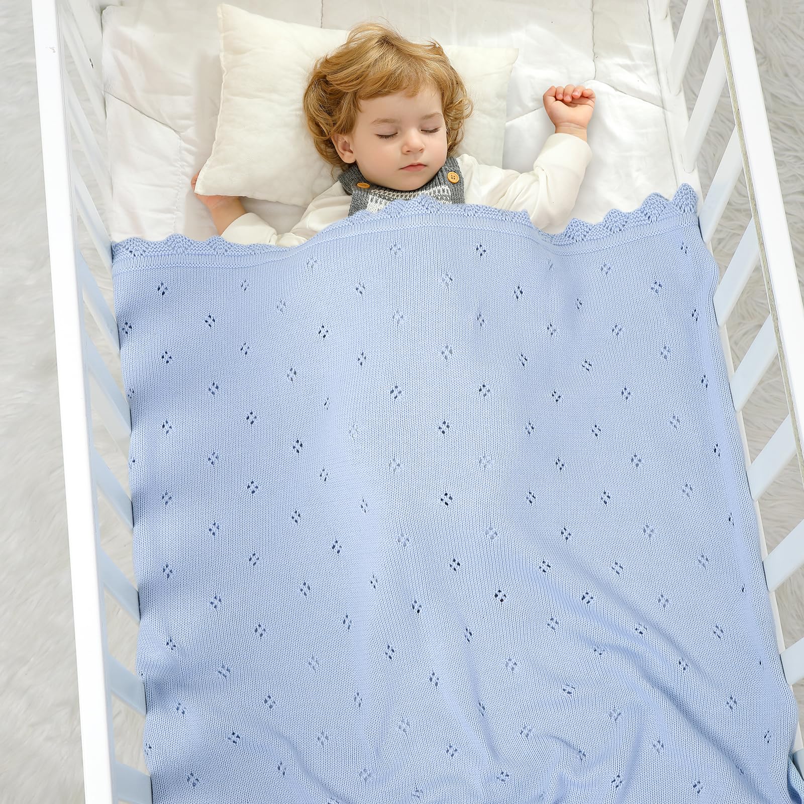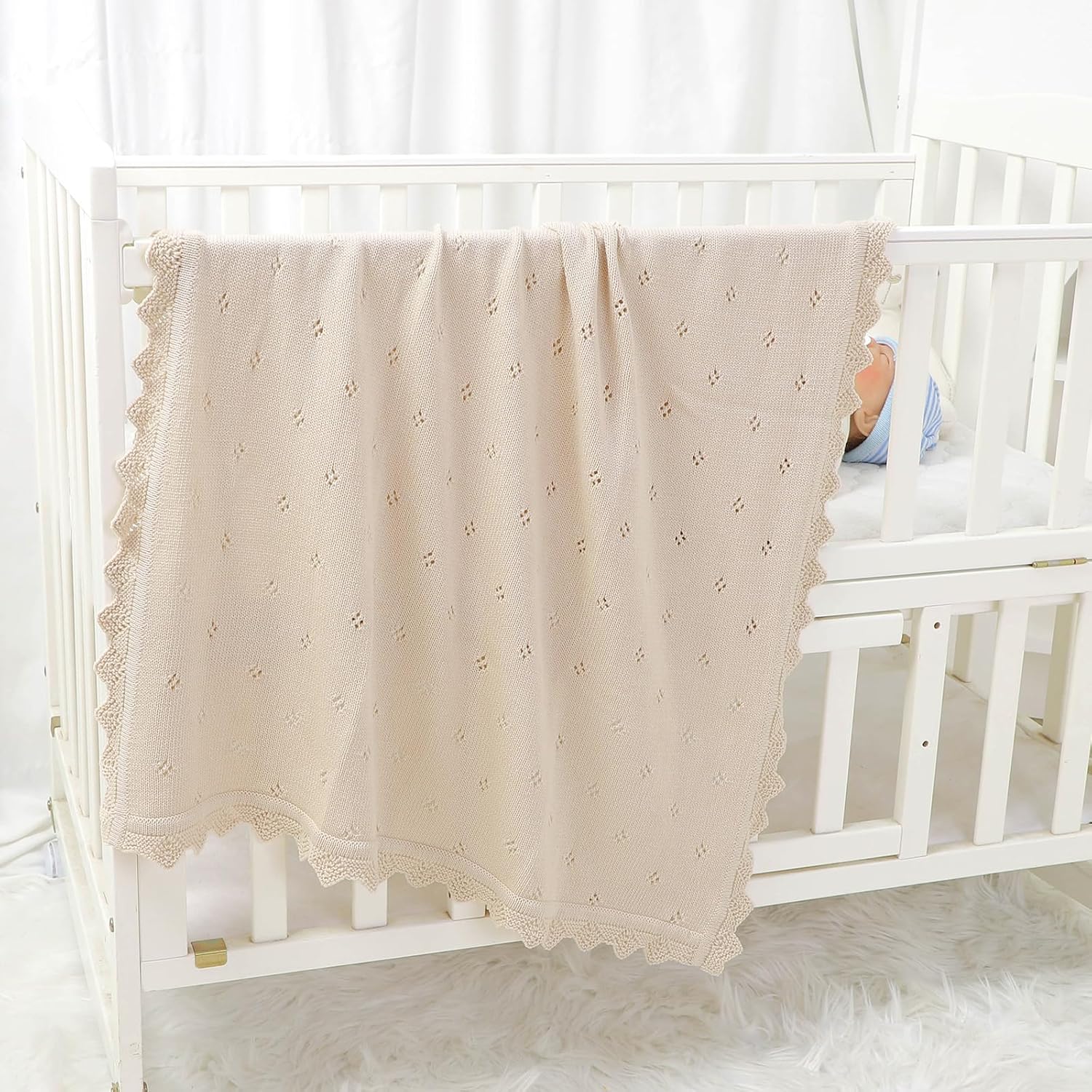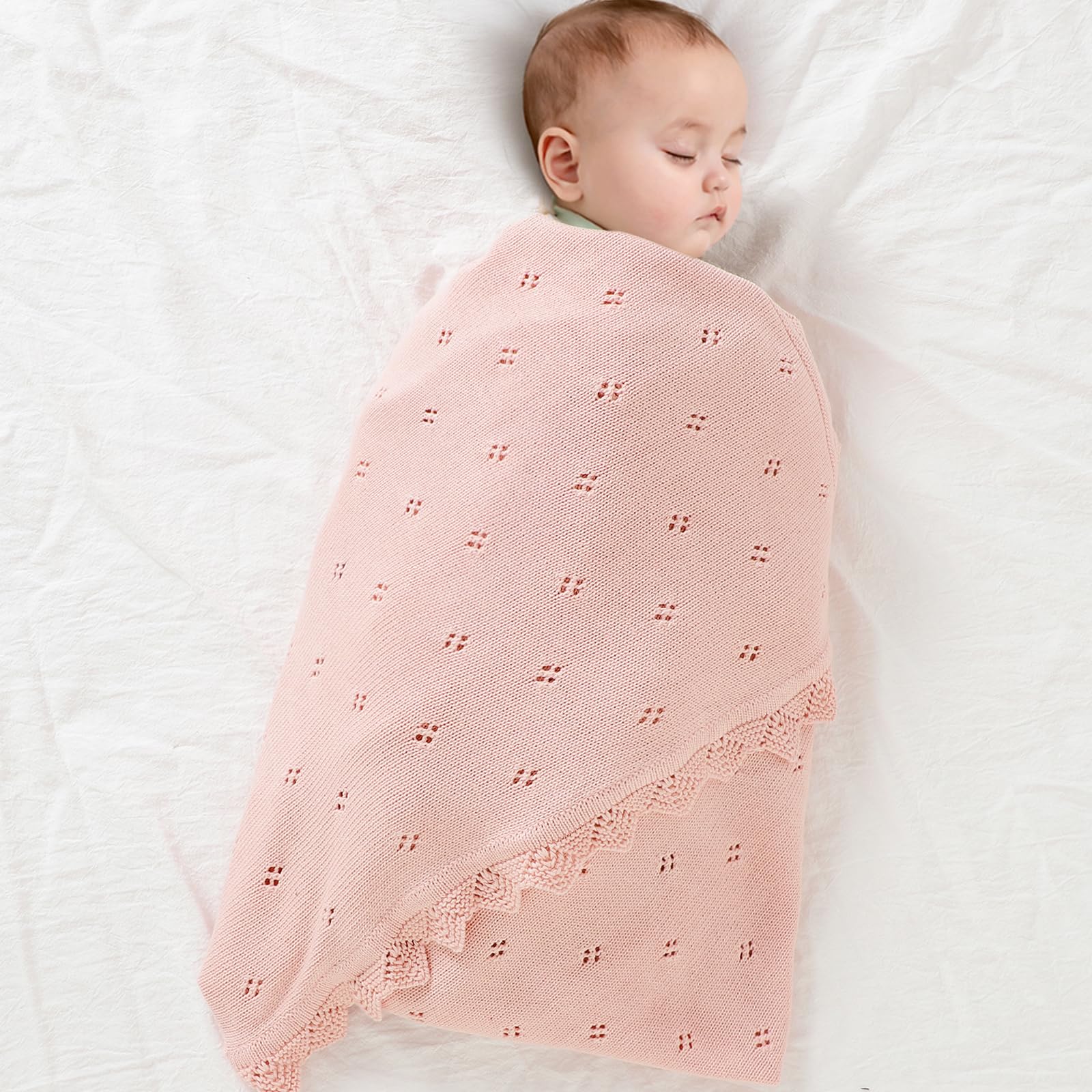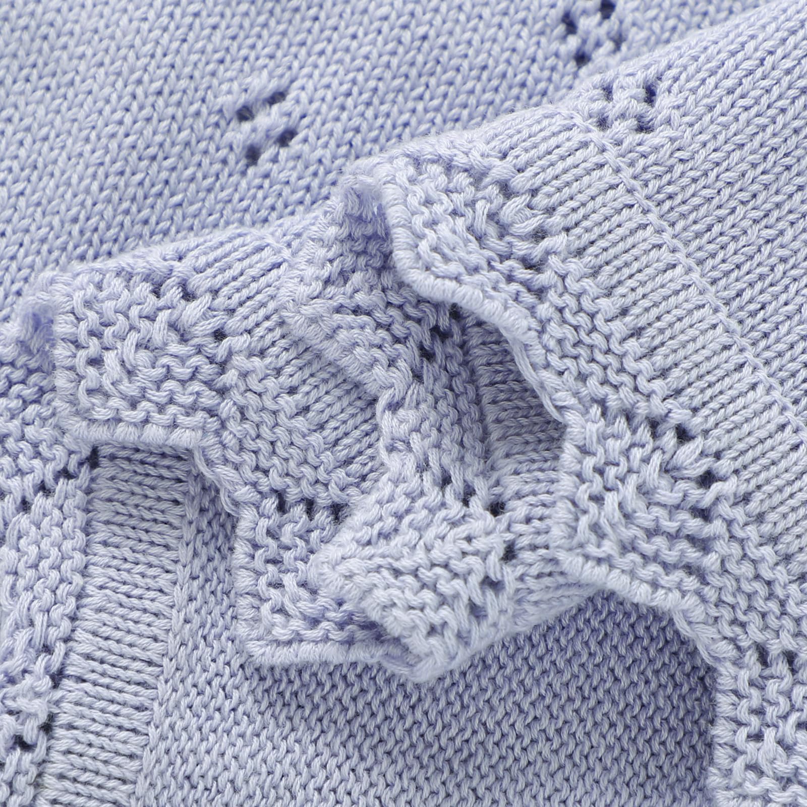 - Style:baby blanket that feels soft and high quality. It is tightly woven and has a bit of weight to it, while still remaining flowy with a nice drape and the periodic holes ,just in case of suffocation risk.
