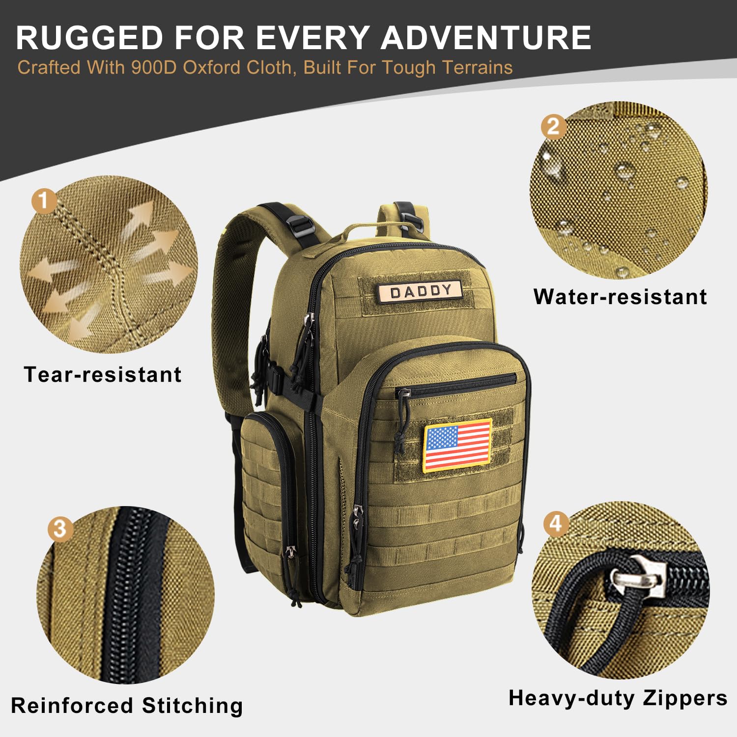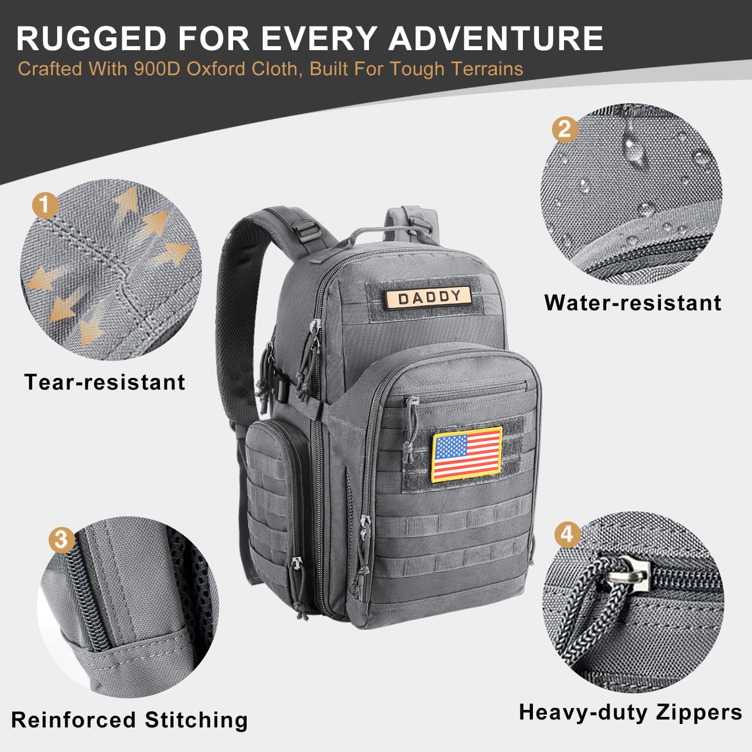- Built for Dad for Any Mission: Tough & tactical design for active dads, this military-grade, water-resistant backpack features heavy-duty 900D polyester for long-lasting durability on hikes, travels, and daily adventures. Reinforced zippers ensure smooth, snag-free use every time.