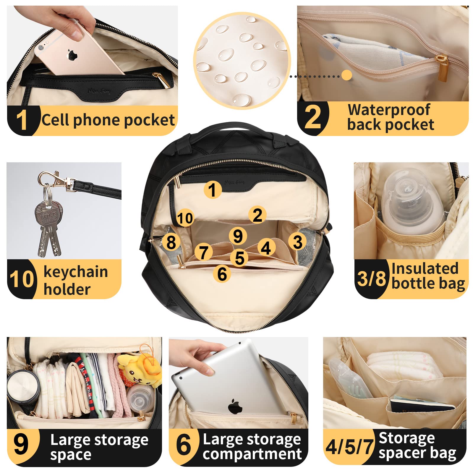 miss fong Diaper Bag Backpack Baby Diaper Bag for baby boy and girls, Leather Baby Bag with 13 diaper bag organizing pouches, Changing Pad, Stroller Straps and 4 Insulated Pockets(Black)