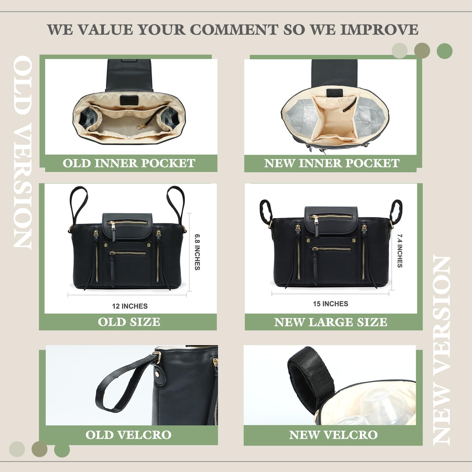 - ❤️【Stylish & Practical】The stroller caddy is designed with outer ECO PU leather and 100% waterproof nylon lining for easy cleaning. The hardware is 18K gold for a luxurious touch. Insulated bottle pockets can hold most of the baby bottle.Size-13"x5"x7.4"(LxWxH). Stroller strap(both side):12".Weight:1.3 LB. Classic & practical design makes this stroller organizer bag more fashionable. The front zipper design of the main pocket allows for easy access to baby items.