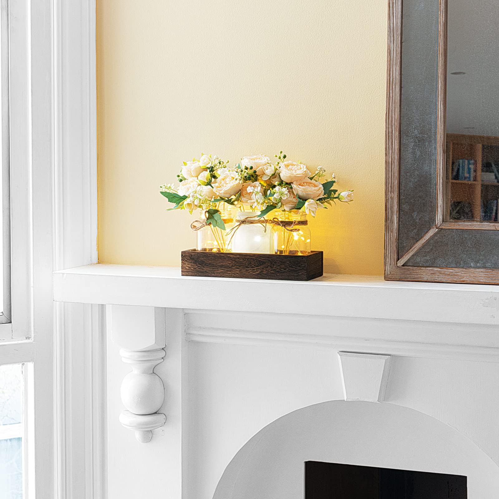 Mkono Mason Jar Lights Centerpiece Table Decor for Dining Room Farmhouse Wood Tray with 3 Jars Flowers Summer Decoration for Coffee Table Kitchen Living Room Wedding