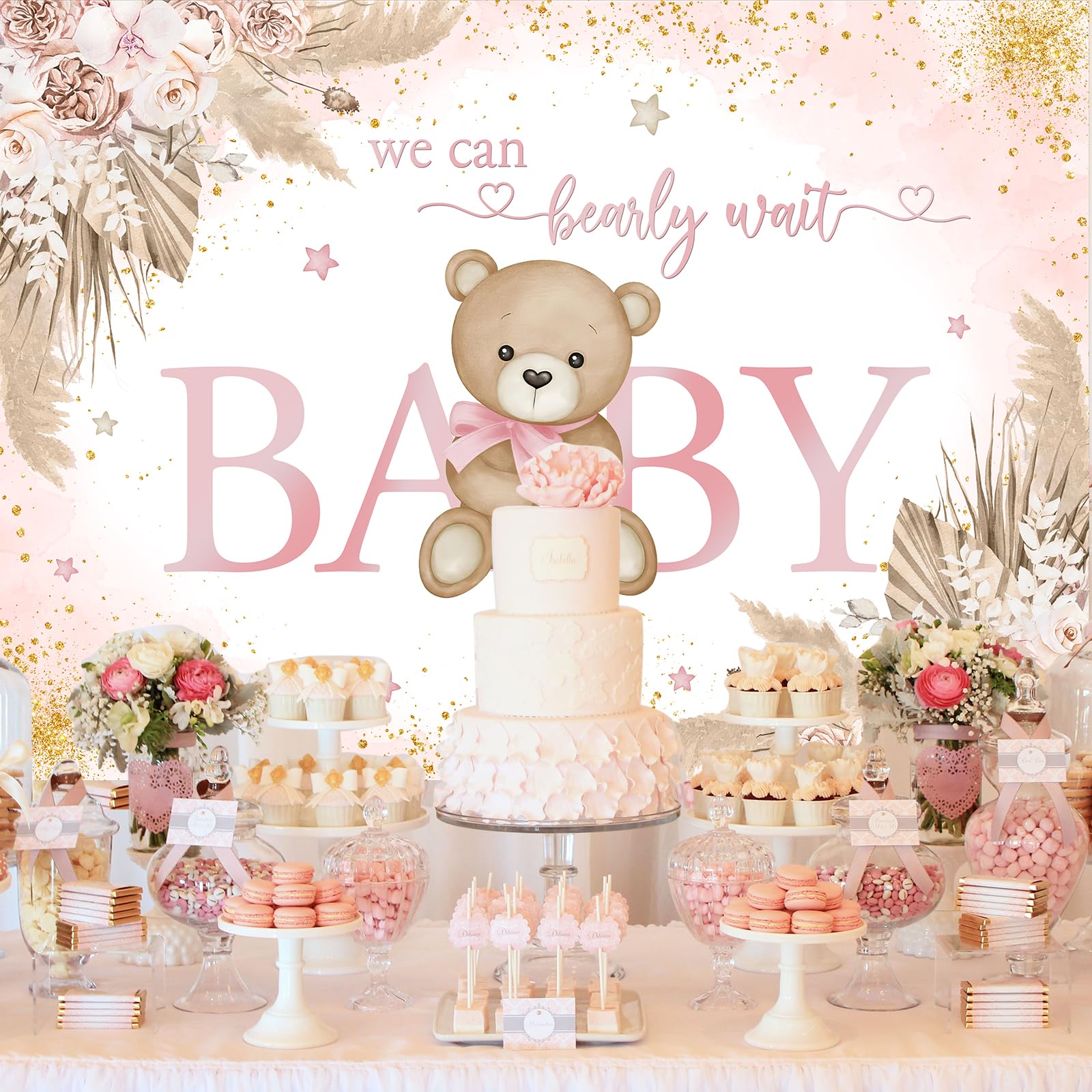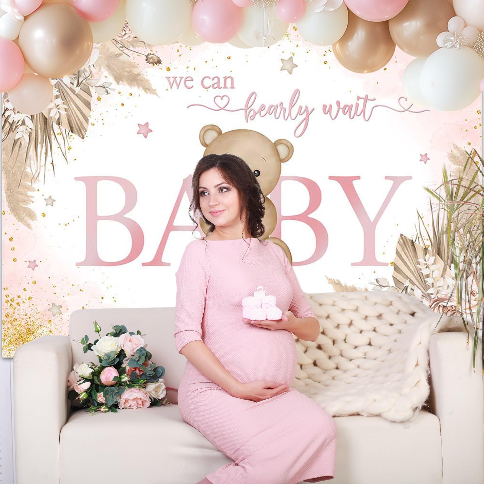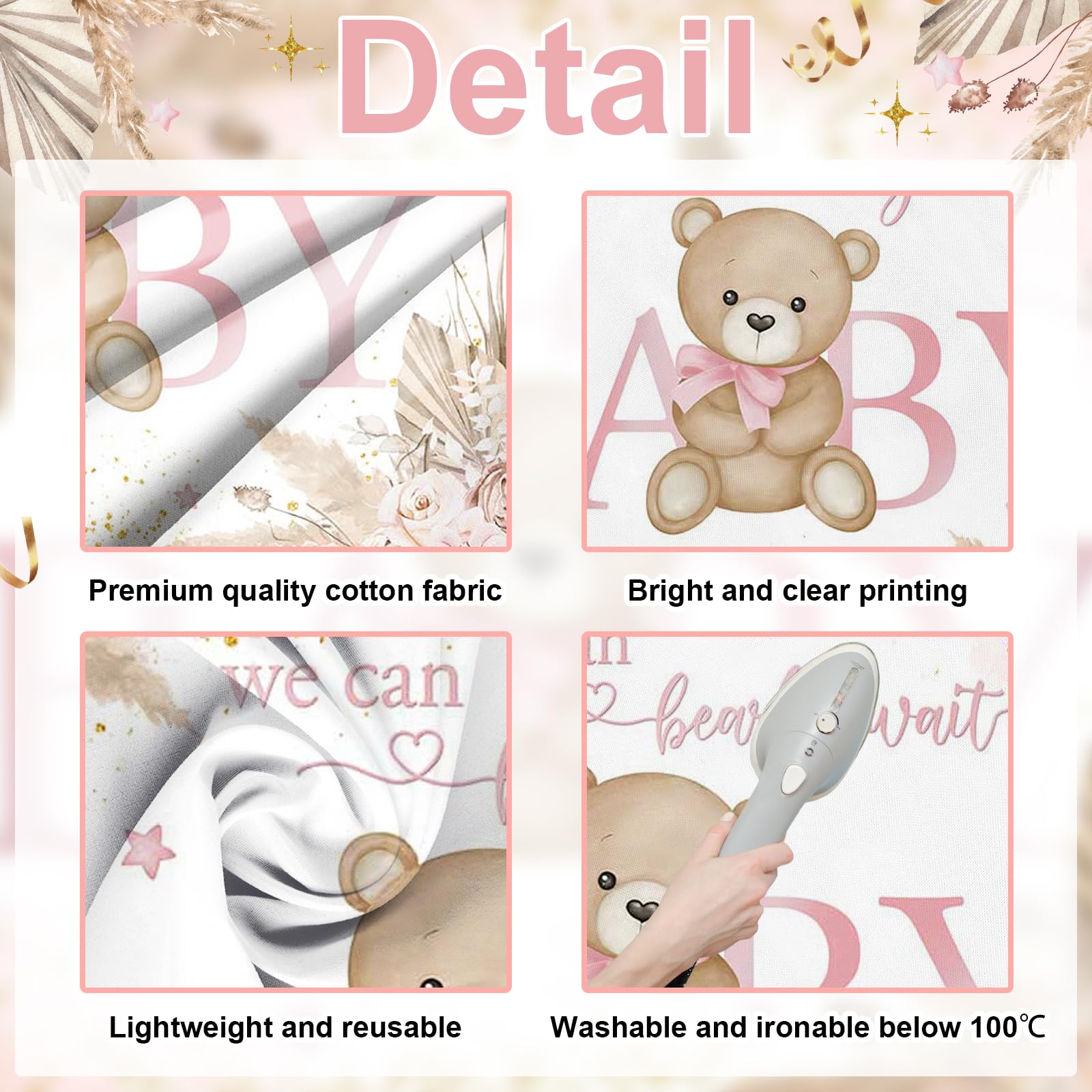 Mocsicka Girl Bear Backdrop Pink Boho Pampas Grass Background We Can Bearly Wait Baby Shower Party Cake Table Decoration Photo Booth Props (7x5ft)